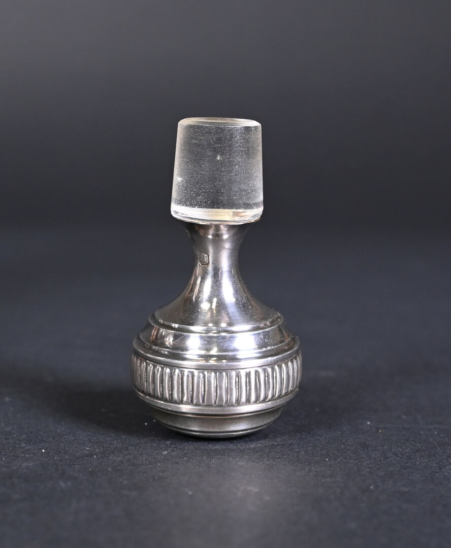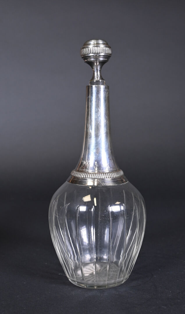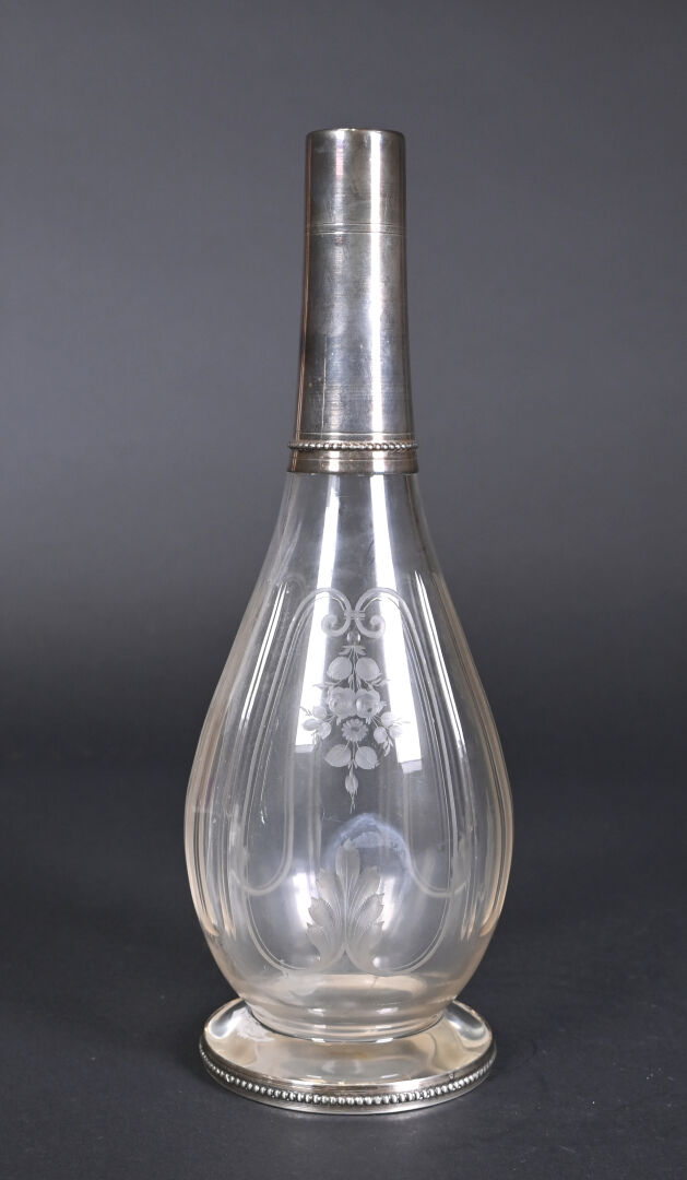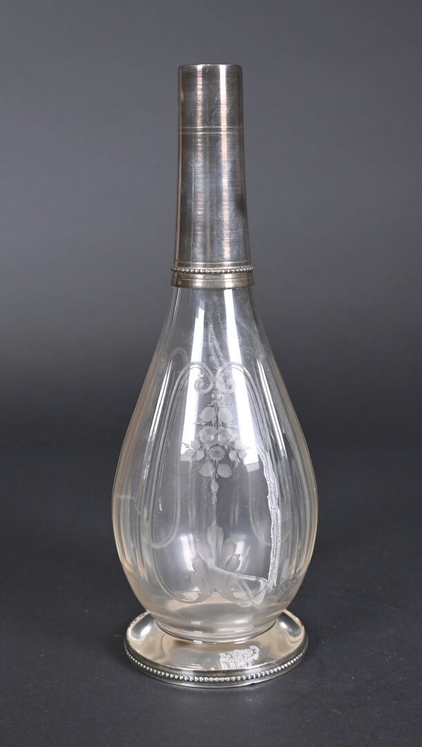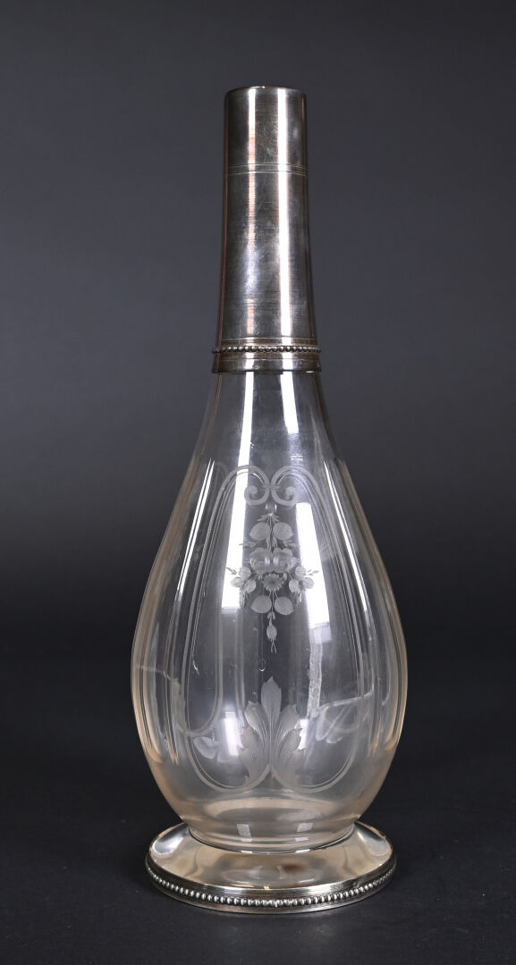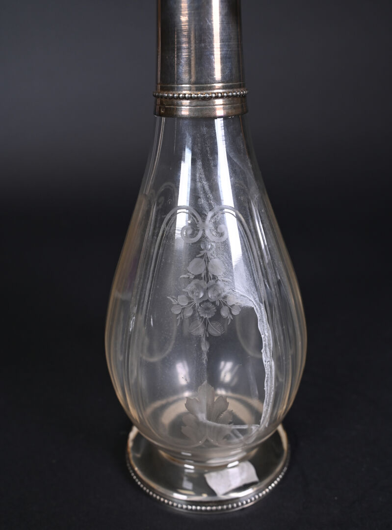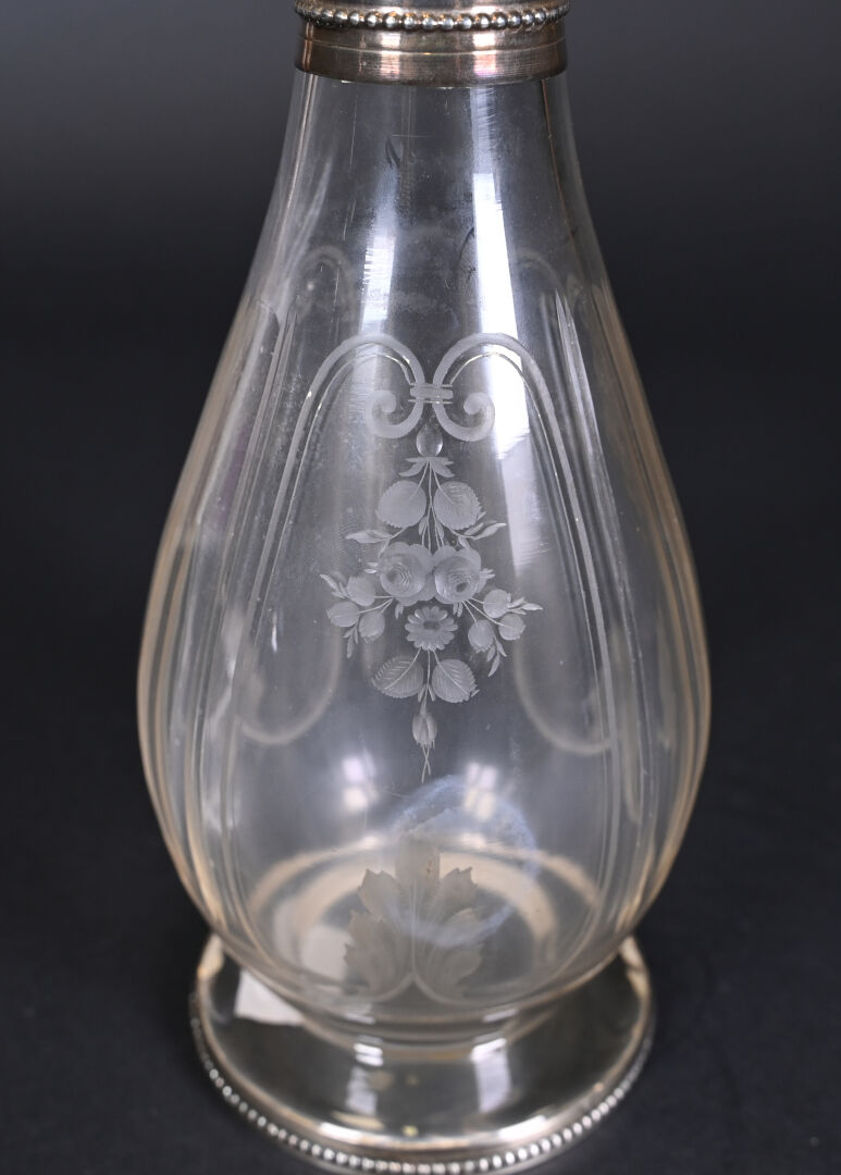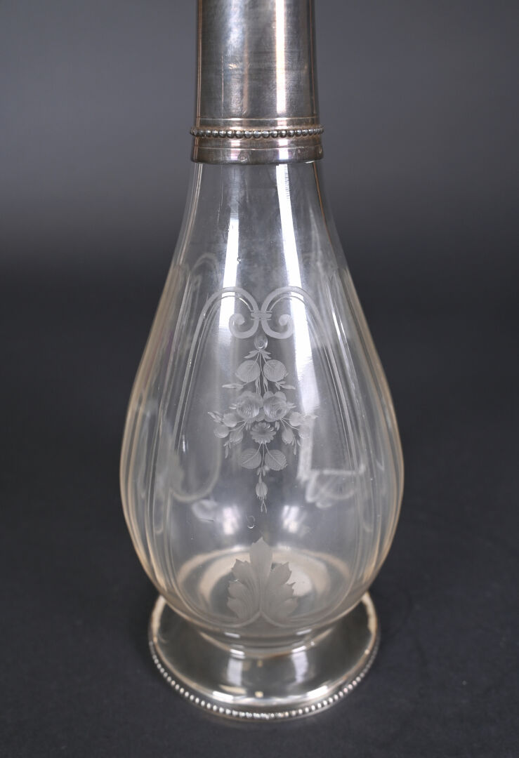 Deux carafes en cristal gravé, à cols et montures en argent 925/1000e (manque un bouchon, taches de liquide pour une). Haut. : 27 et 30 cm – Poids brut. : 1255 g.