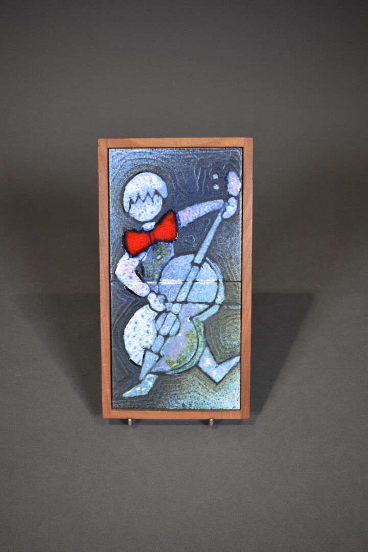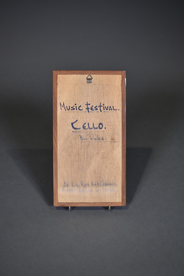 Deux carreaux de céramique à décor émaillé dans les rouge et bleu figurant un violoncelliste. Cadre en bois. Au dos, mention « Music Festival CELLO ». Dim. totales : 32,5 x 17,5 cm.
