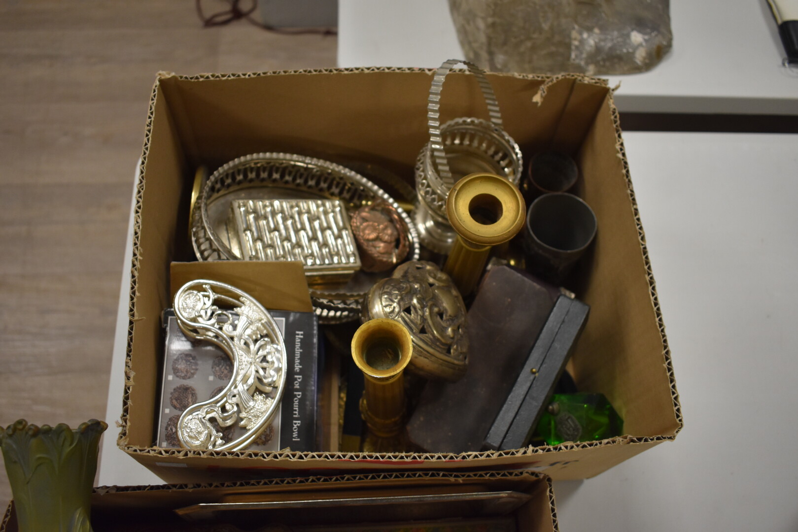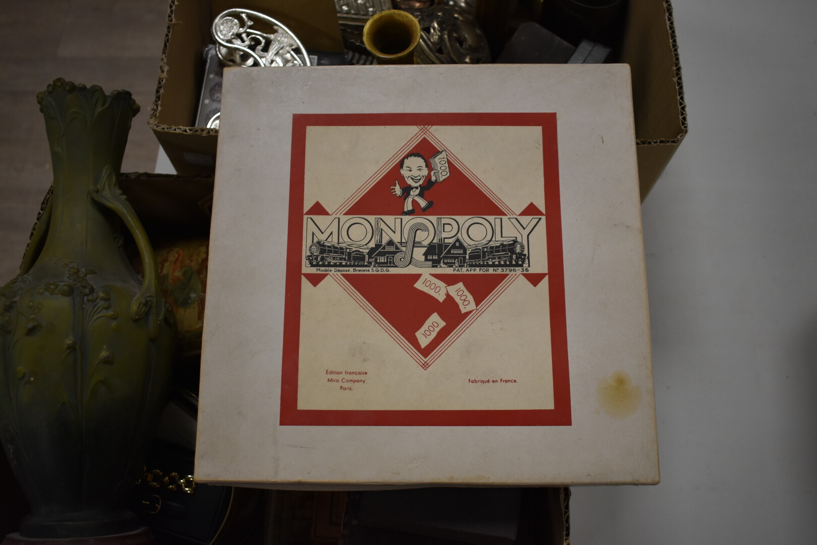 Deux cartons de bibelots divers dont jeux anciens , monopoly, médailles, petite collection de pièces, petite collection de quartz, bougeoirs en laiton et divers.