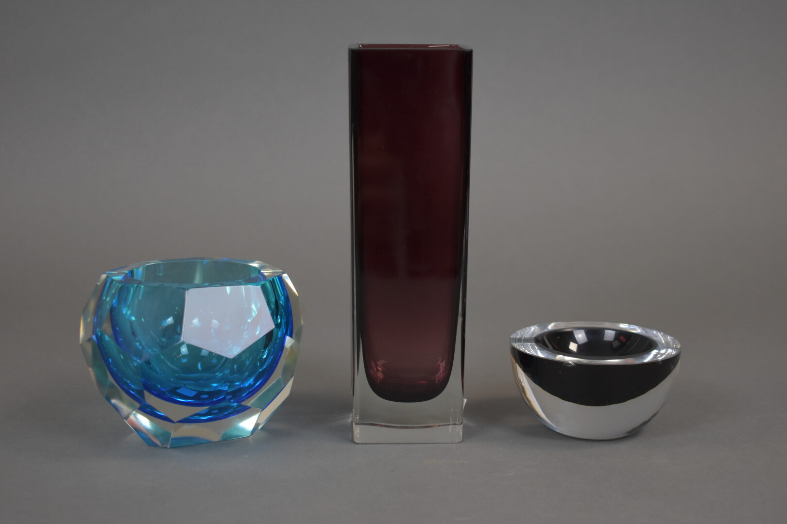 Deux cendriers et un vase de section carrée en cristal sommerso bleu et mauve (quelques égrenures). XXe siècle. Haut. : vase : 21,8 cm.