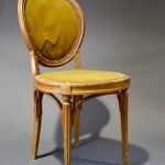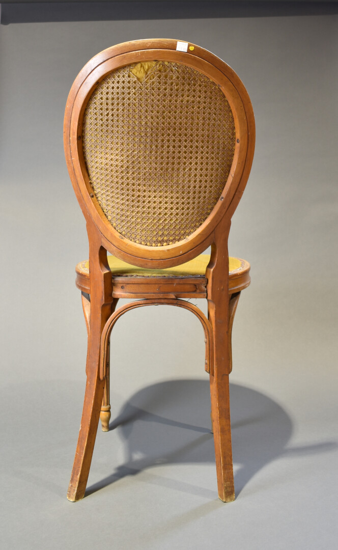 Deux chaises en hêtre à dossiers médaillon, pieds fuselés cannelés. Dossier et assise cannés (accidents, usures et mouillures). Etiquette Joseph KHON WIEN. Dessus de velours vert kaki rapporté. Haut. : 93,5 cm.