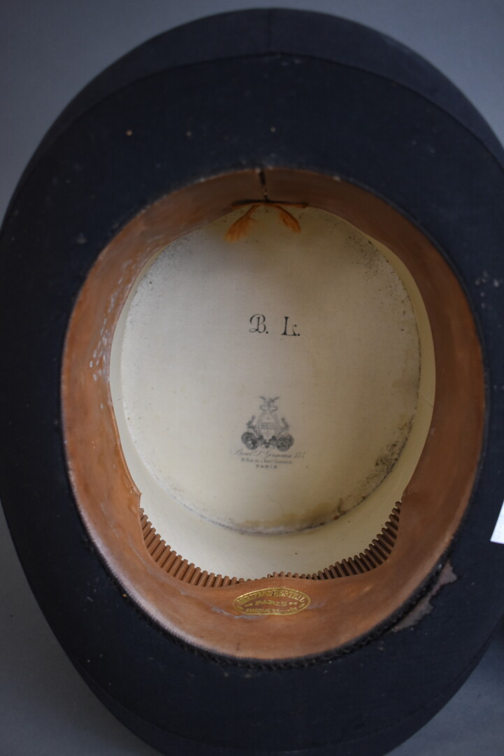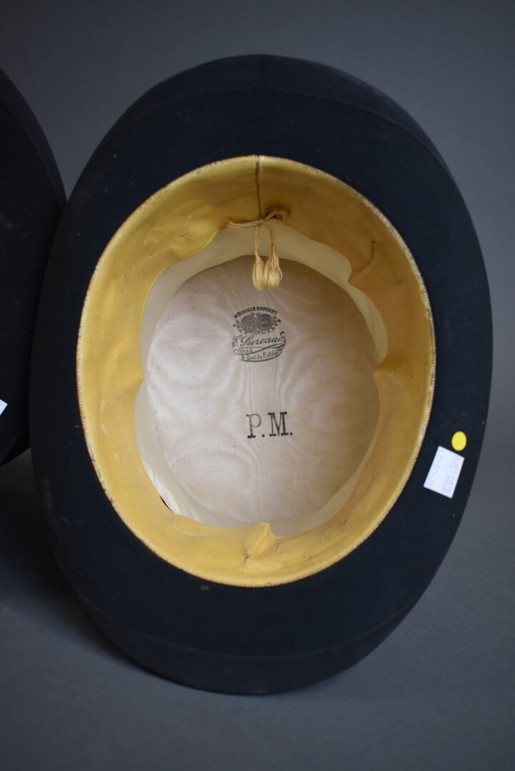 Deux chapeaux haut-de-forme noirs, BERTEIL et SUREAU avec leur boîte de transport en maroquin fauve (usures).