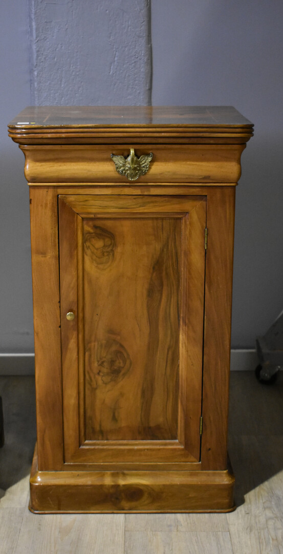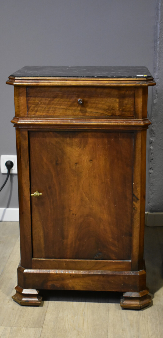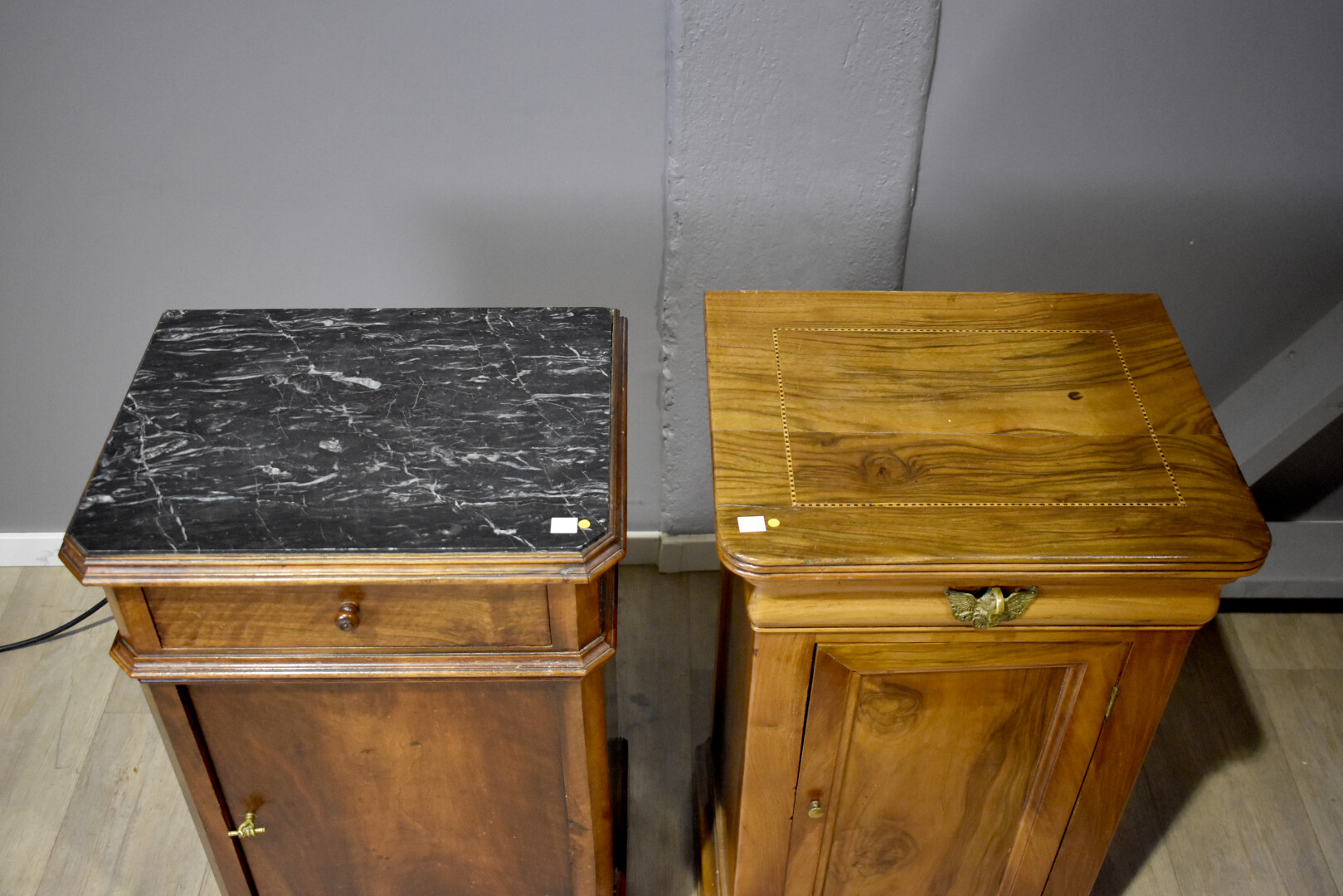 Deux chevets en noyer et bois teinté. Un à plateau de marbre gris. XIXe siècle.