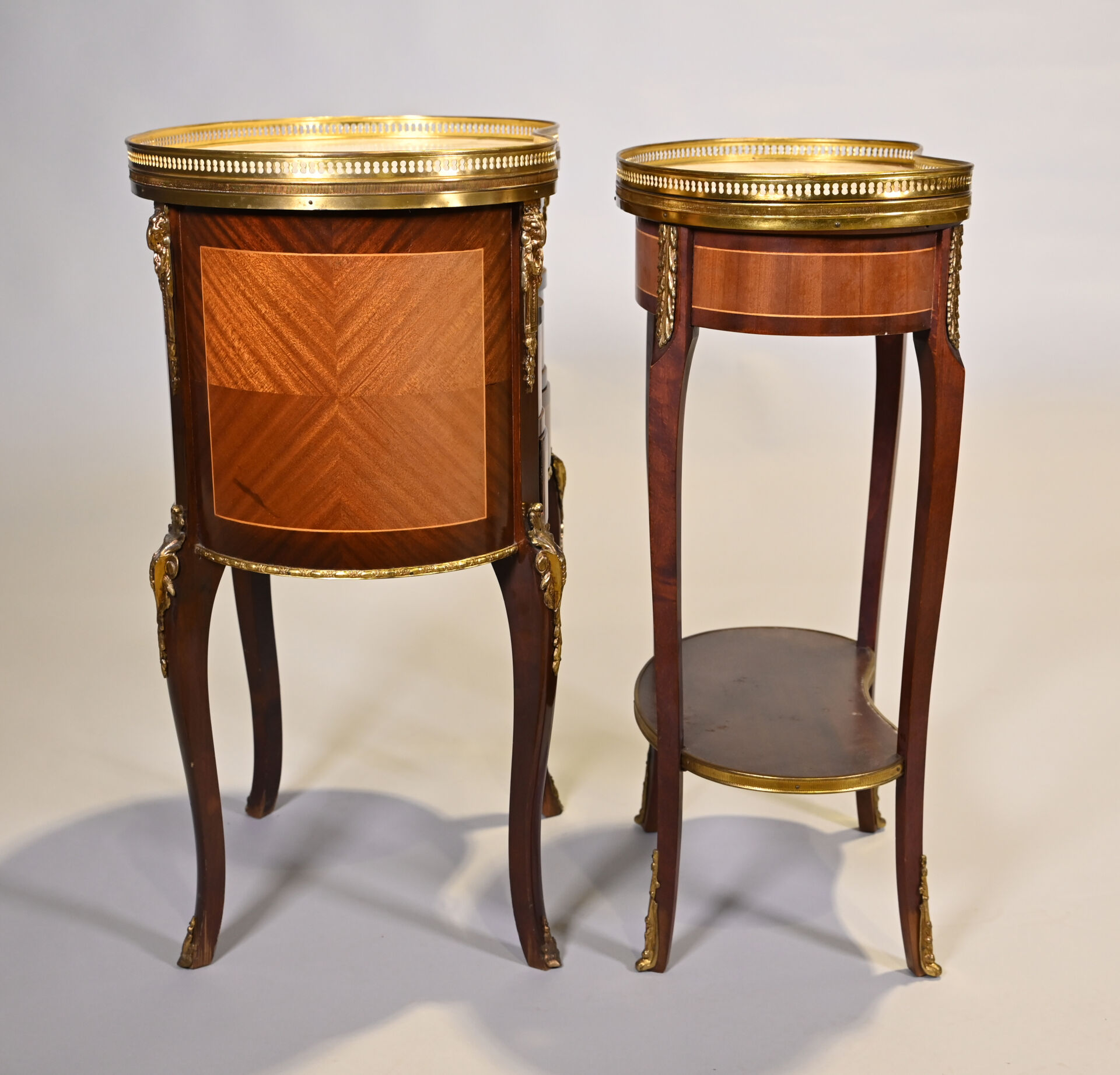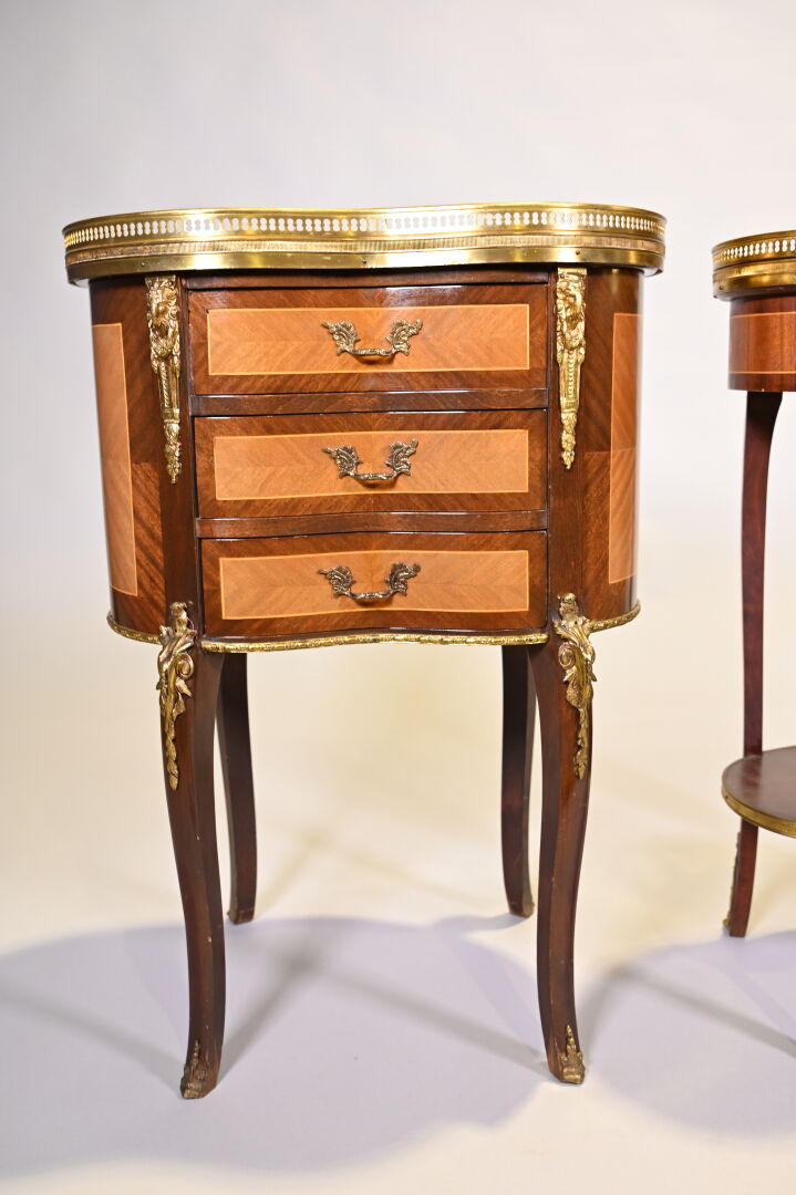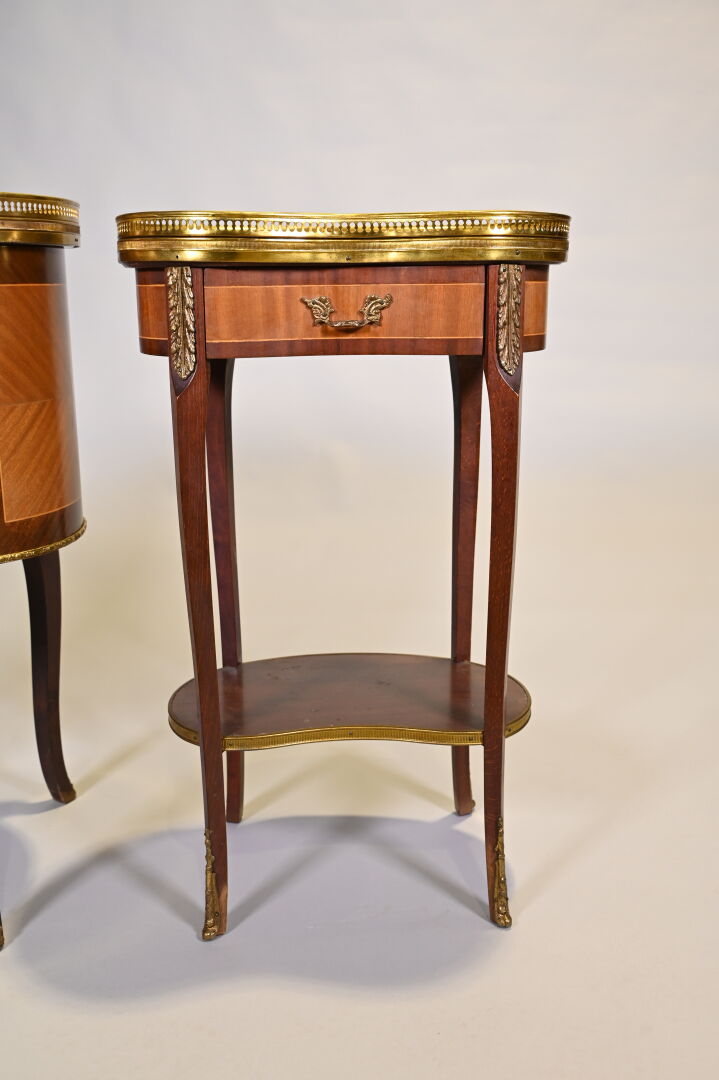 Deux chevets en placage d’acajou et bois teinté ouvrant à un tiroir et trois tiroirs, reposant sur des pieds légèrement galbés. Plateau de marbre blanc ceints d’une galerie de laiton repercé. Style Transition Louis XV-Louis XVI. XXe siècle. Haut. : 71 cm – 73 cm.
