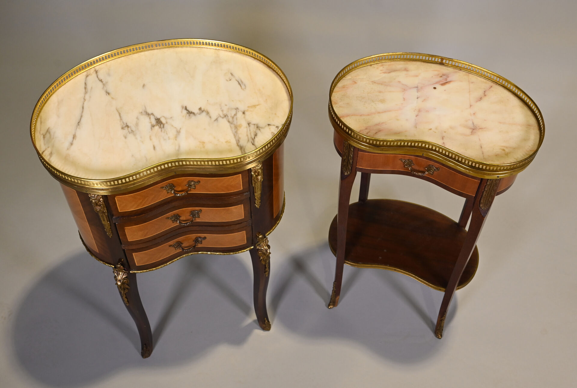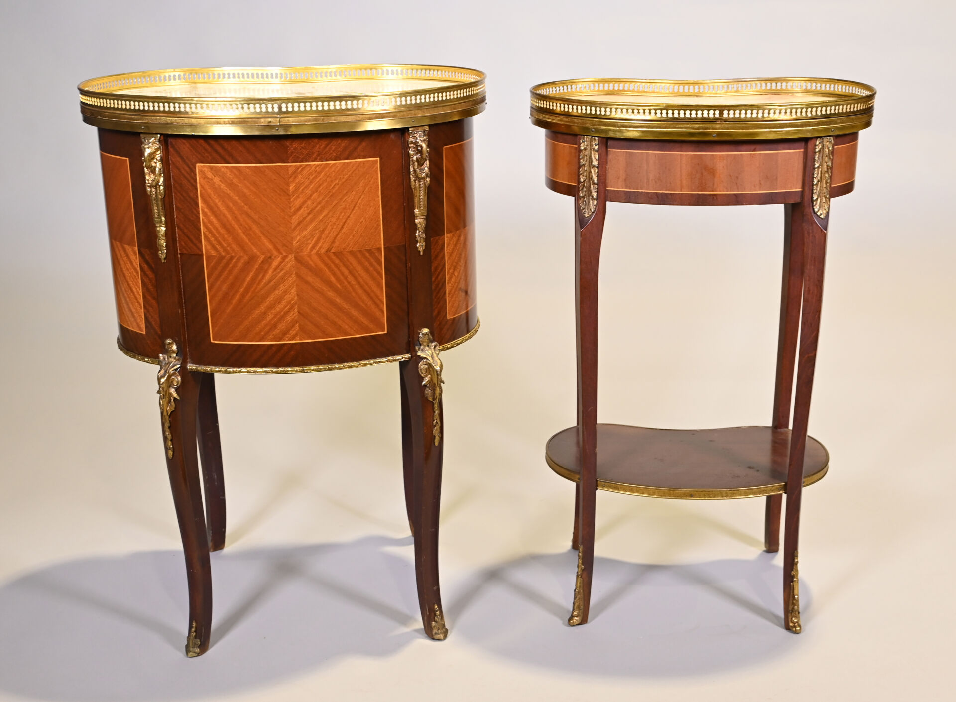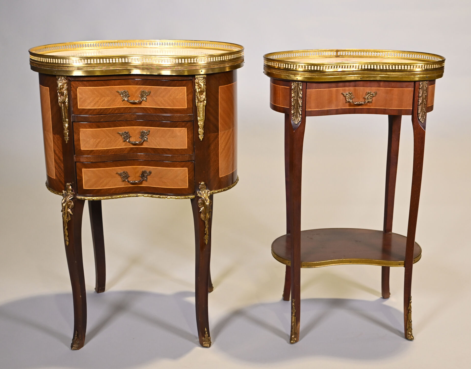 Deux chevets en placage d’acajou et bois teinté ouvrant à un tiroir et trois tiroirs, reposant sur des pieds légèrement galbés. Plateau de marbre blanc ceints d’une galerie de laiton repercé. Style Transition Louis XV-Louis XVI. XXe siècle. Haut. : 71 cm – 73 cm.