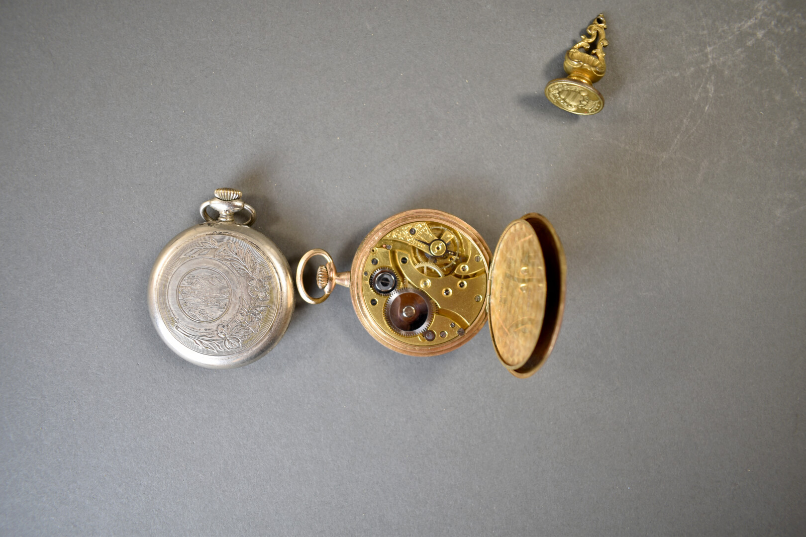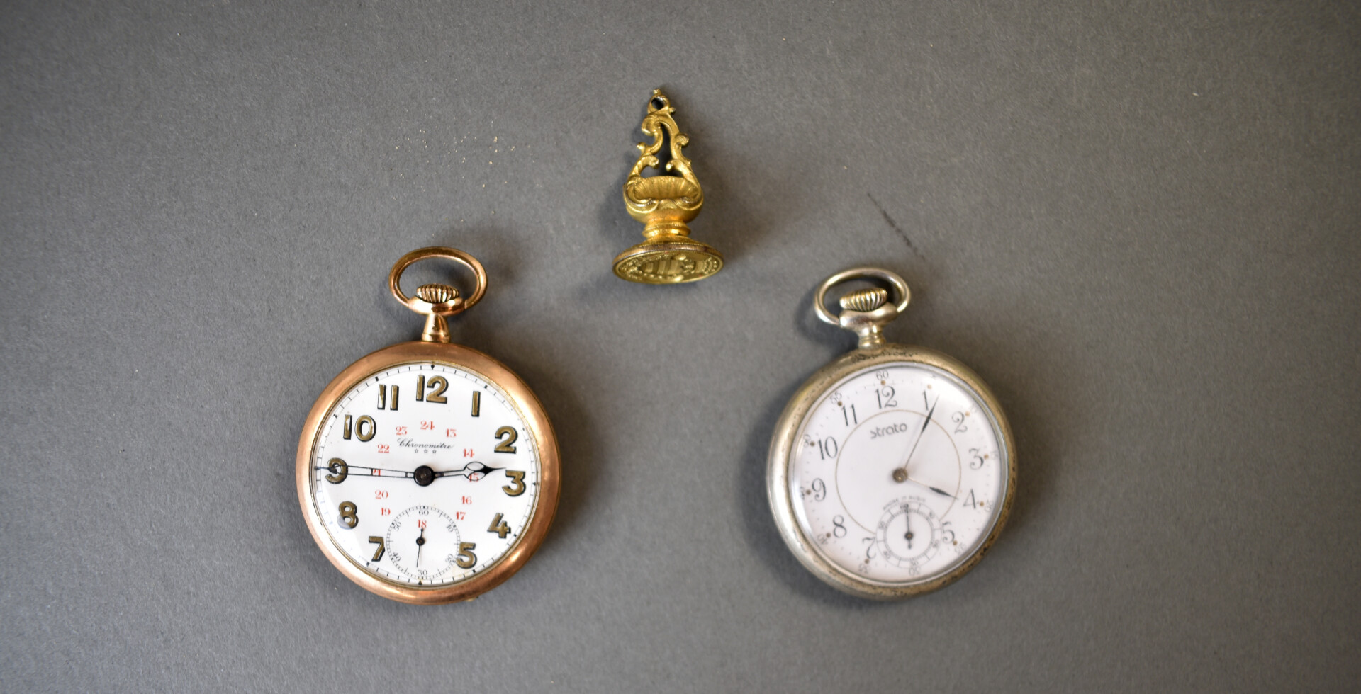 Deux chronomètres, un en métal argenté l’autre en métal doré. On joint un sceau.