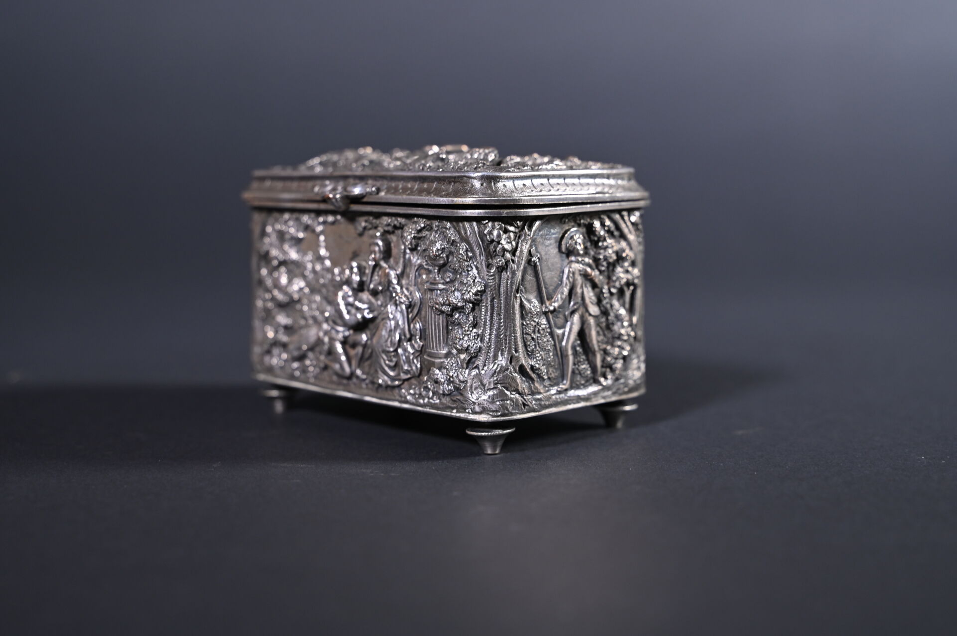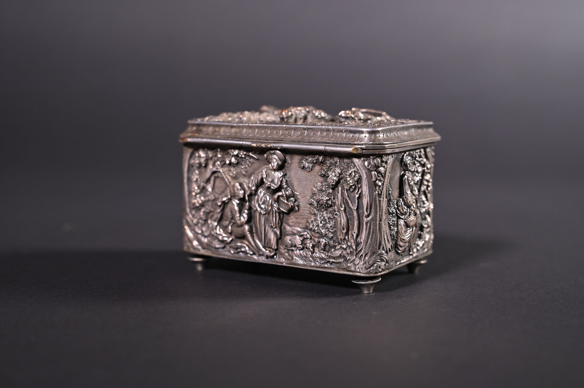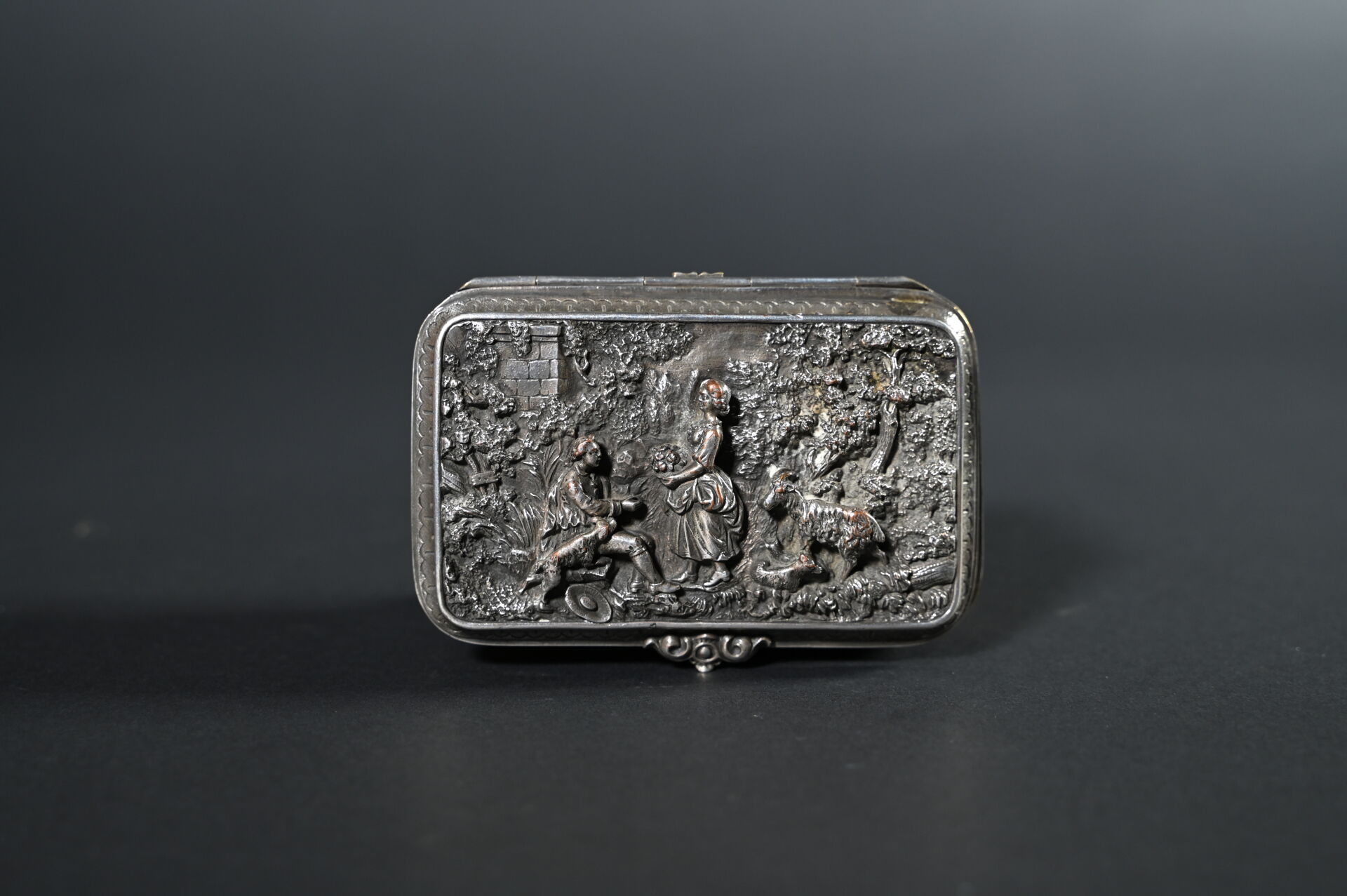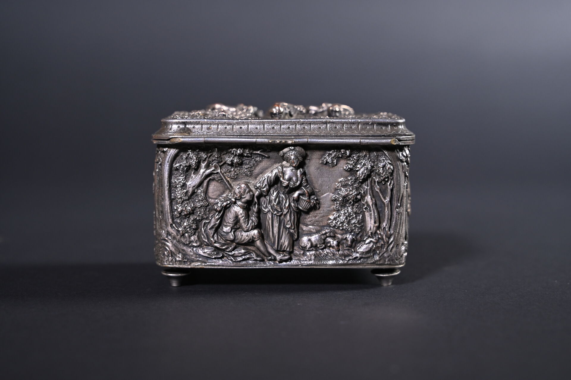 Deux coffrets en métal argenté, l’un à décor en bas relief de scènes galantes, l’autre à décor gravé (quelques usures). Haut. : 8,5 m et 5 cm. Fin du XIXe siècle.