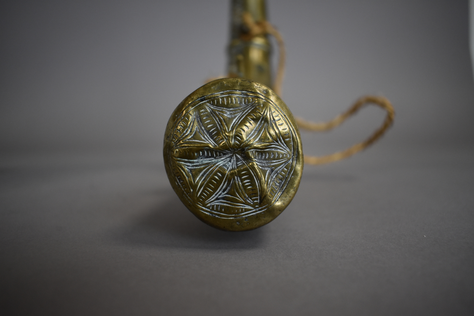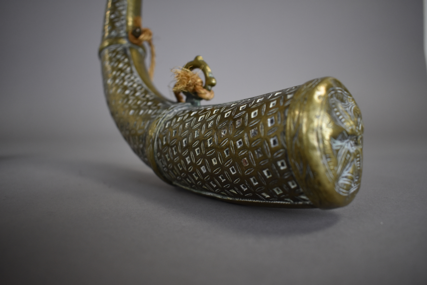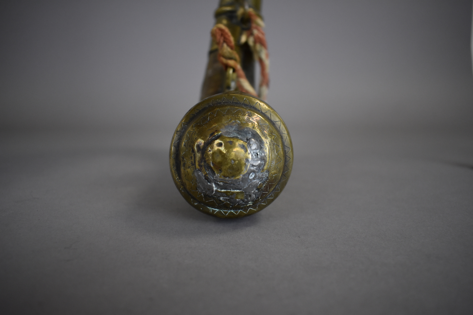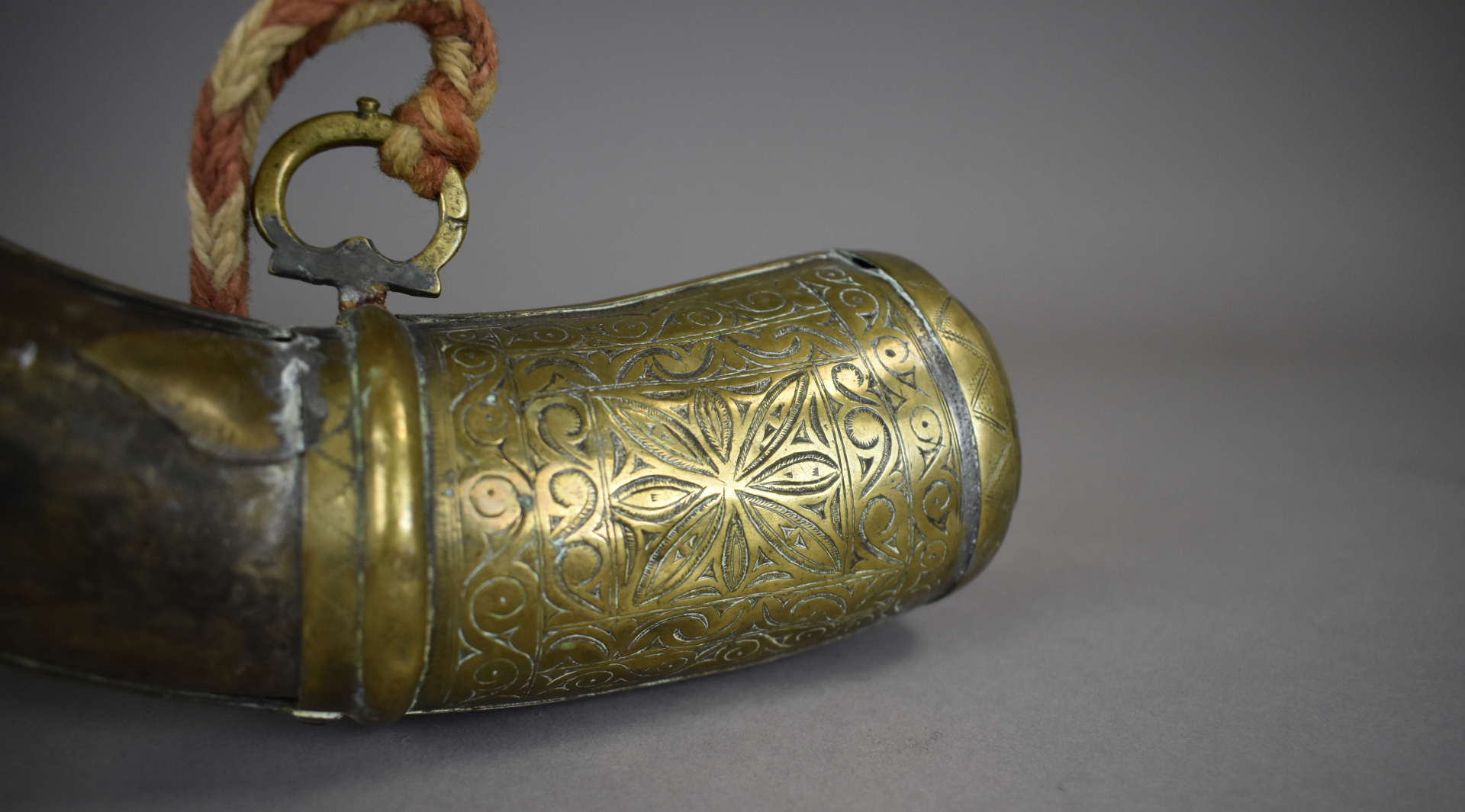Deux cors de chasse en cuivre et corne (chocs). Afrique du Nord, début du XXe siècle. Long. du plus grand : 35 cm.