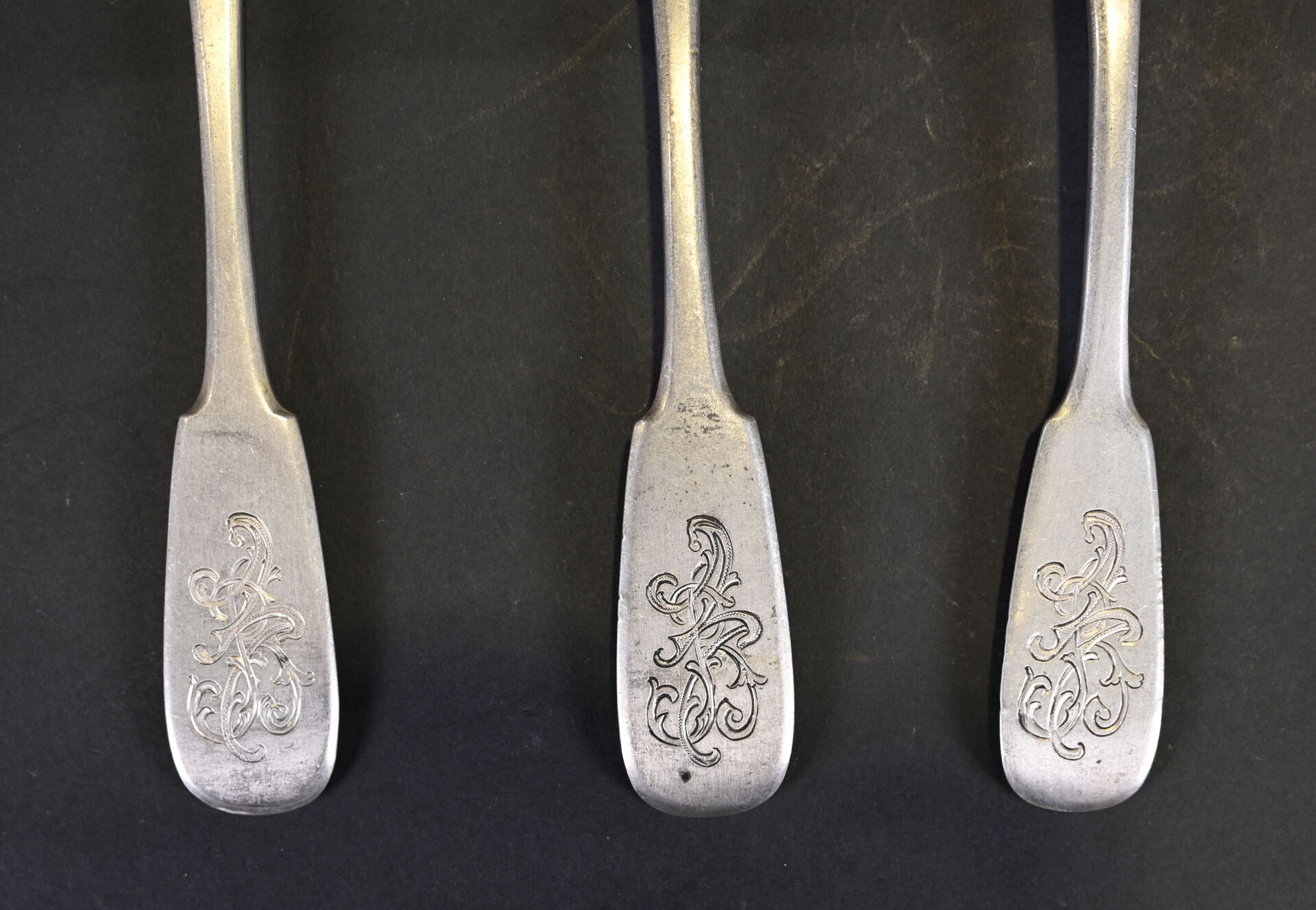Deux cuillères et une fourchette en argent 925/1000e, les spatules ciselées de chiffres. Usures. Travail étranger. Poids total. : 220g.