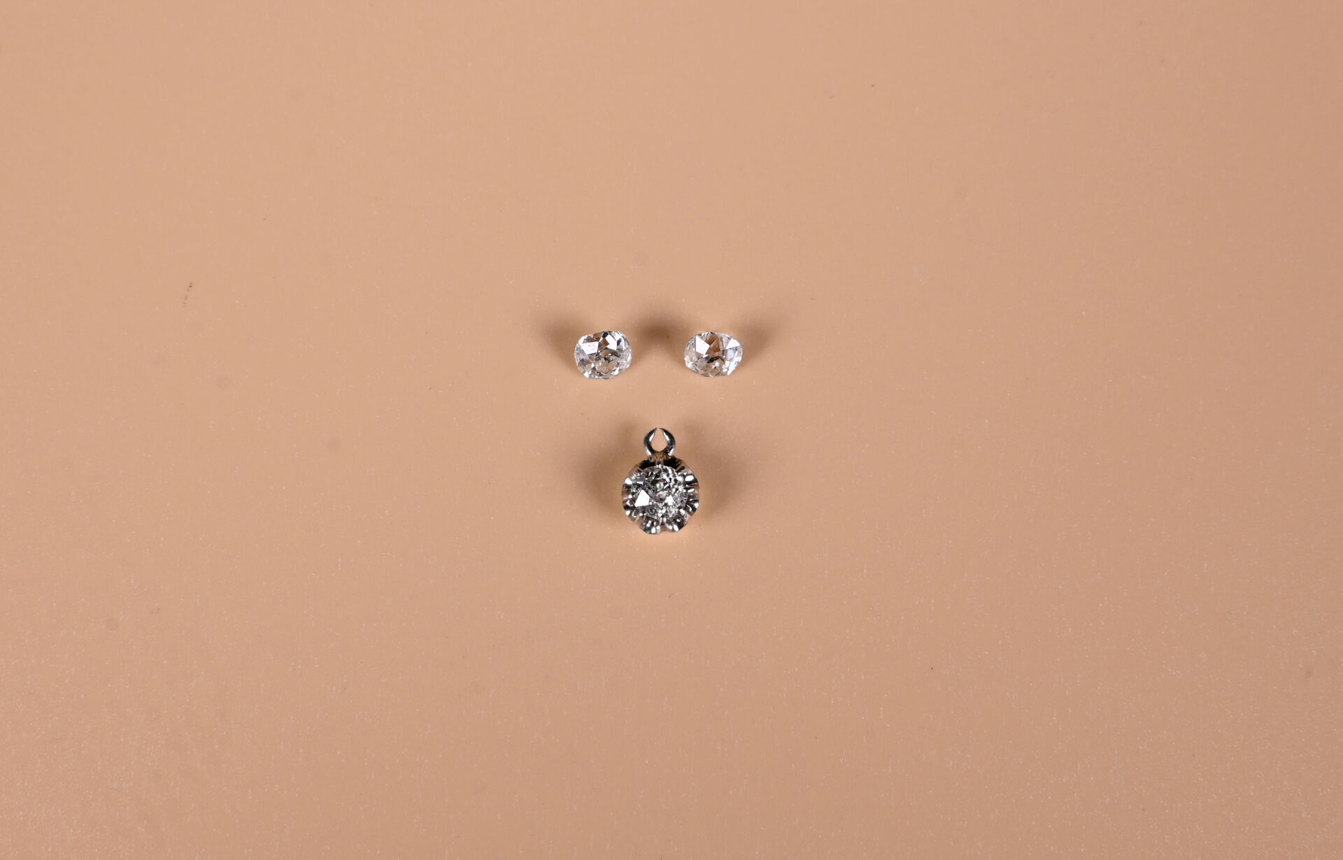 Deux diamants sur papier taille ancienne pour environ 0,60 carat au total. On joint un pendentif en or gris 18K 750/1000e avec un diamant taille ancienne d’environ 0,25 ct (bélière ouverte et diamant inclus). Poids brut. : 0,60 g.