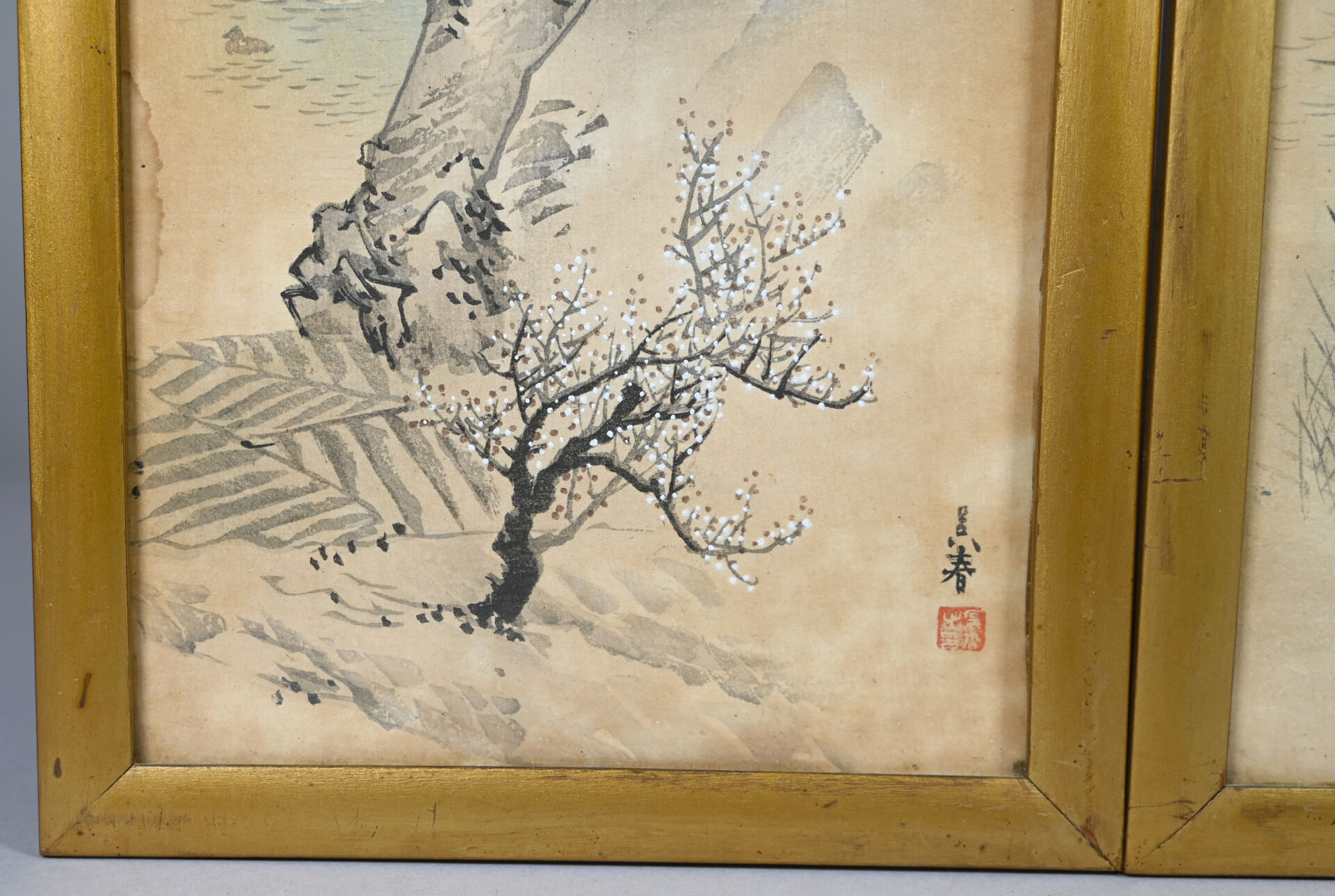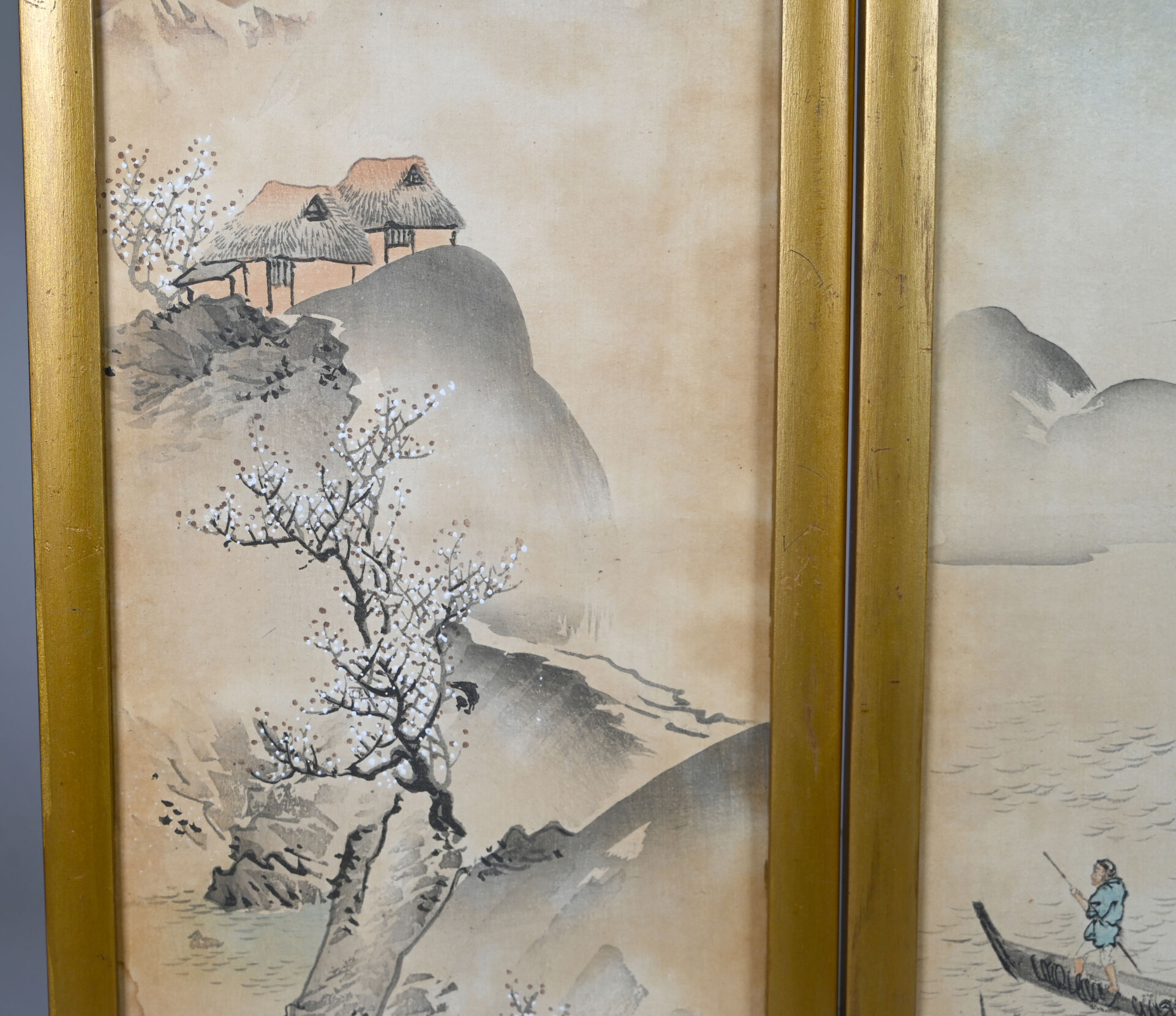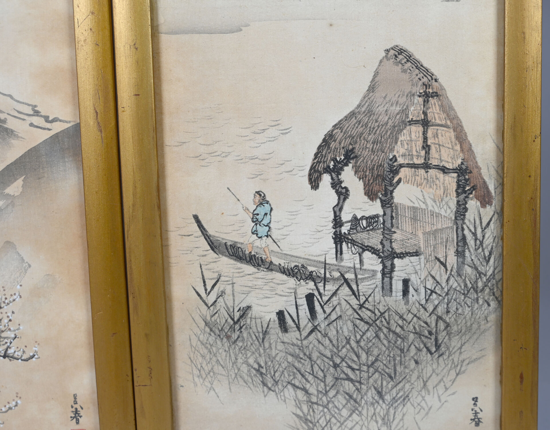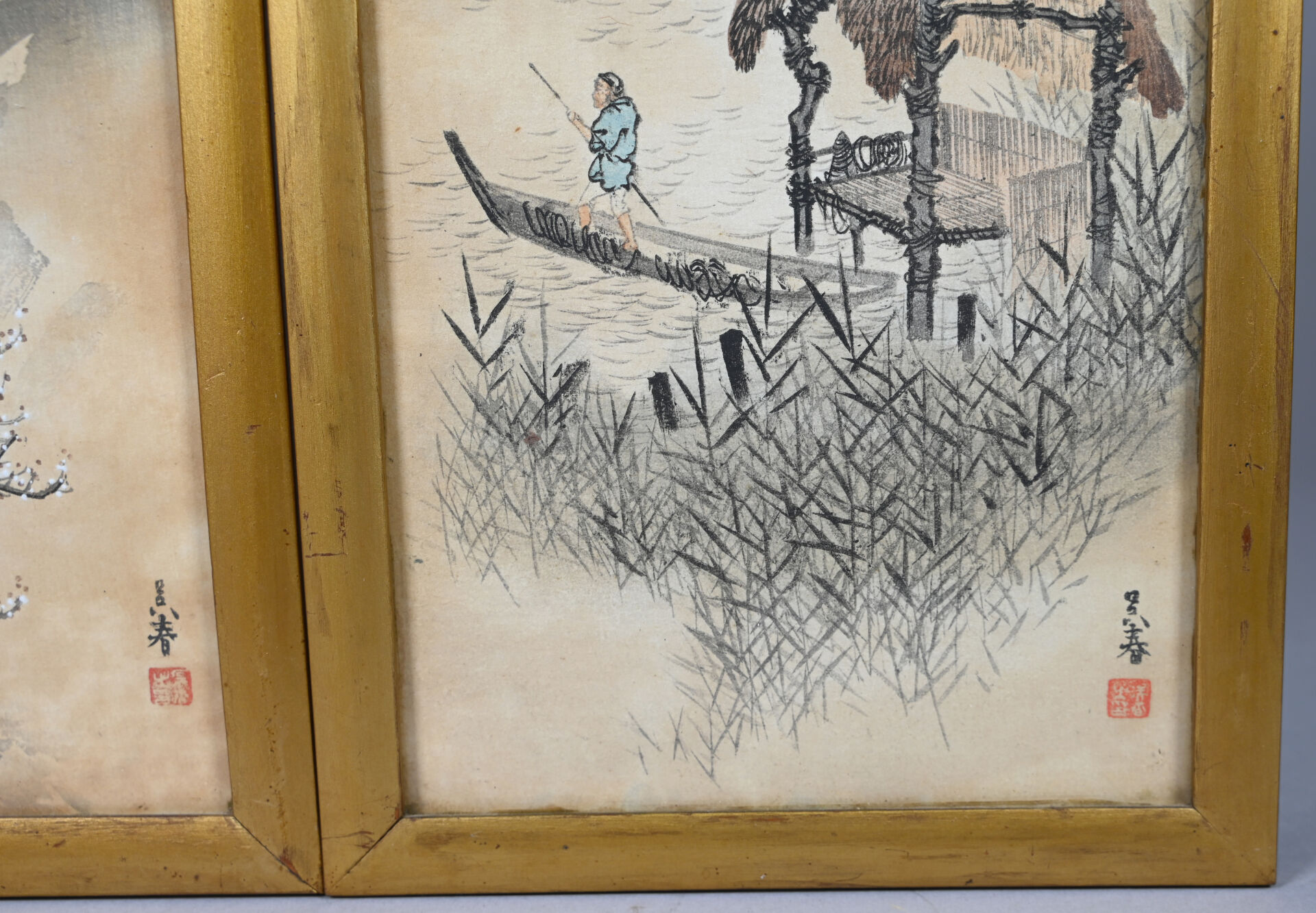 Deux estampes soit paysages aux cerisiers en fleurs, pavillon et pêcheur. 39 x 18 cm à vue.