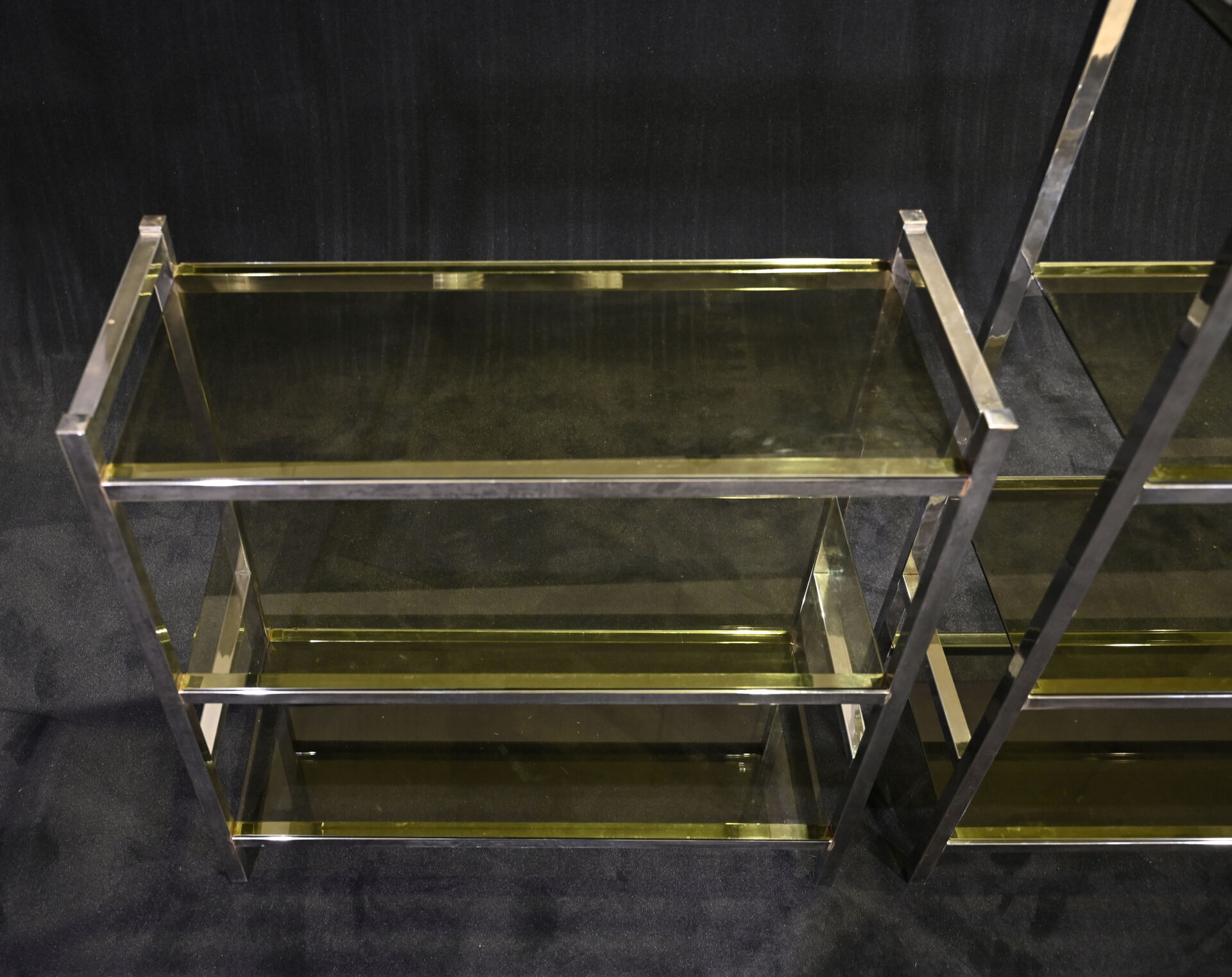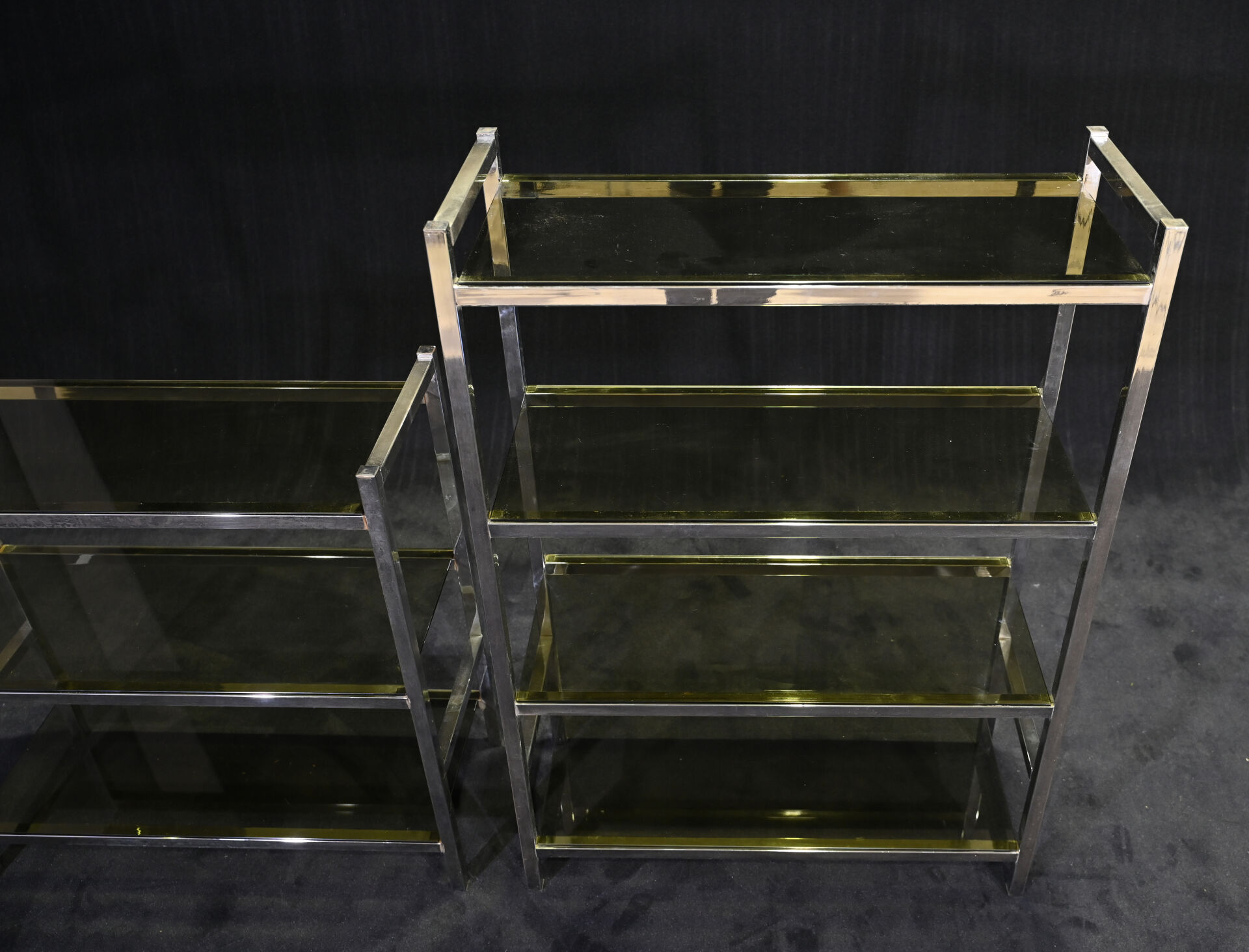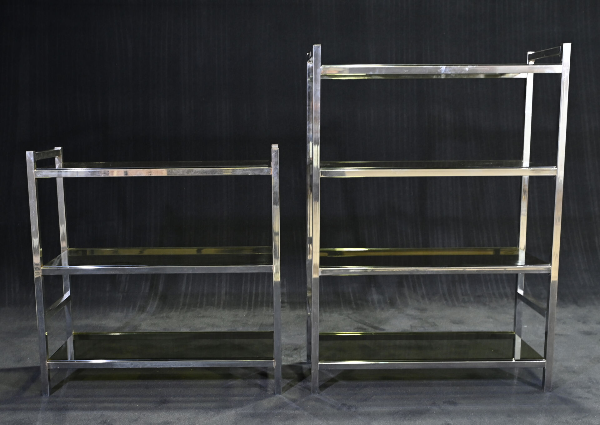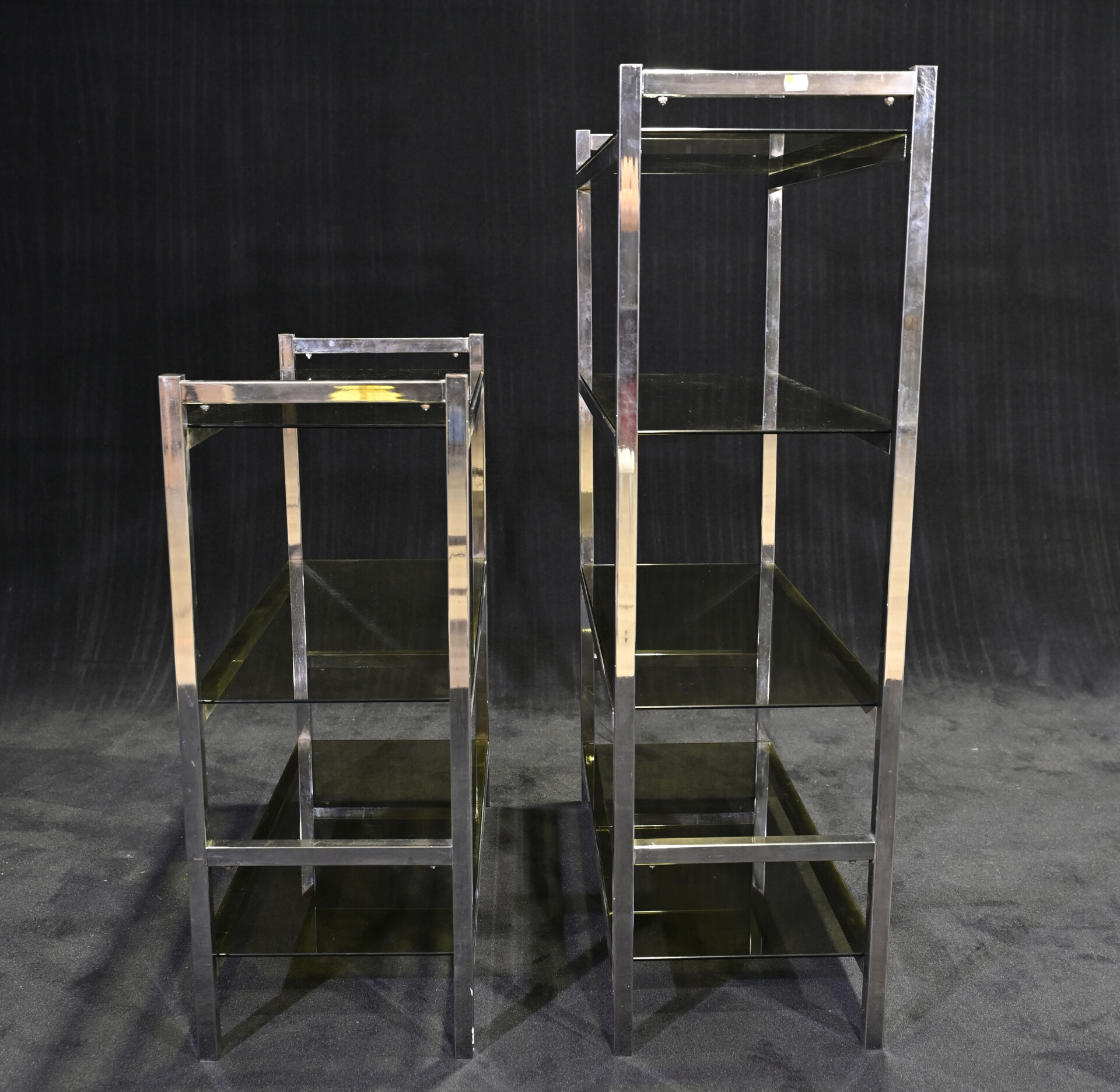 Deux étagères à structure en métal chromé (piqures) et 7 plateau de verre fumé. Vers 1970/80. Dim. de la plus grande : Haut. : 121 cm – Larg. : 85,5 cm – Prof.. : 35,5 cm.