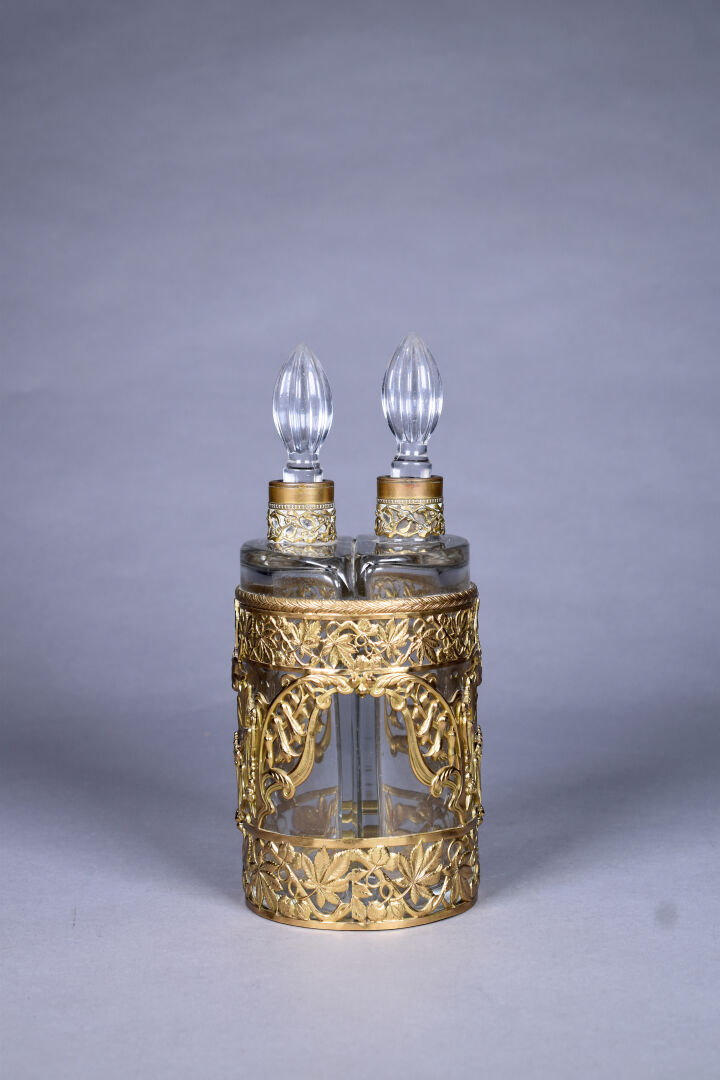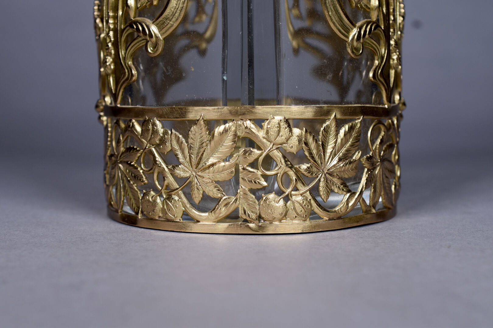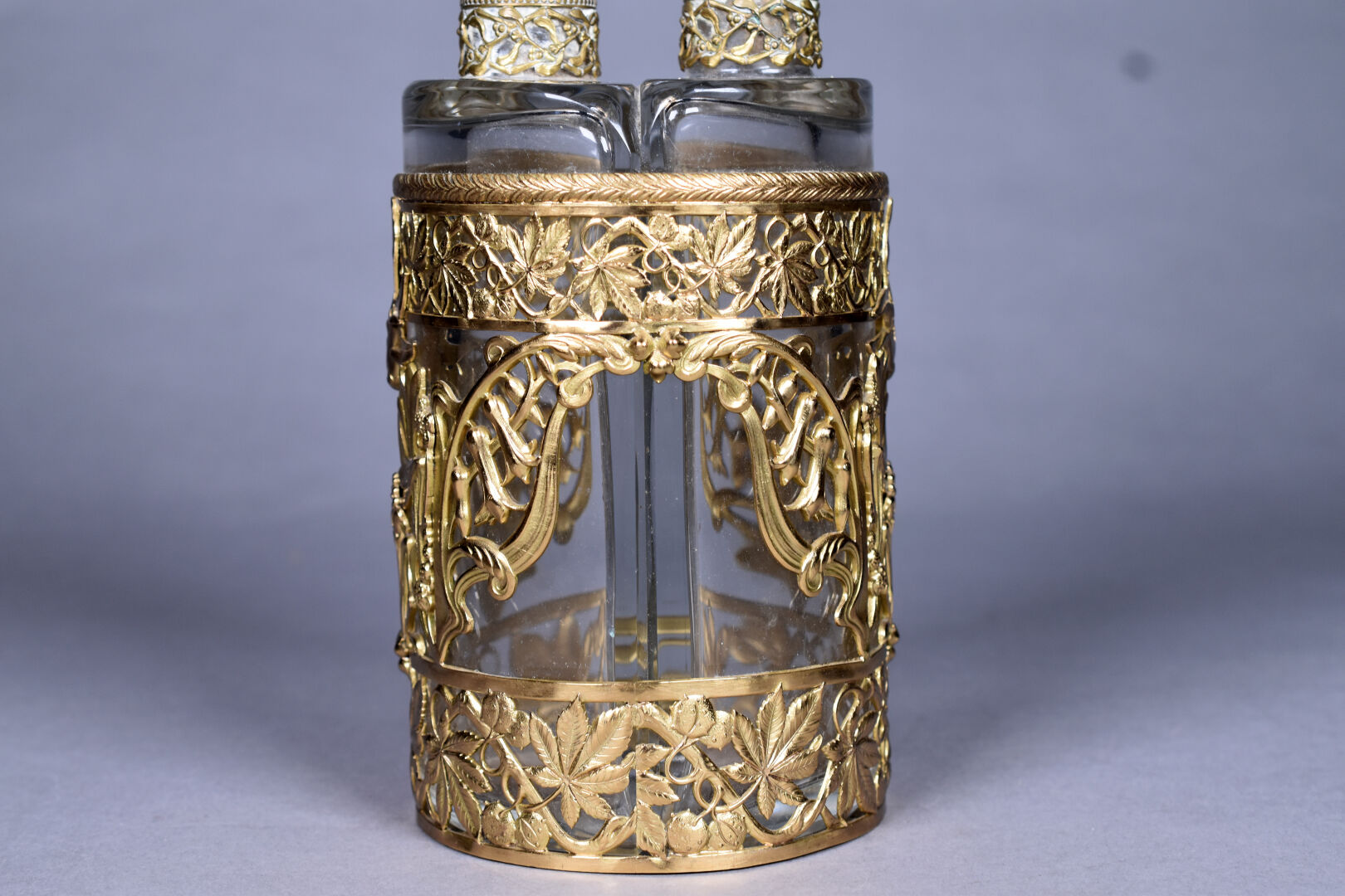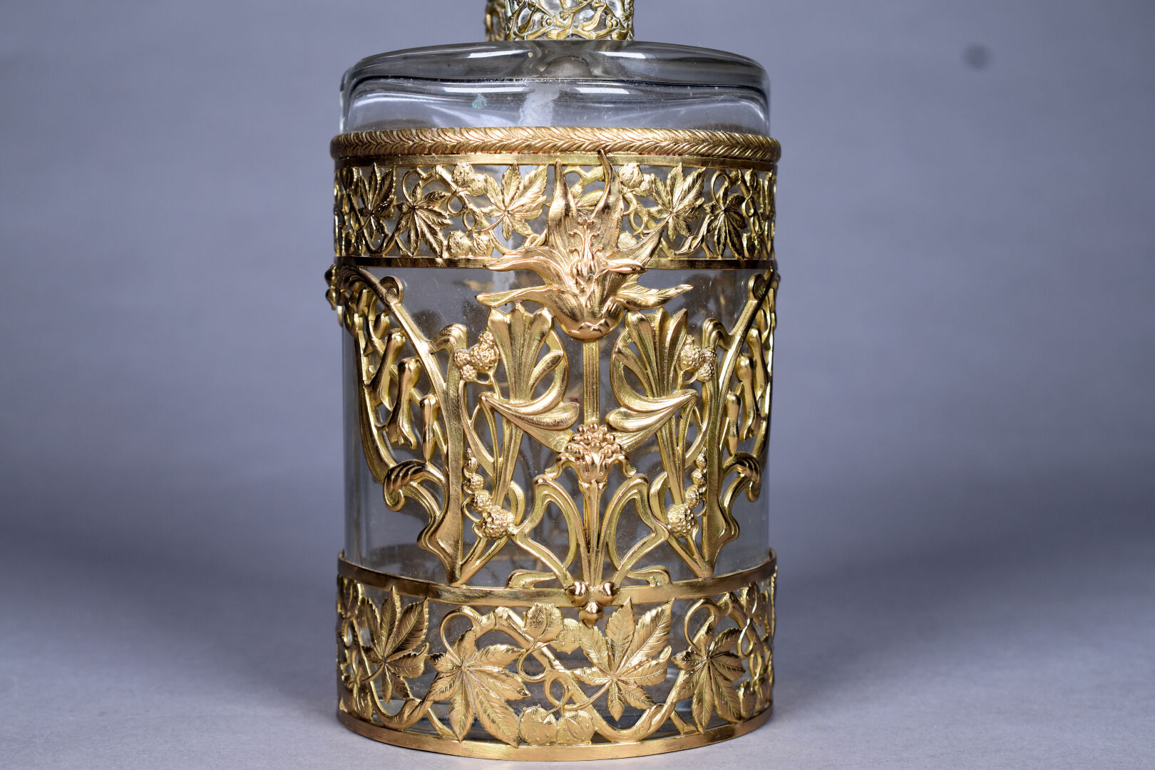 Deux flacons en cristal dans leur monture en métal doré à décor ajouré de branches de marronnier et fleurs. Bouchons rapportés (quelques égrenures à l’intérieur des bouchons). Epoque Art Nouveau. Haut. : 24 cm.
