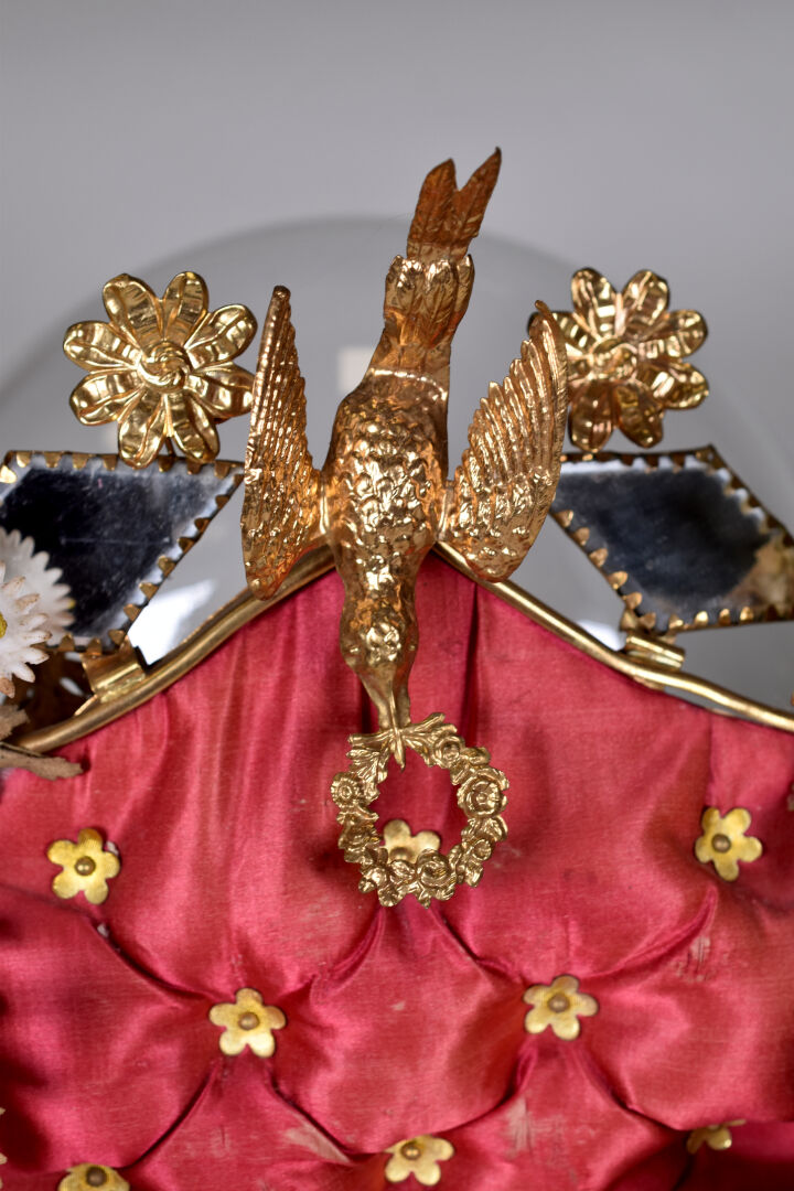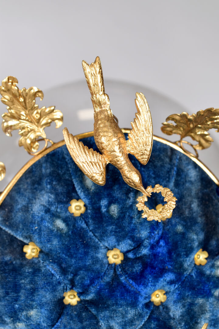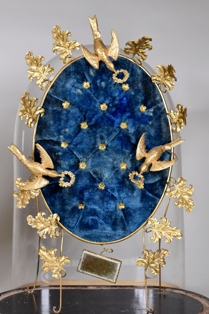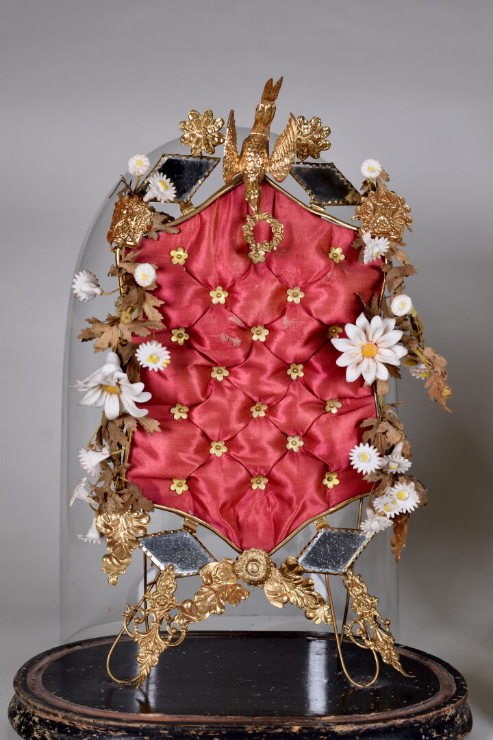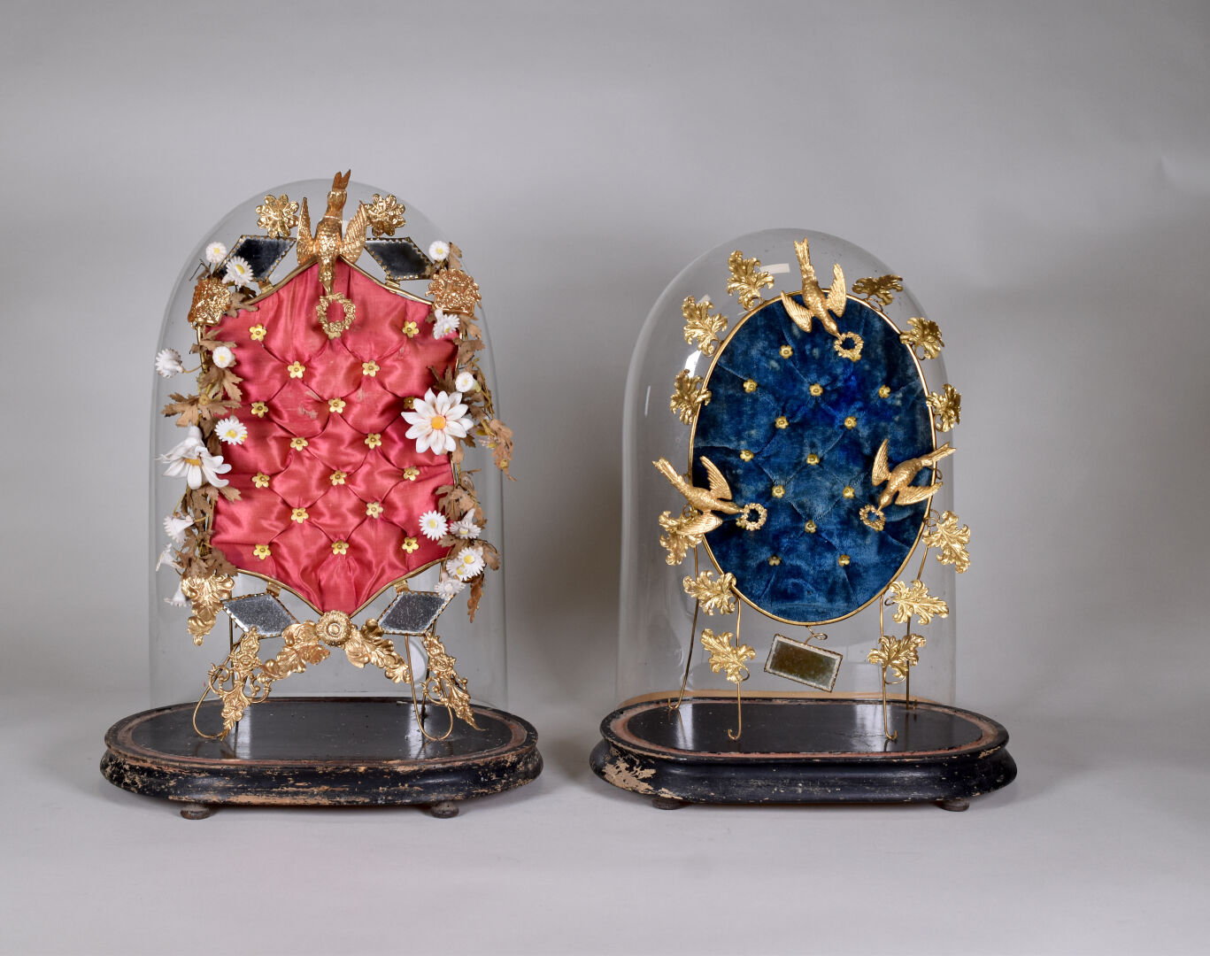 Deux globes de mariée en métal doré et cire à décor capitonné de velours bleu et satin rouge. Socles en bois noirci. Époque Napoléon III. Haut. : 48 cm.