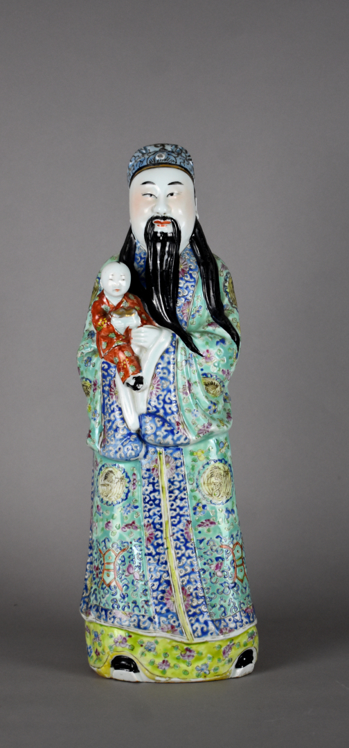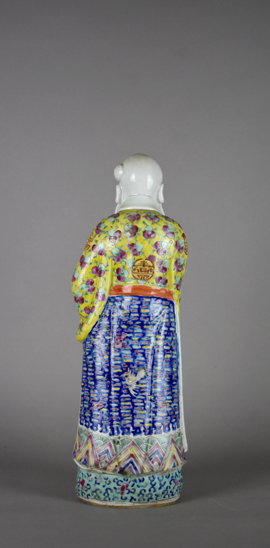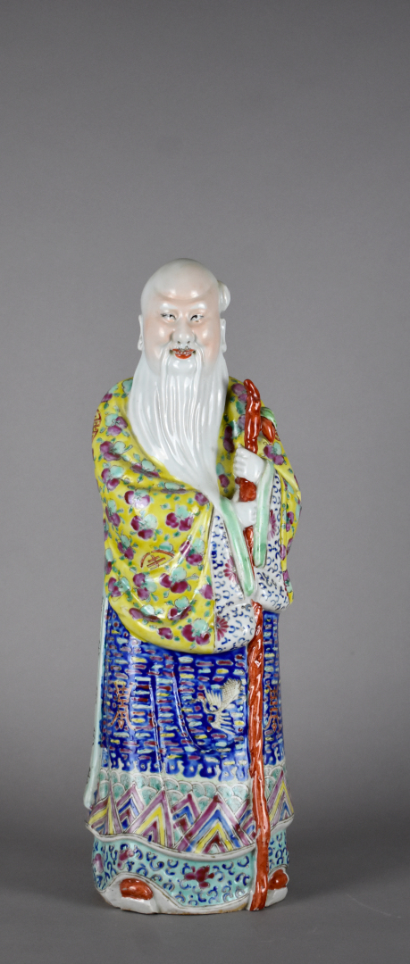 Deux grandes statues en porcelaine et émaux de la famille rose représentant deux étoiles du Tao, Zhoulhao, et Fu Xing divinité. Chine, période Guanxu. Haut. : 47 cm et 47,5 cm.