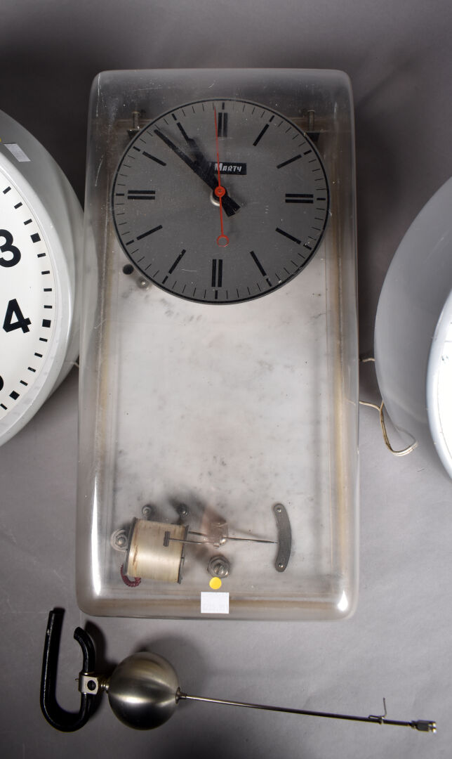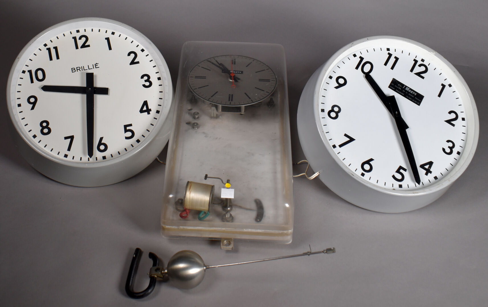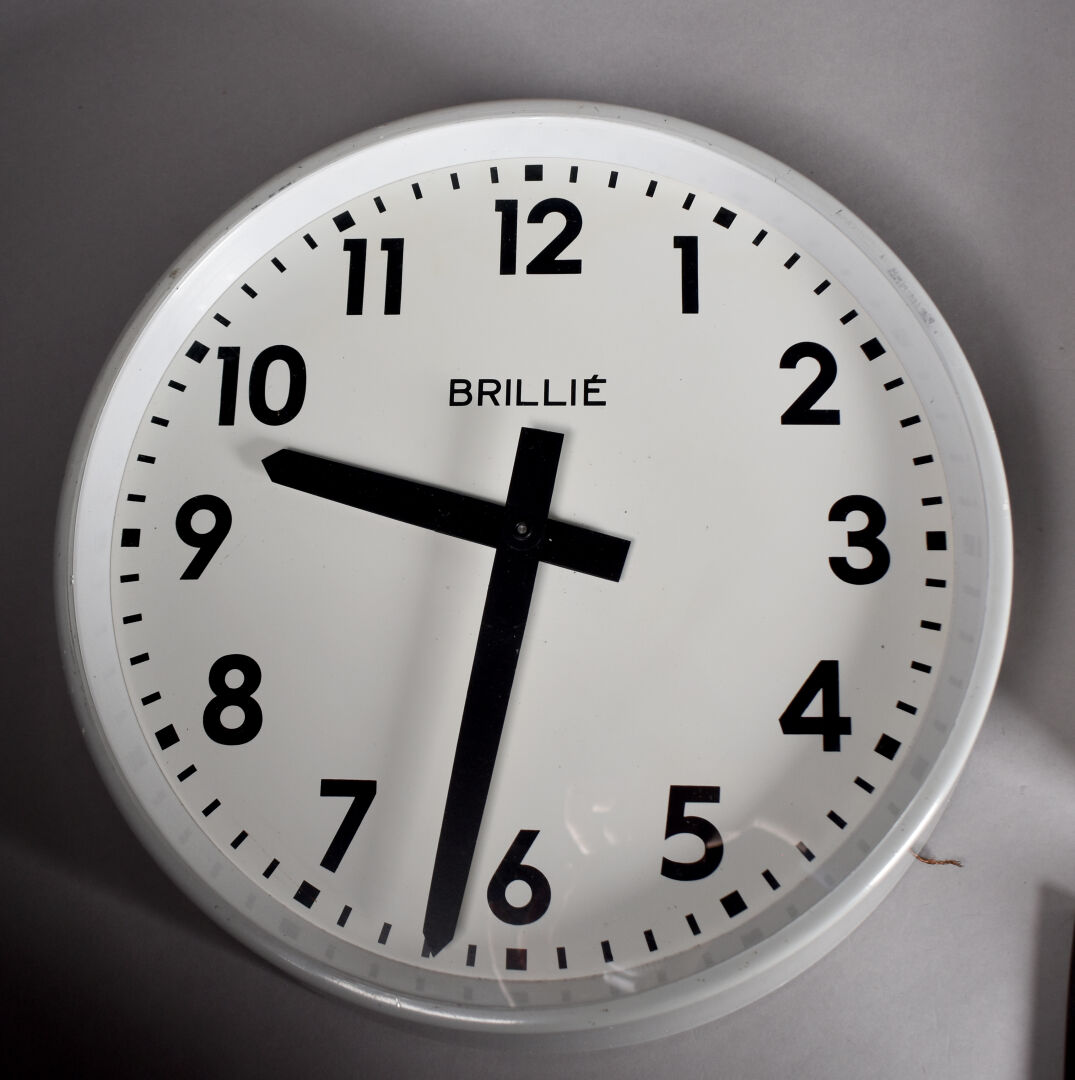 Deux horloges industrielles BRILLIE et une pendule industrielle de la même marque. Diam. : 30 cm et pendule : Haut. : 44 cm.