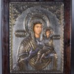 Deux icônes russes avec rizza en argent et argent doré. L’une représentant une Vierge à l’enfant, l’autre un prêtre. Russie, XXe siècle. 24,5 x 19 cm et 18,5 x 15,5 cm. Au dos, étiquettes d’exportation. Poids brut : 1 520 g.