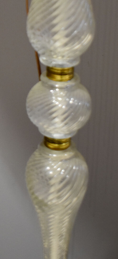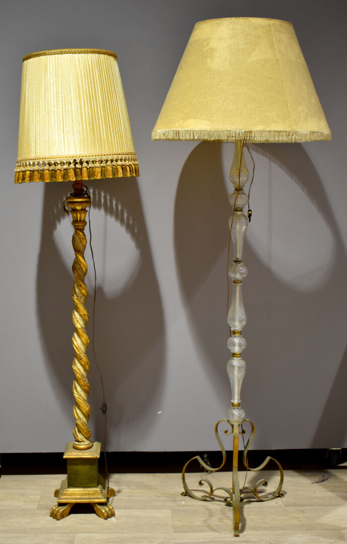 Deux lampadaires soit un en verre moulé torsadé dans le goût de Baccarat et un en bois laqué beige, vert et or. Haut. : 154 cm (en verre sans l’abat jour).