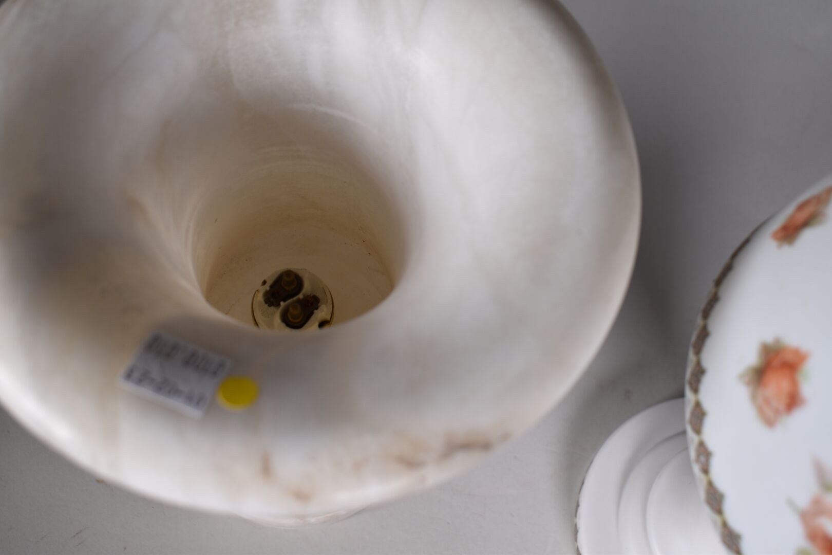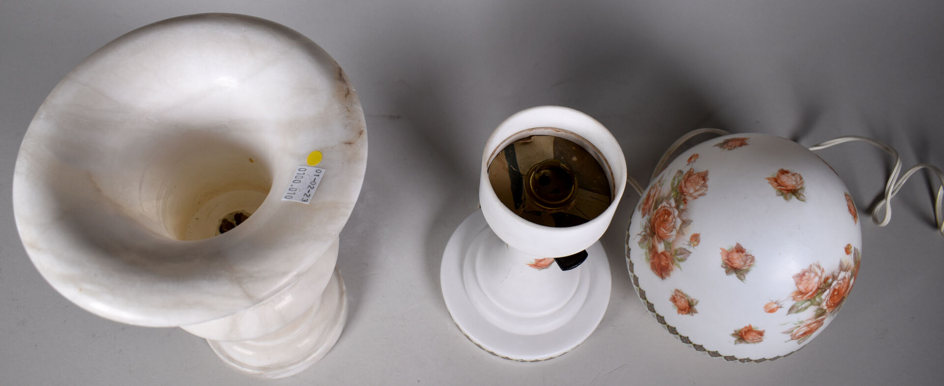 Deux lampes à poser soit une en opaline blanche à décor imprimé de roses et une de forme médicis en albâtre (égrenures). Haut. de la plus grande : 33 cm.