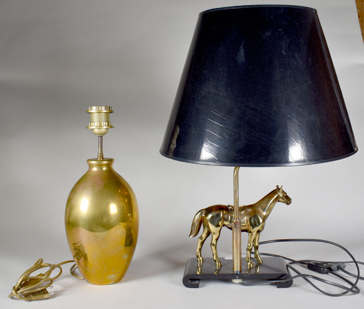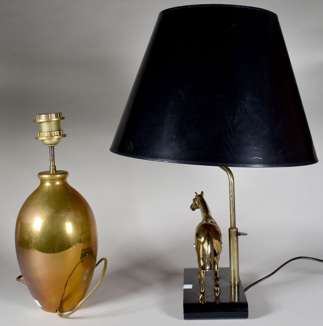 Deux lampes à poser, une ovoïde en bronze, l’autre à décor d’un cheval en métal doré. XXe siècle. Haut. : 36,5 cm et 57,5 cm.