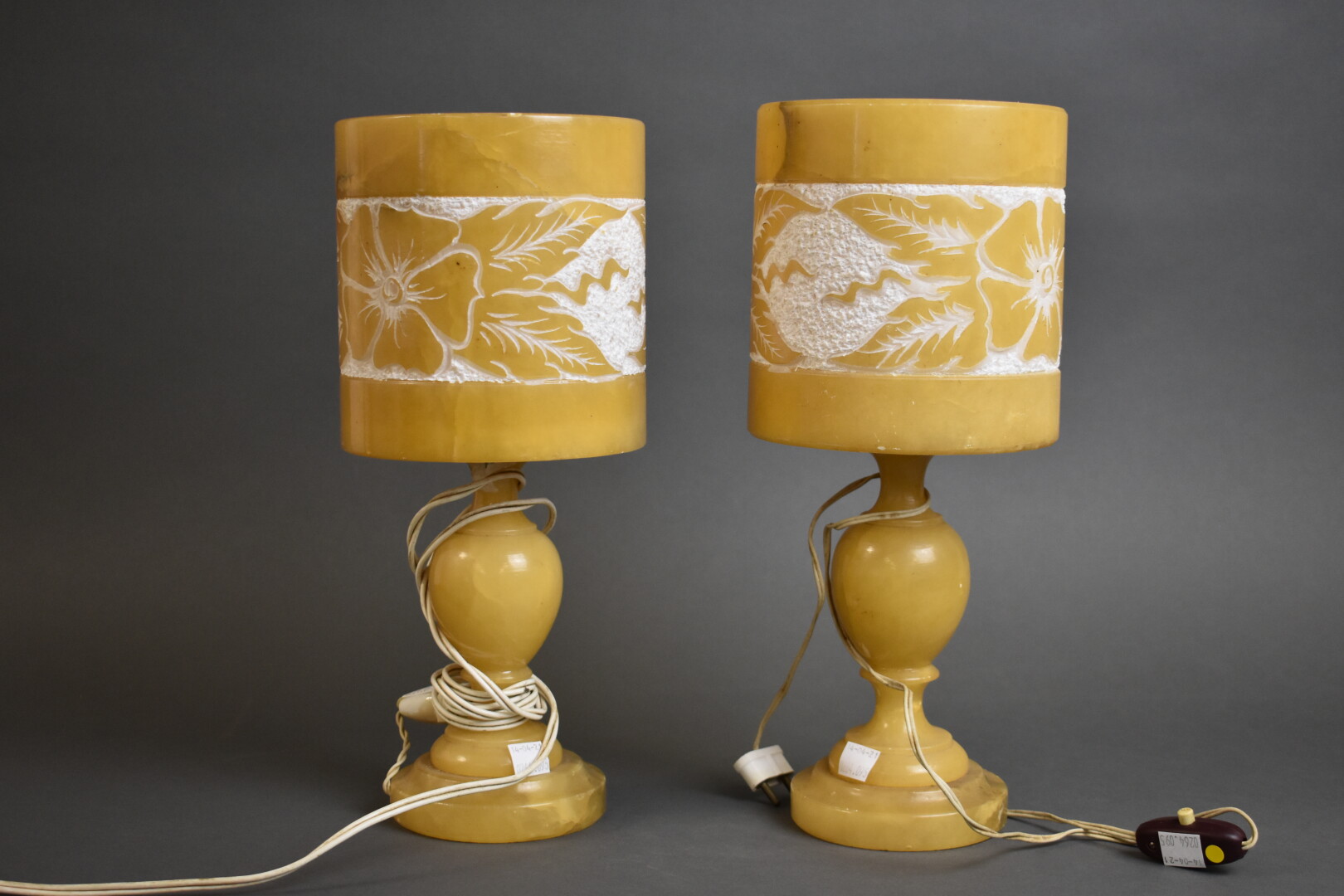 Deux lampes en pierre dure jaune sculptée d’un décor de fleurs. Electrifiées. Haut. : 34 – 33,5 cm.