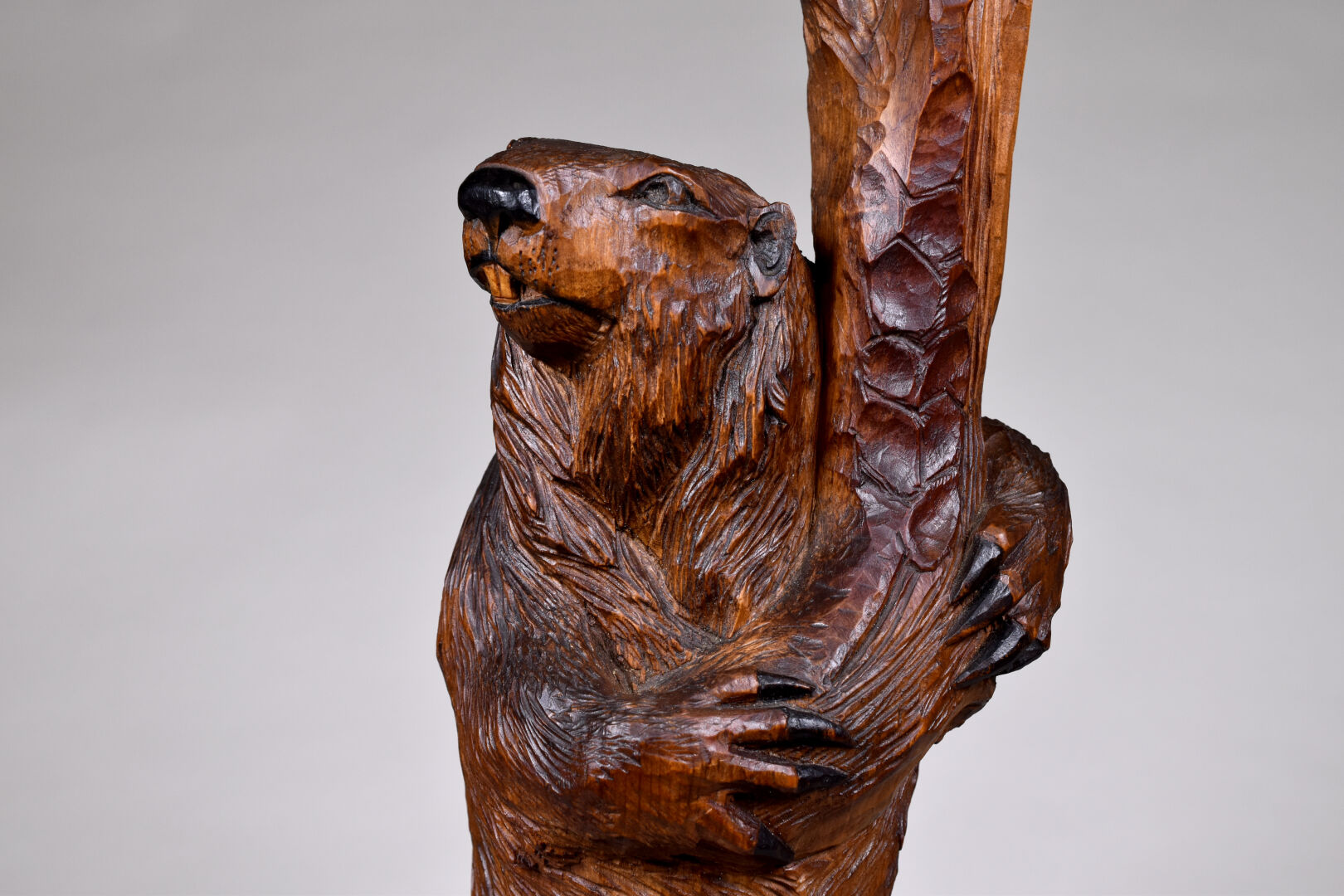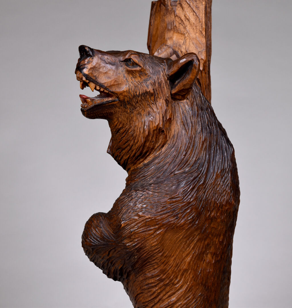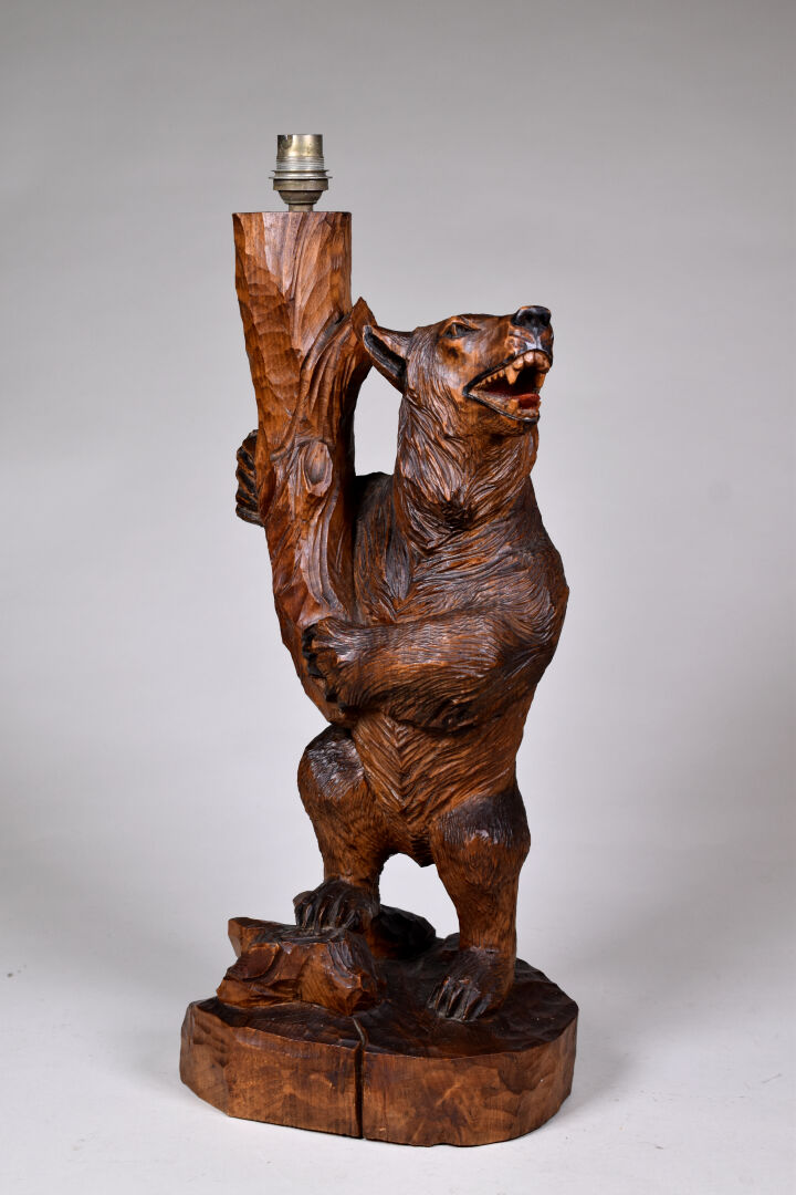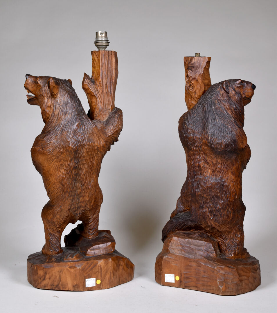 Deux lampes formant pendant en bois sculpté, l’une d’un ours et l’autre d’une marmotte. Probablement Forêt noire, XXe siècle. Électrifiées. Haut. : 47,5 et 46,5 cm.