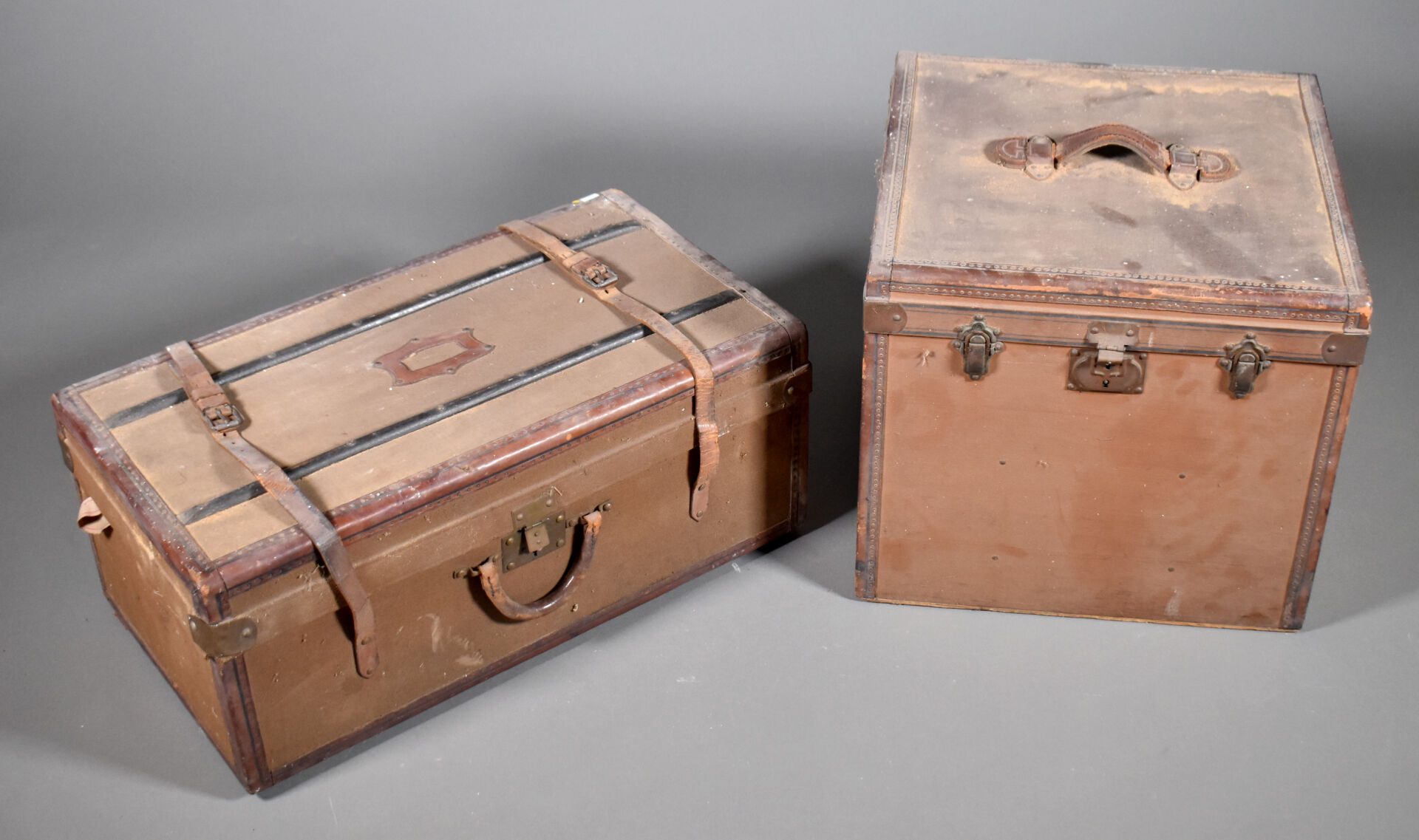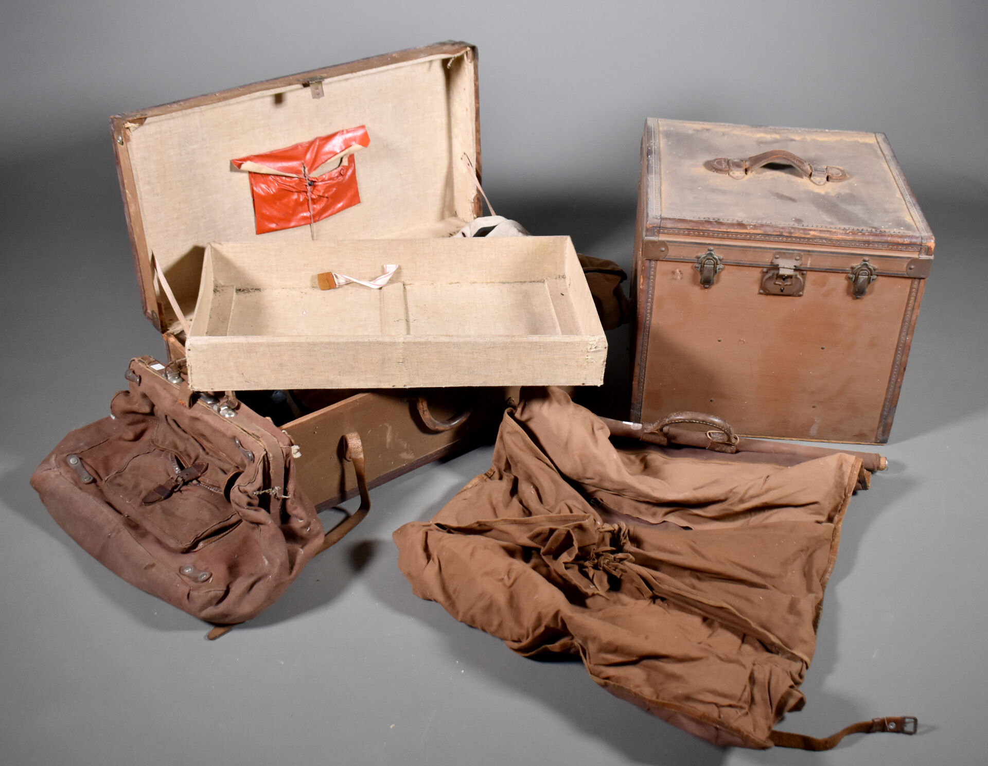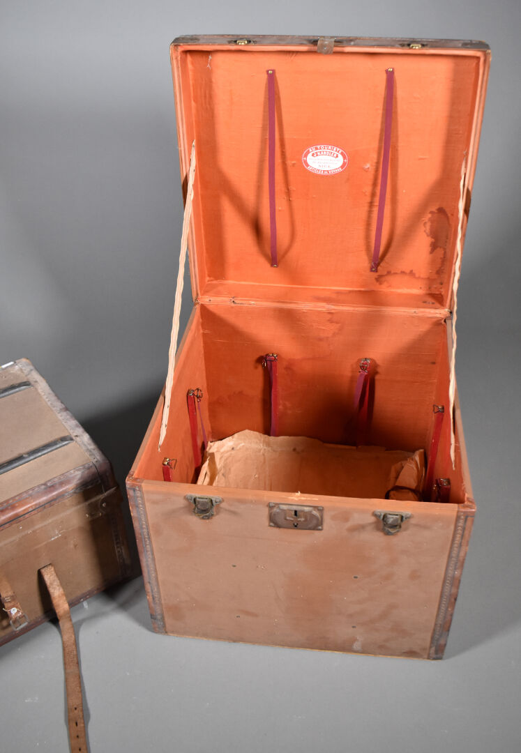 Deux malles en partie gainées de cuir fauve cloué sur les angles (usures et déchirures), toile et bois peint. On joint un ensemble de sac de voyage en toile. DIm. de la plus grande. Haut. : 41 cm – Larg. : 45 cm – Prof. : 45 cm.