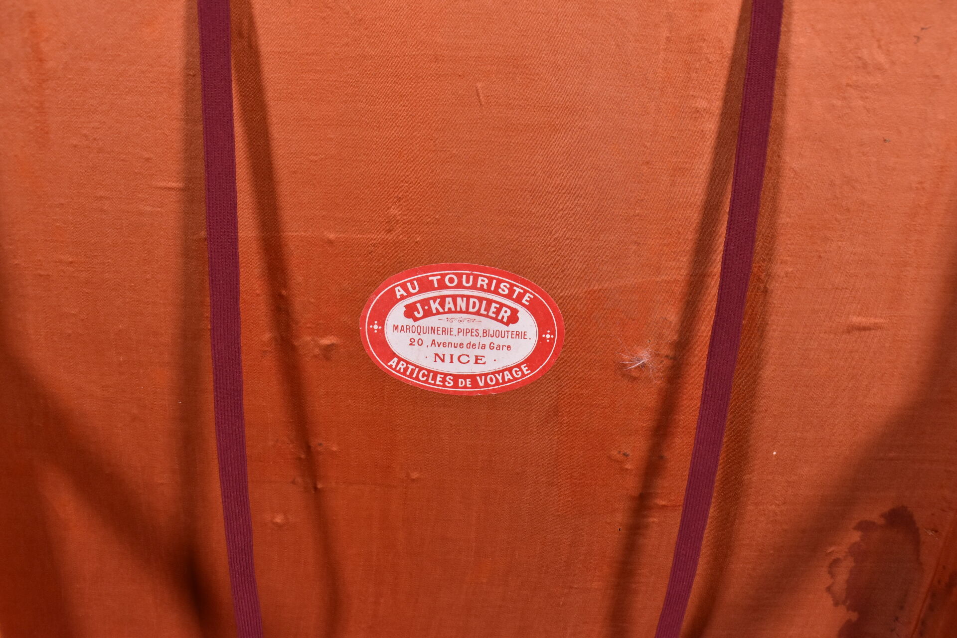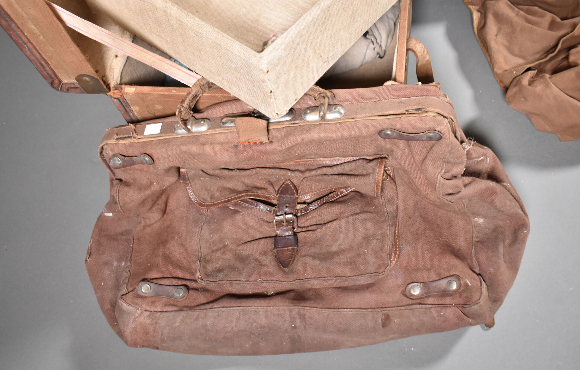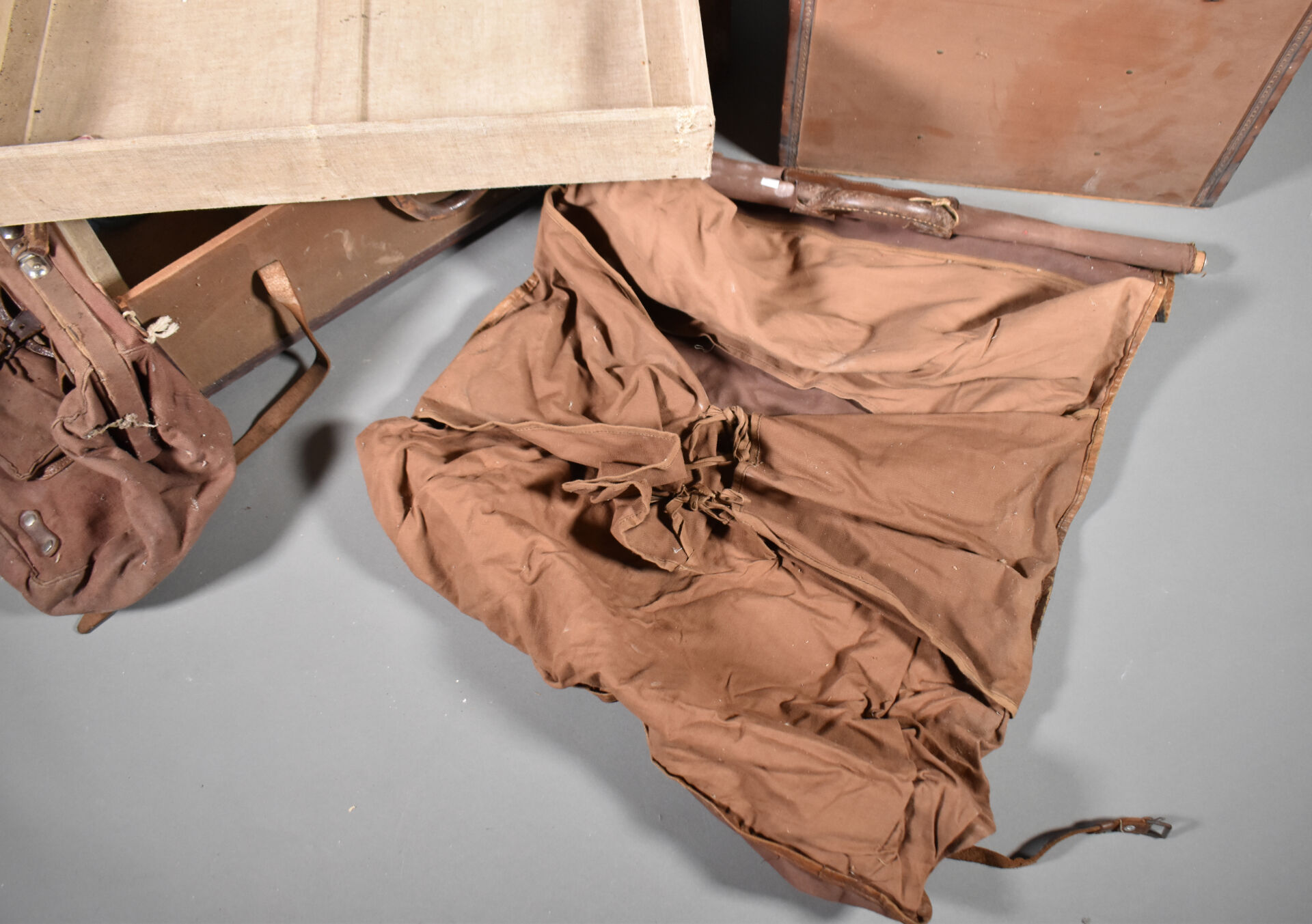 Deux malles en partie gainées de cuir fauve cloué sur les angles (usures et déchirures), toile et bois peint. On joint un ensemble de sac de voyage en toile. DIm. de la plus grande. Haut. : 41 cm – Larg. : 45 cm – Prof. : 45 cm.