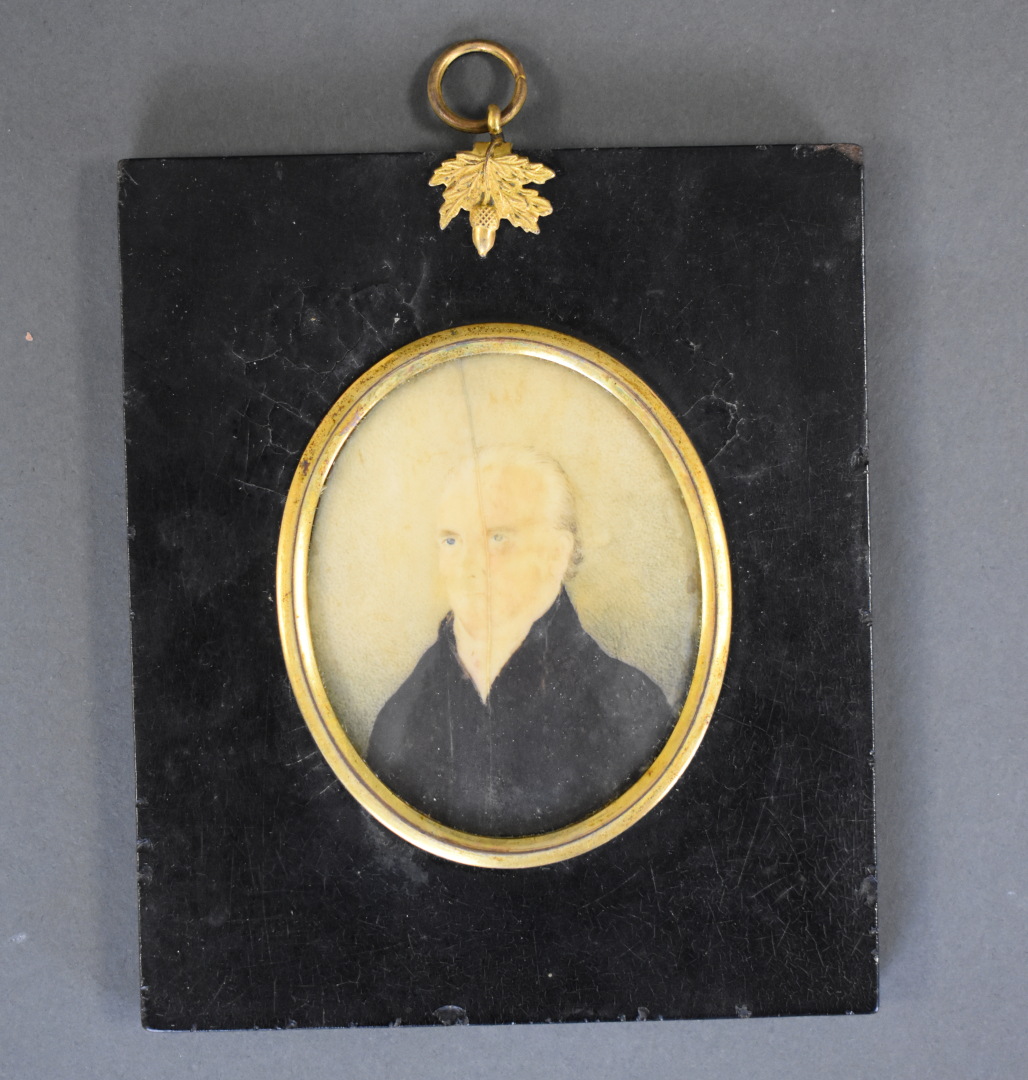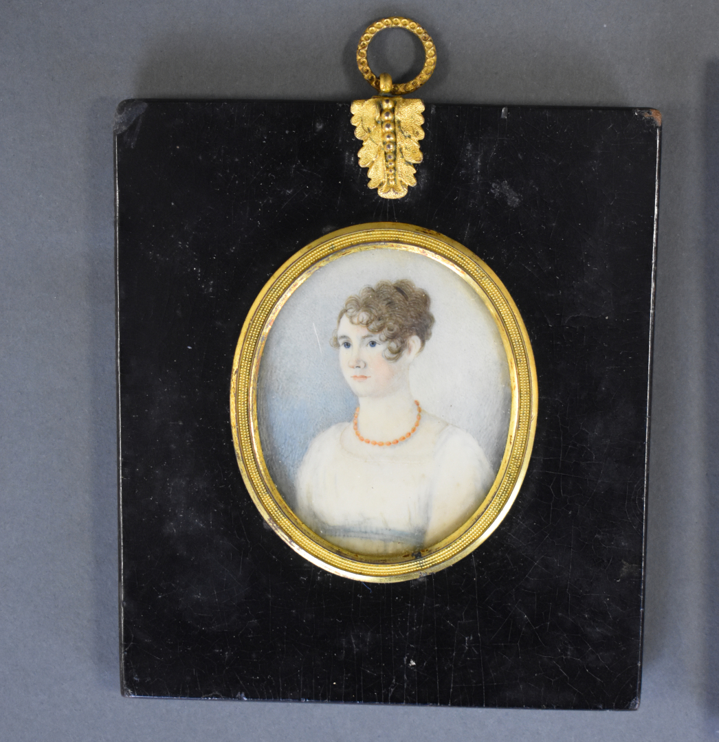 Deux miniatures sur ivoire, l’une représentant une jeune femme vêtue à la mode du premier empire, un homme (usures pour les deux, fentes pour un). On joint une aquarelle anglaise.