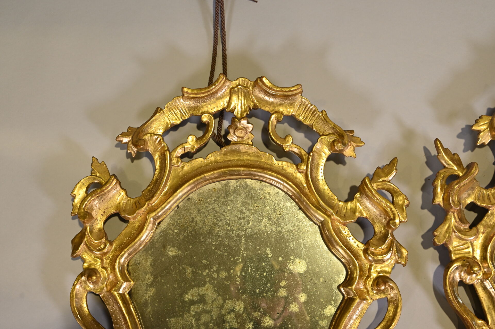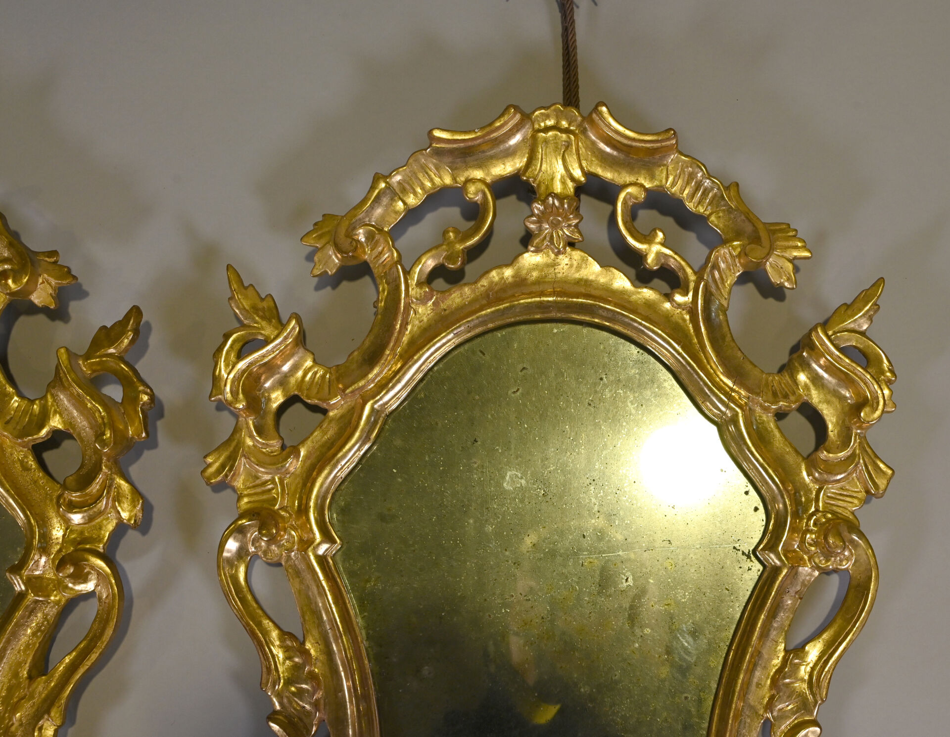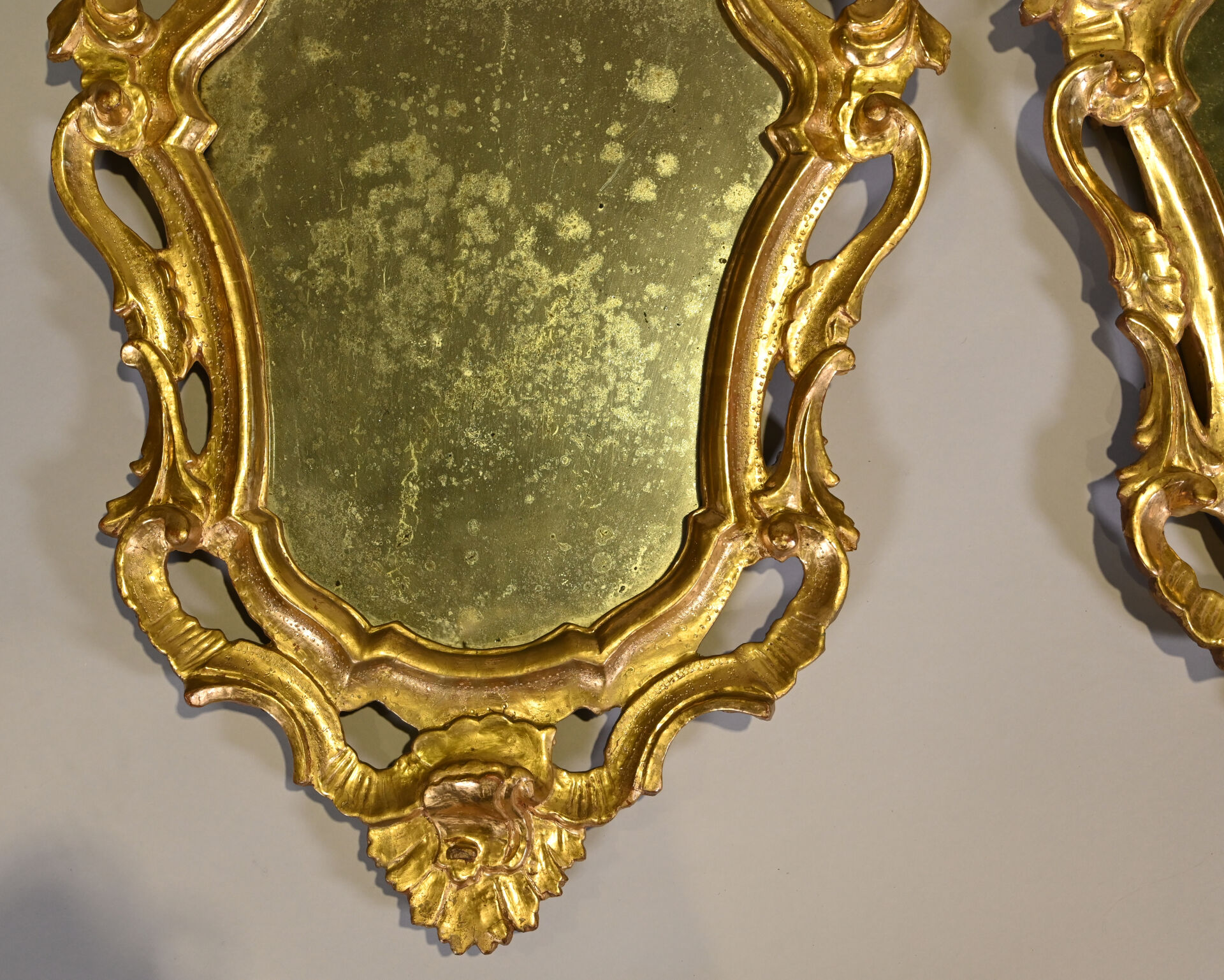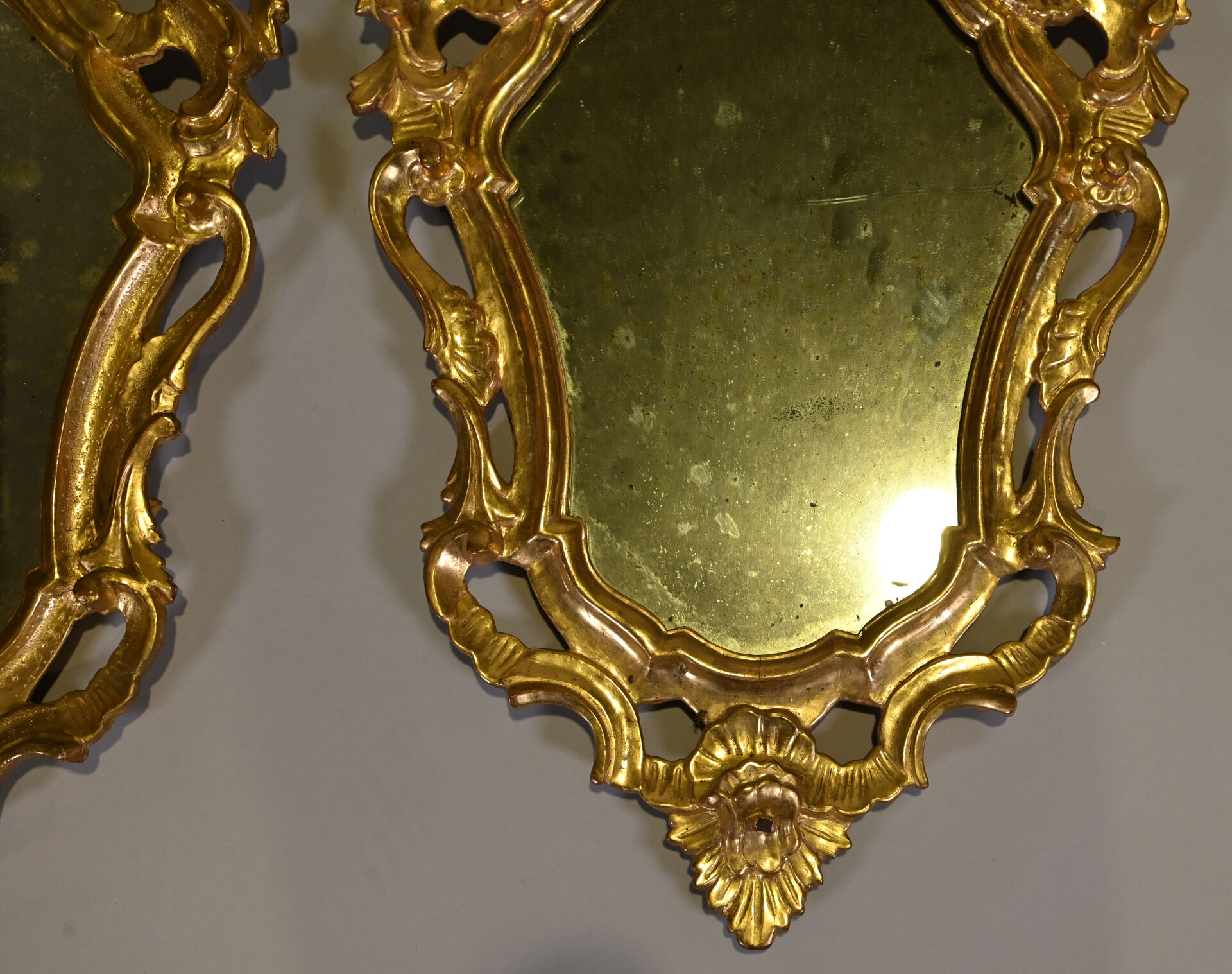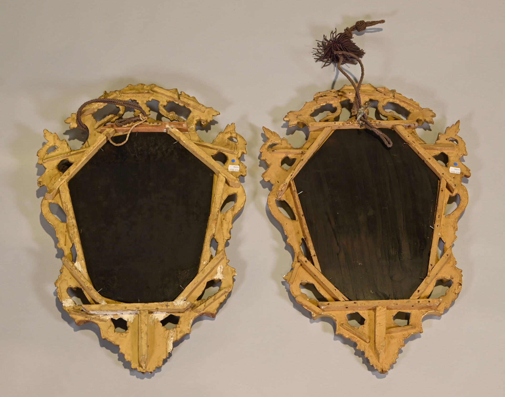 Deux miroirs en bois sculpté doré à décor de fleurs et palmettes (usures, restaurations, piqures au niveau des glaces). ;Travail probablement Vénitien du XIXe siècle. 76 x 50 cm.