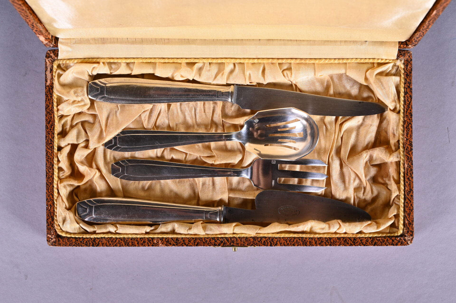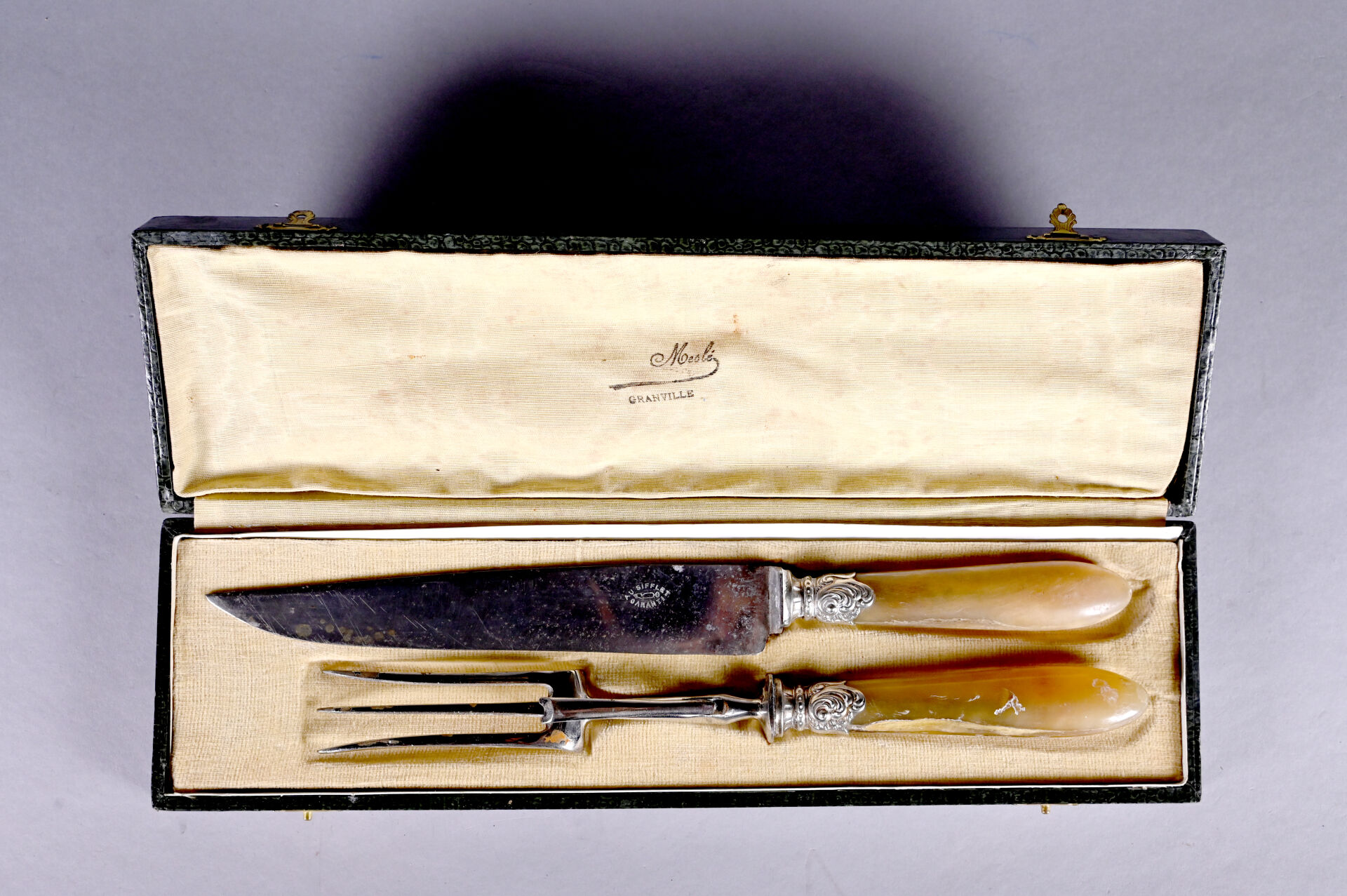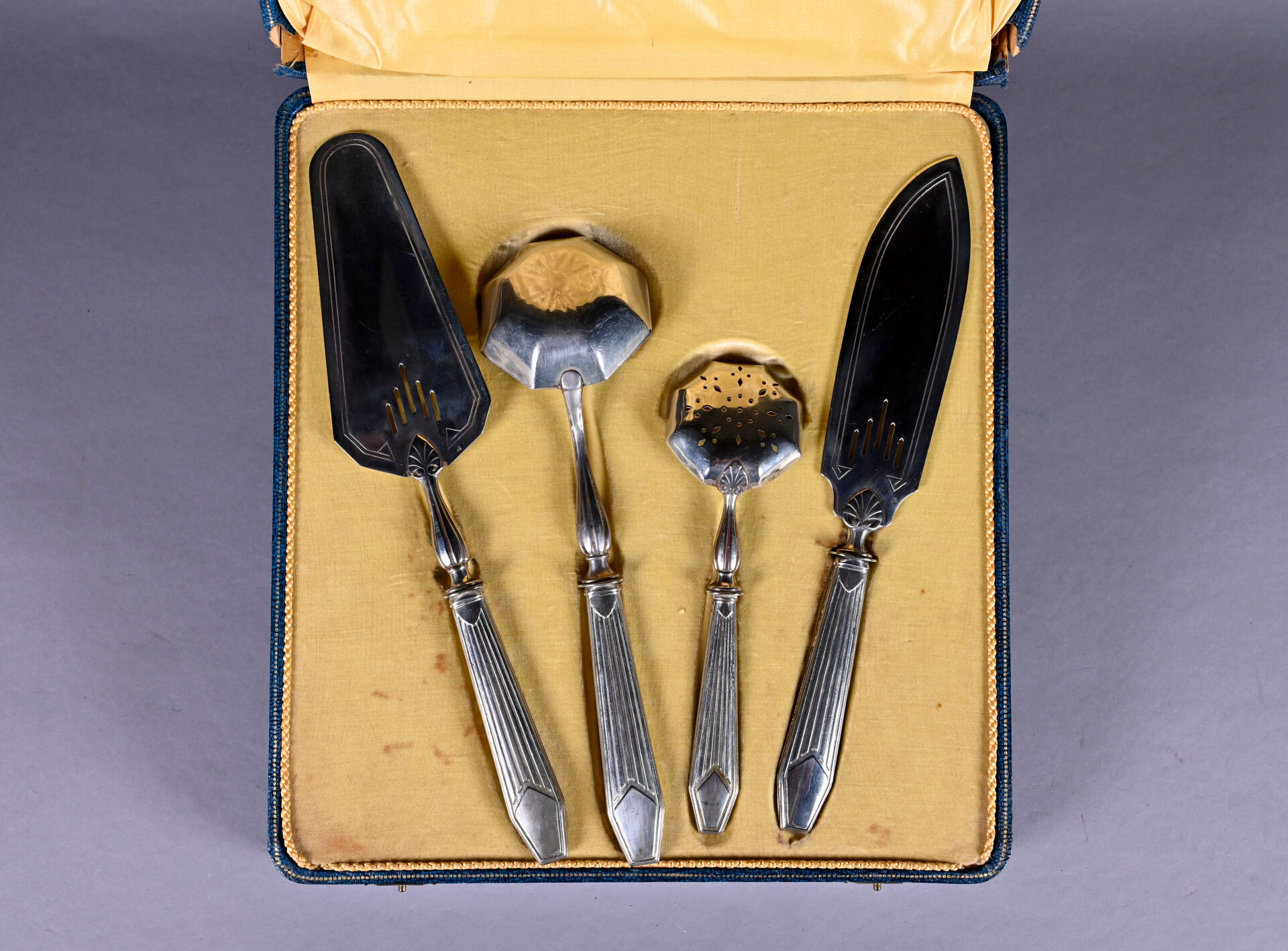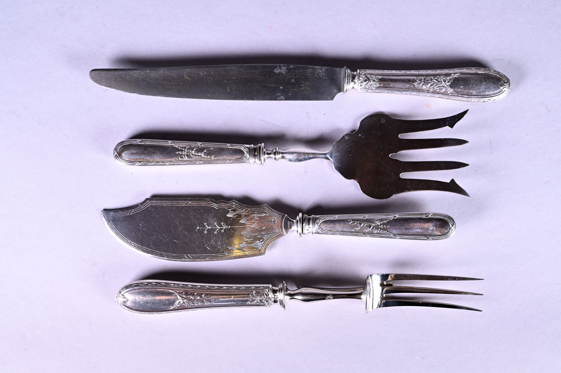 Deux paire de couverts de service à manches en argent fourré. Poids brut total : 505 g. On joint des petits couverts de service en métal argenté d’époque ART déco et un couvert de service à viande à manche en corne. Coffrets.
