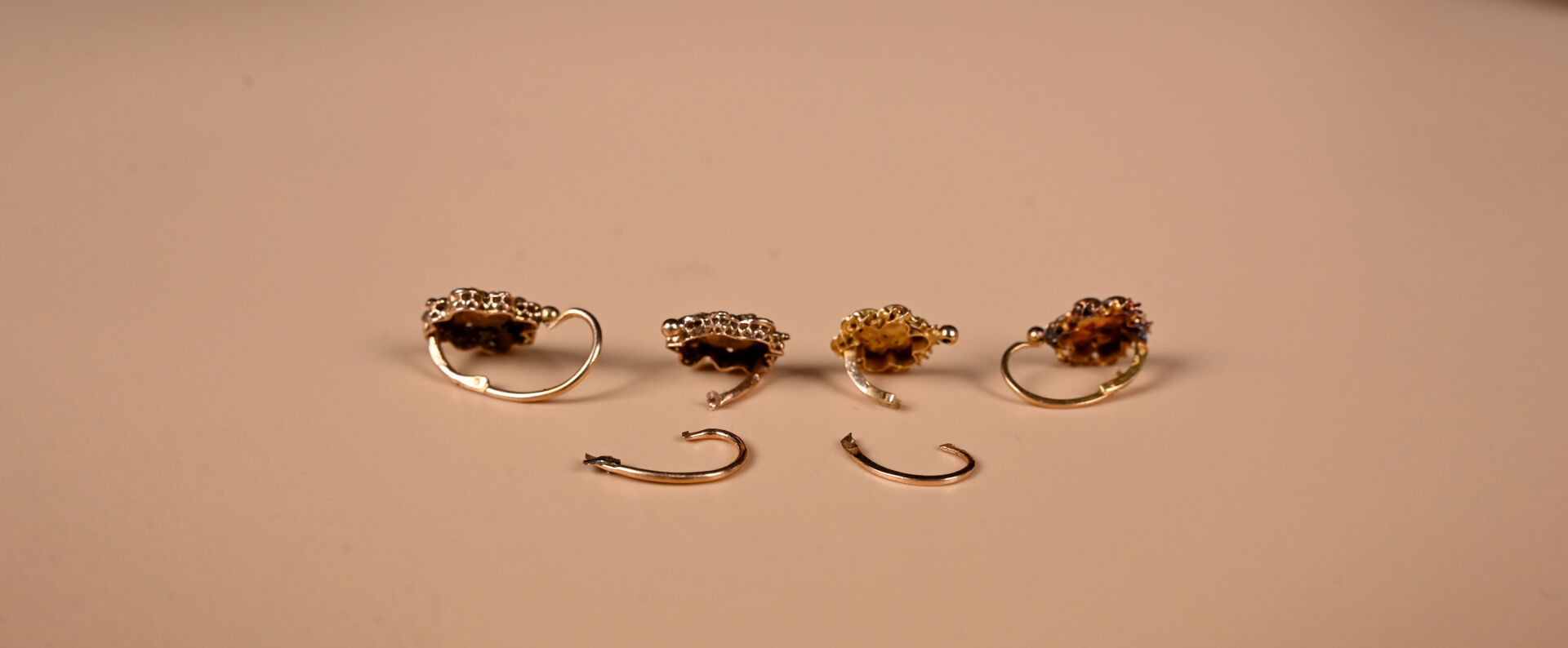 Deux paires de dormeuses (deux à réparer) en or 18K 750/1000e et petites perles (manque une). Avec un écrin (abîmé). Poids brut. : 2,5 g.
