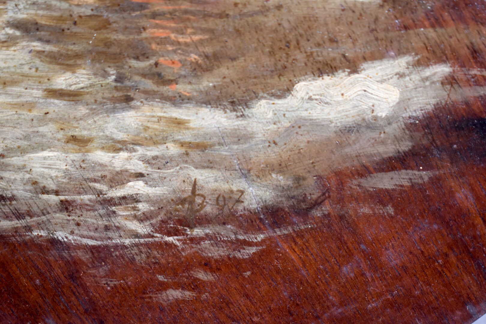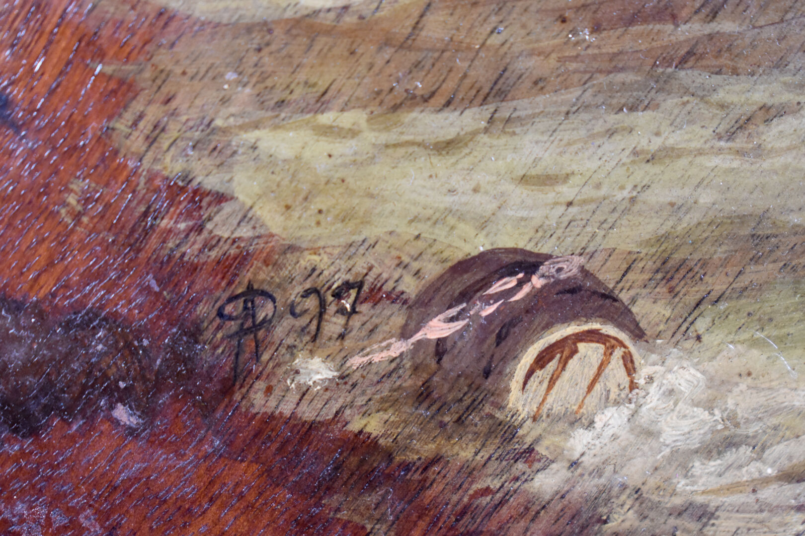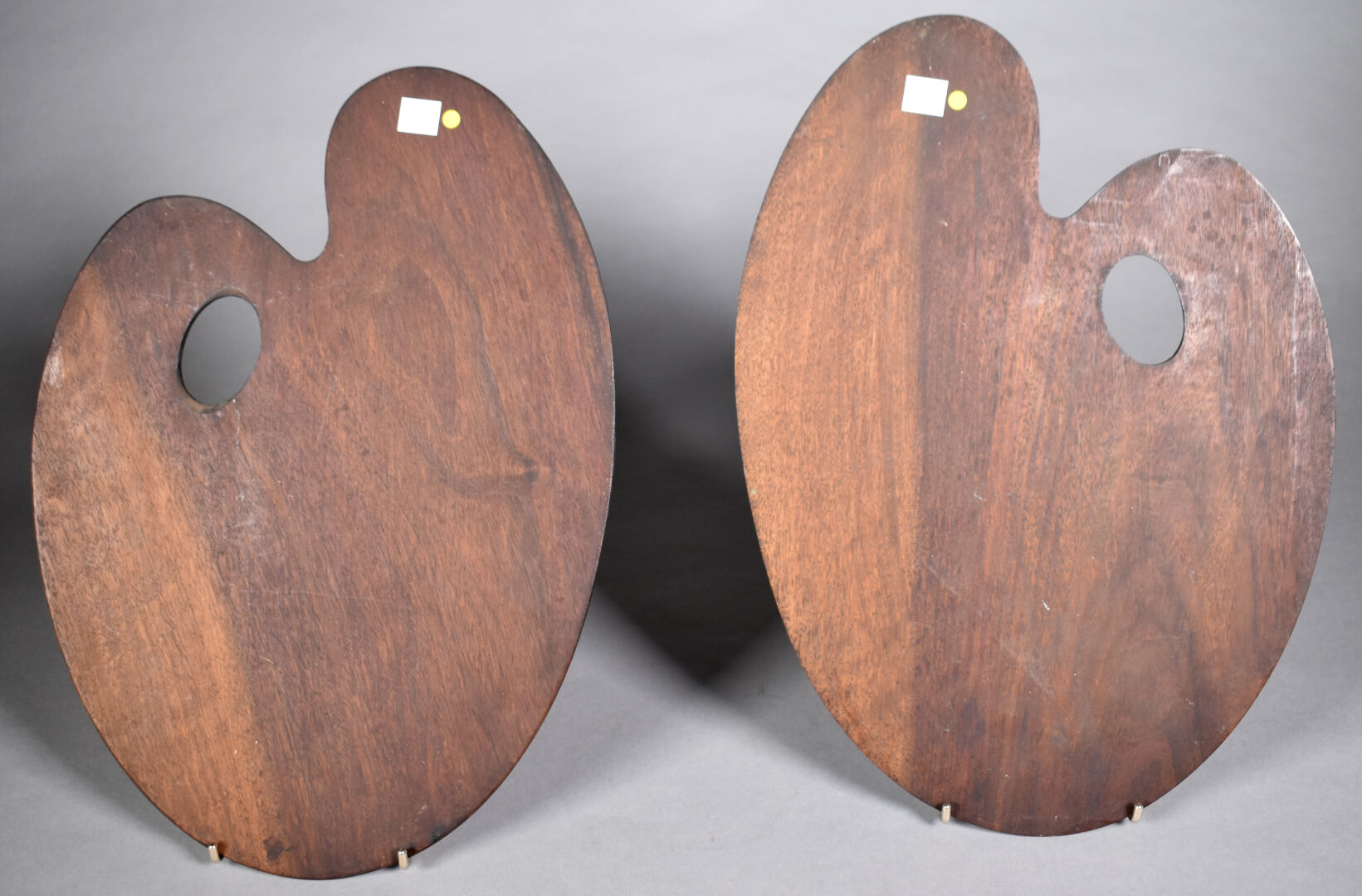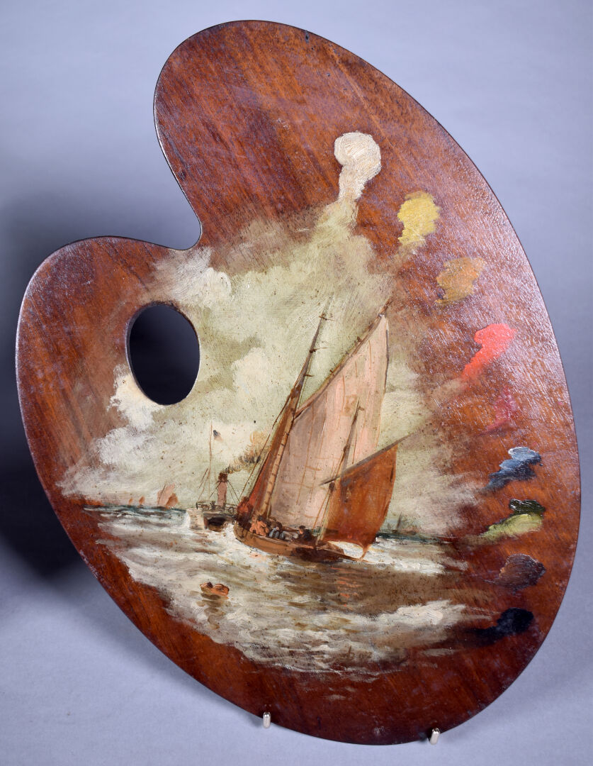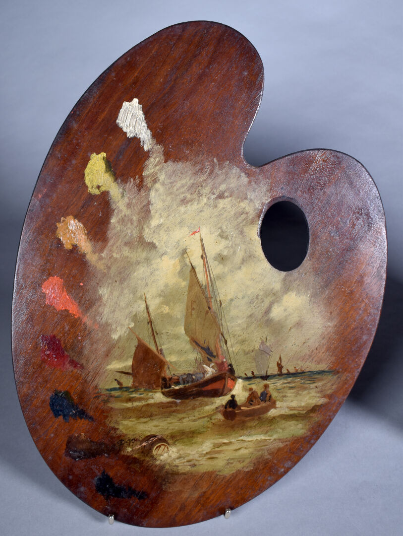 Deux palettes de peintre en acajou à décor peint de bateaux de pêche. Monogrammées et datées 97.