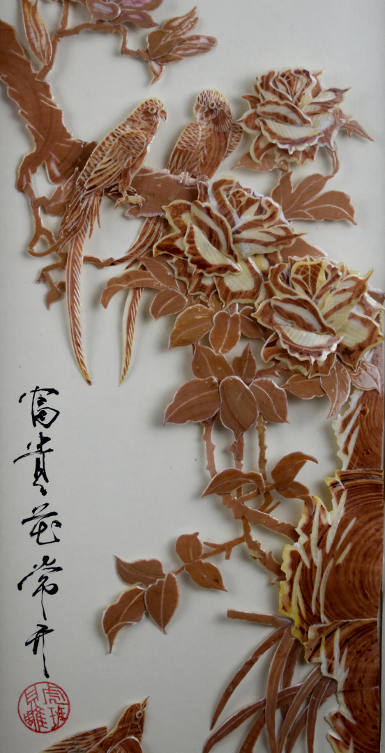 Deux panneaux à décor de coquillage sculpté représentant des oiseaux branchés. Chine, XXe siècle. 75 x 25 cm.