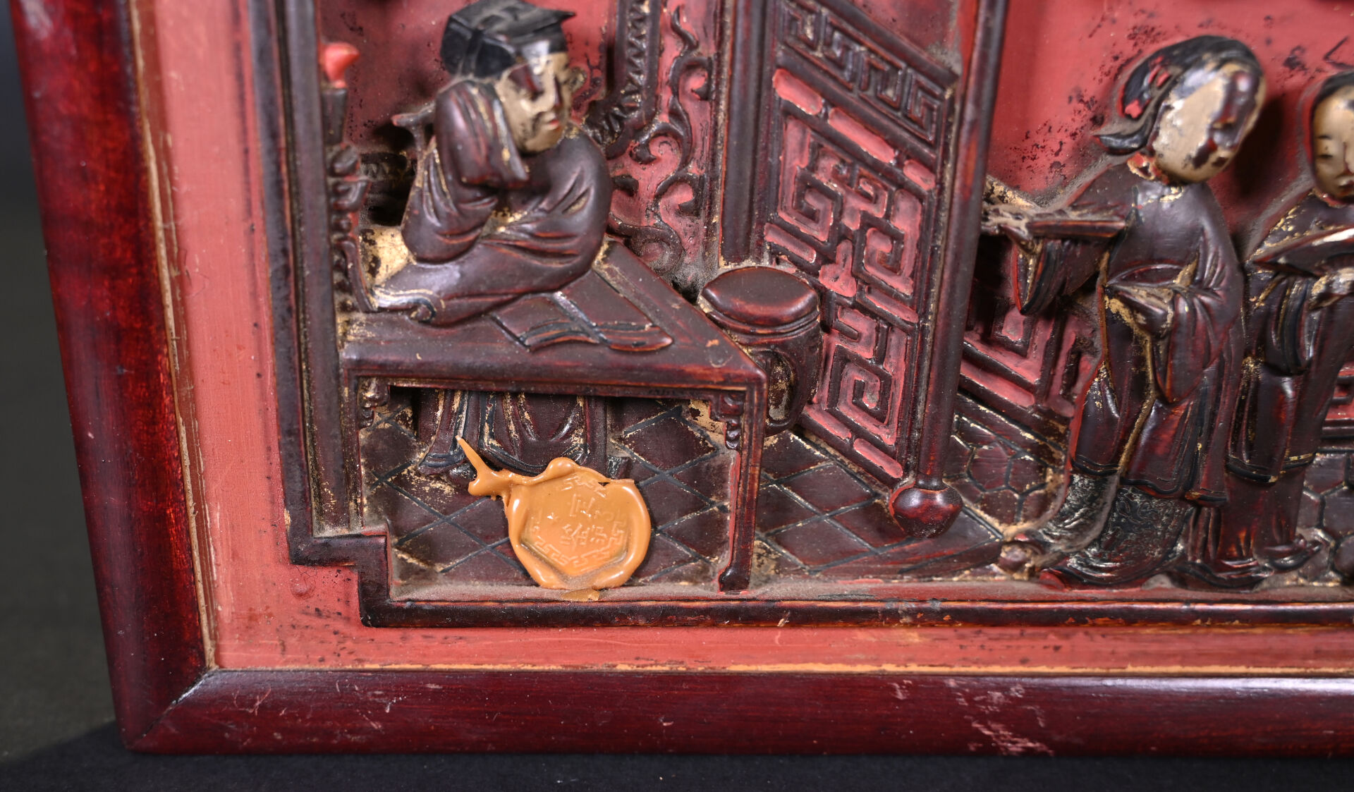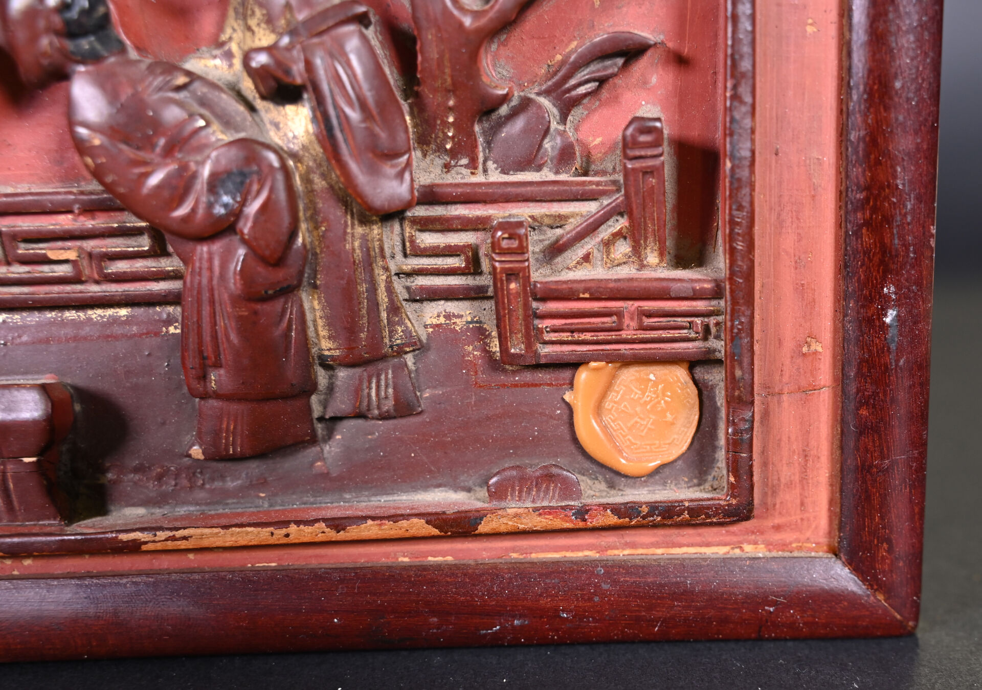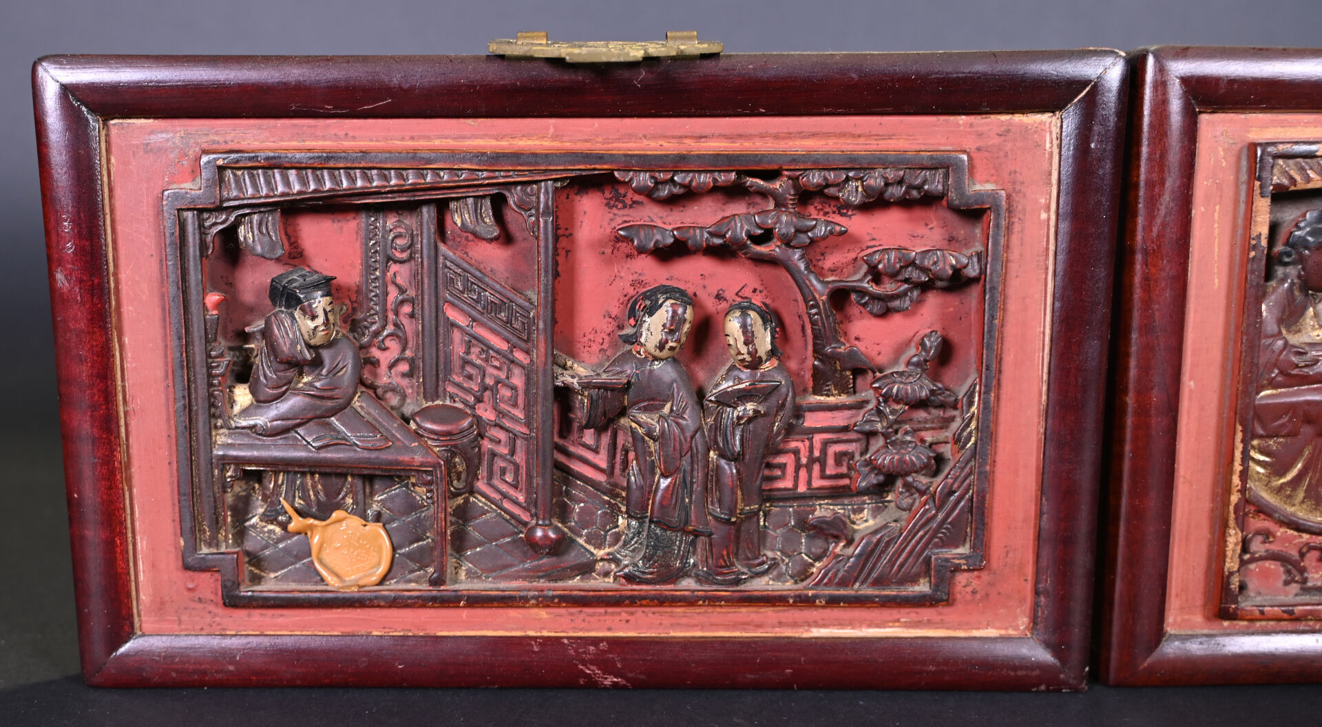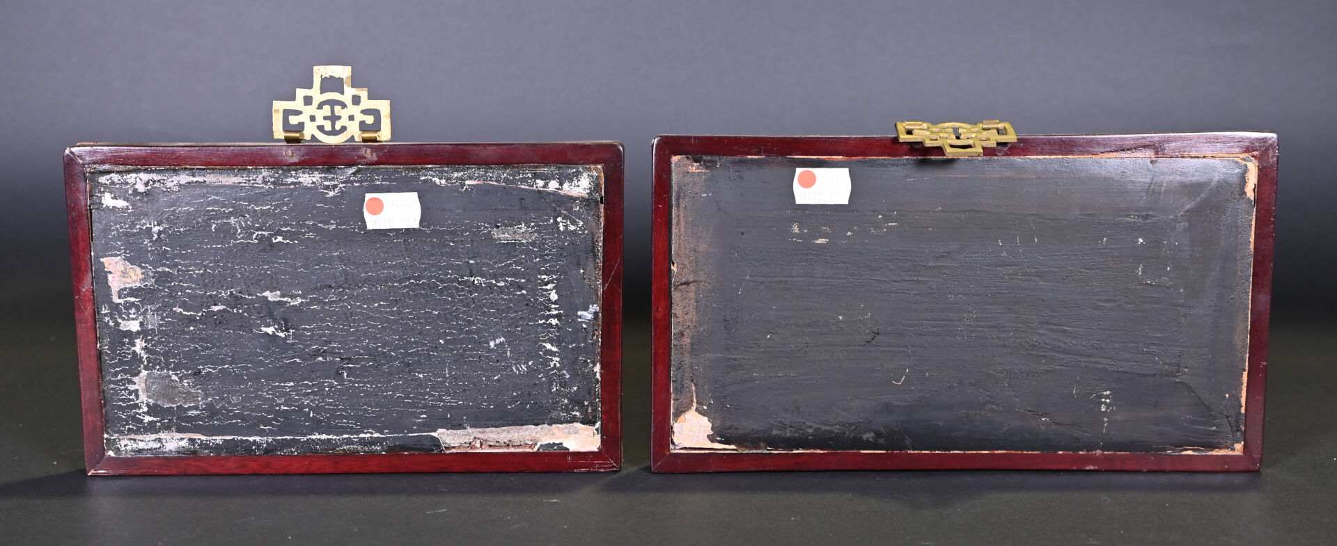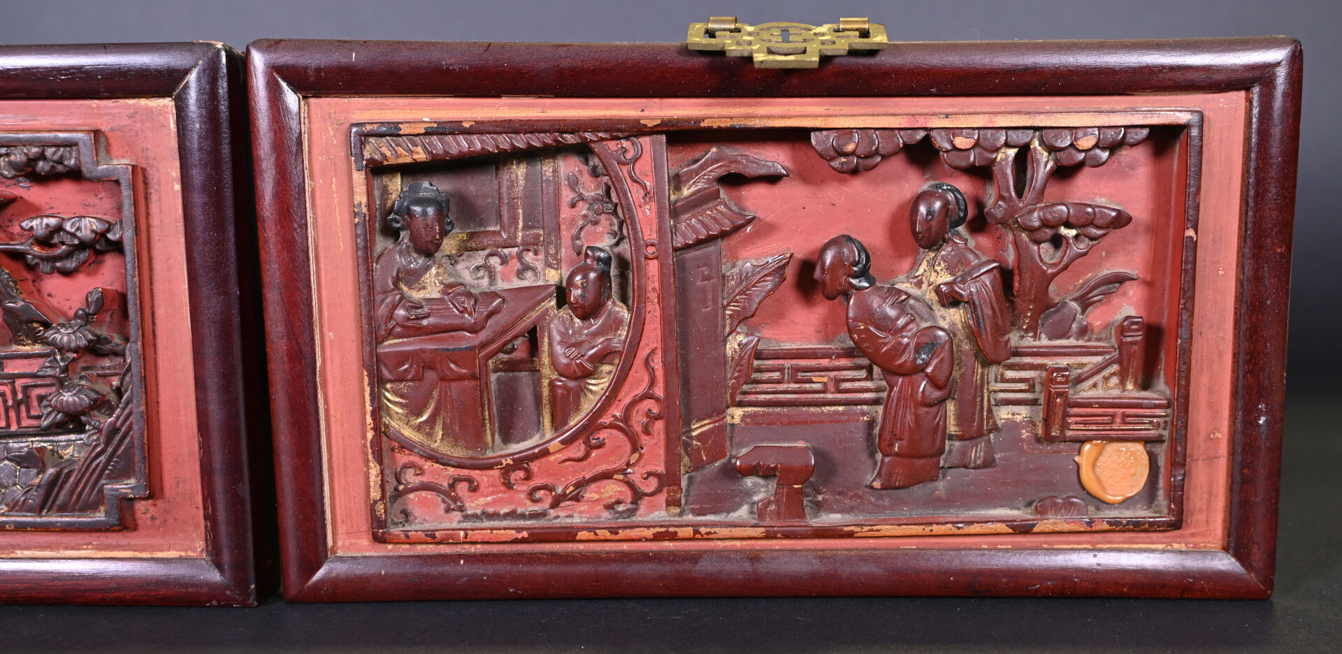 Deux panneaux rectangulaires en bois laqué rouge et or, représentant des scènes de personnages, l’un sur une terrasse, l’autre dans un jardin (éclats, usures). Chine, travail de Ningbo, XIXe siècle. 15,5 x 28,5 cm et 15,5 x 25,5 cm.