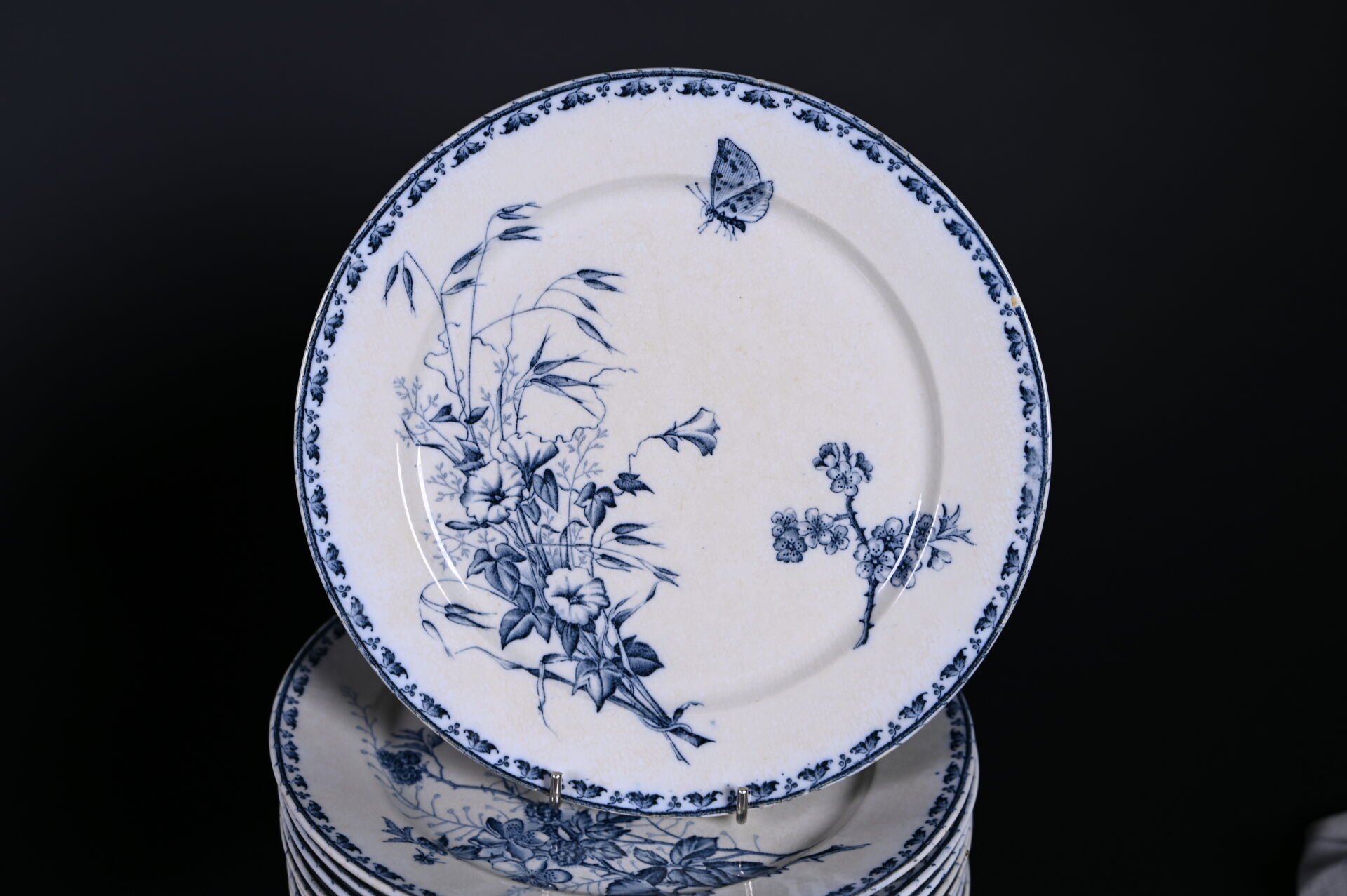 – TERRE DE FER service Carmen à décor en bleu de fleurs et papillons soit 8 assiettes à entremets, 15 assiettes plates