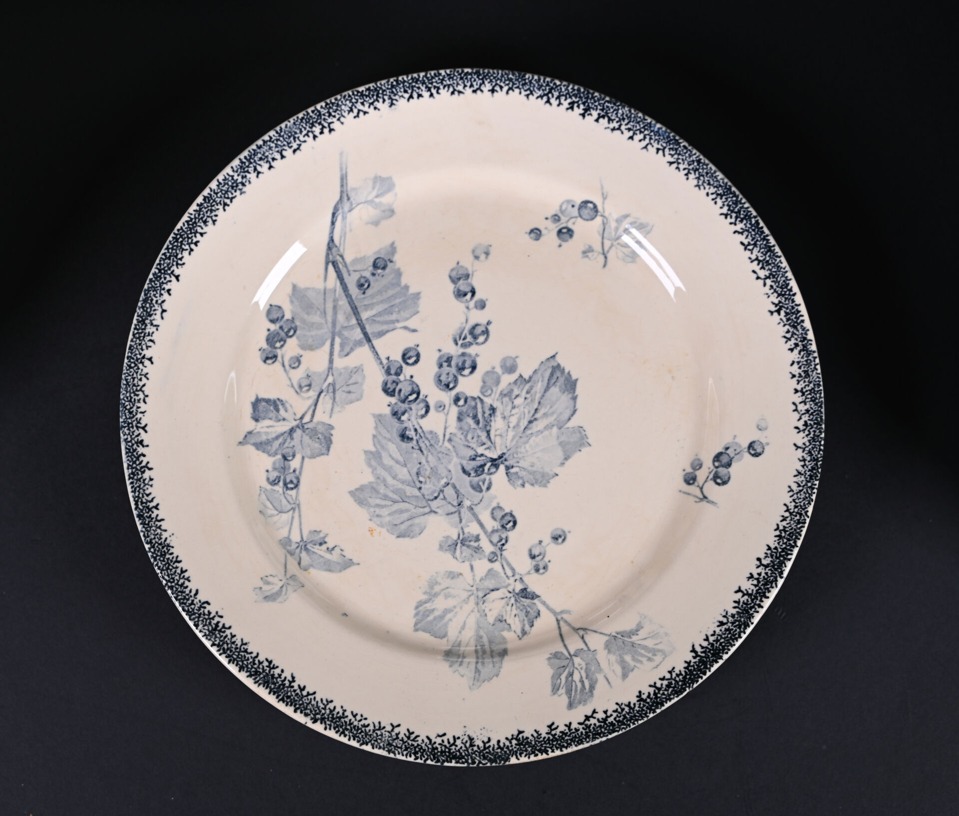 – SARREGUEMINES service Groseilles à décor en bleu de branches de groseilles soit 2 jattes , 2 plats de service circulaires, un plat à gâteau (usures et petites égrenures sur l’ensemble).