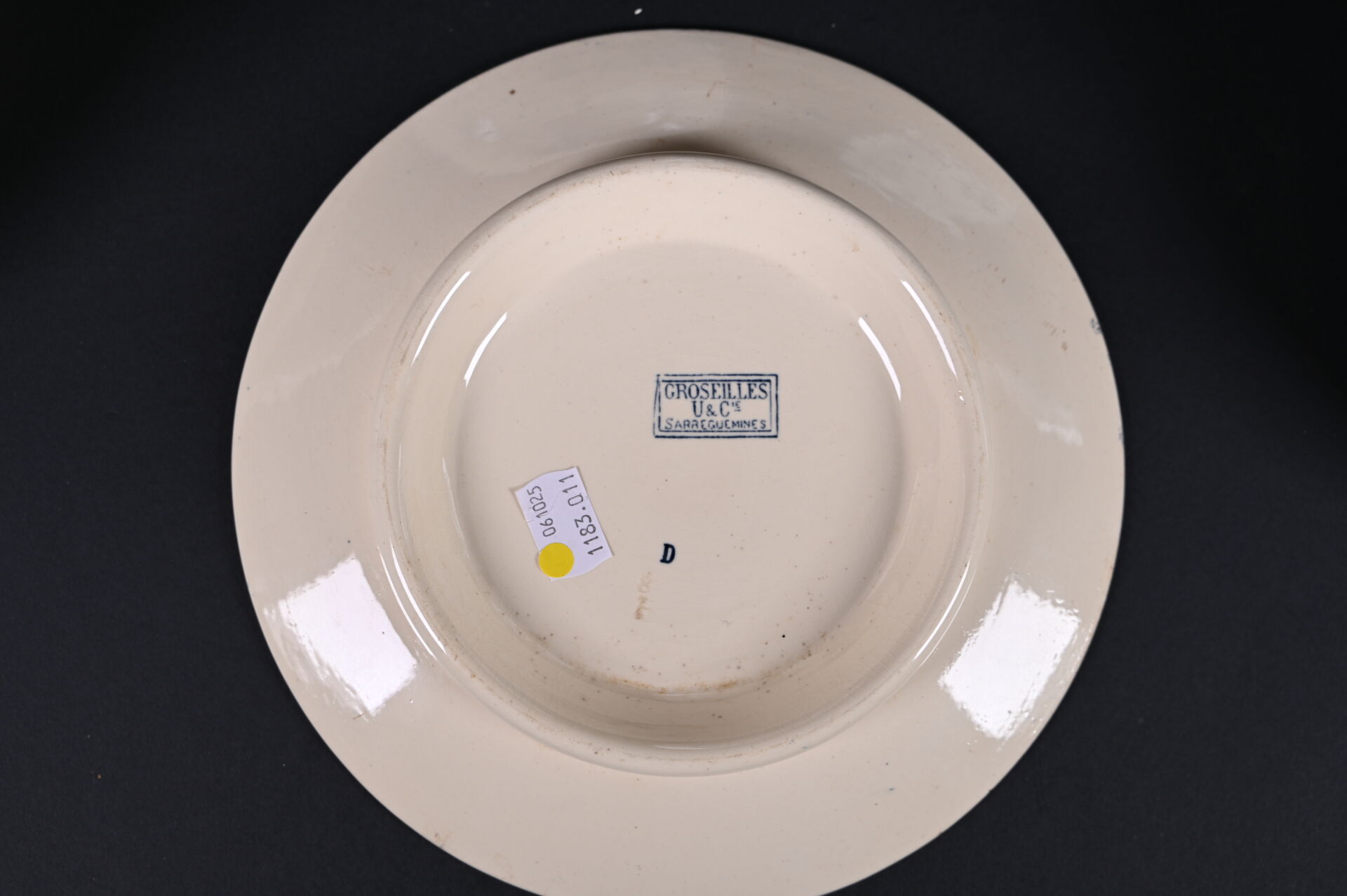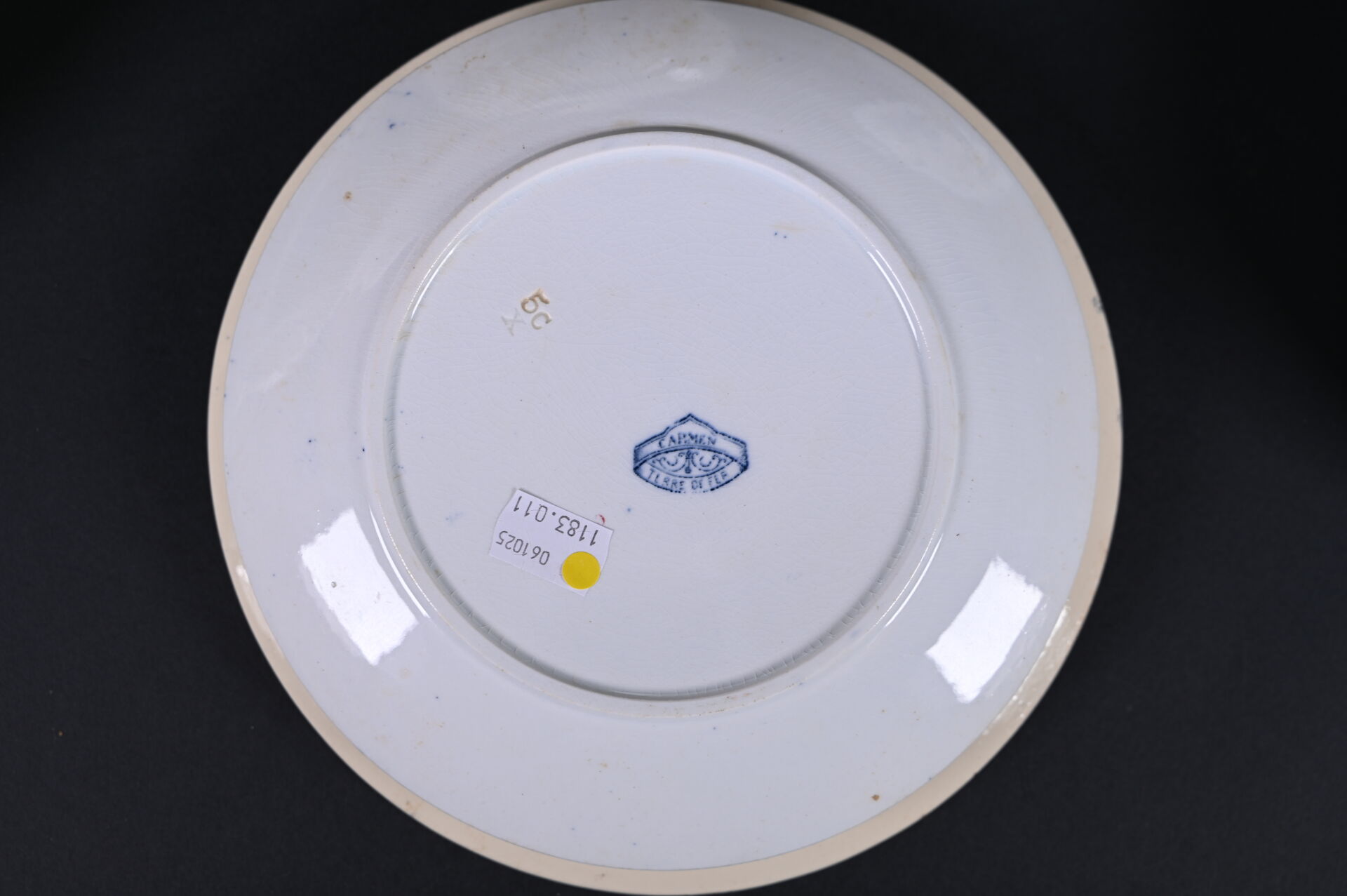 Deux parties de services de table en faïence soit : – TERRE DE FER service Carmen à décor en bleu de fleurs et papillons soit 8 assiettes à entremets, 15 assiettes plates – SARREGUEMINES service Groseilles à décor en bleu de branches de groseilles soit 2 jattes , 2 plats de service circulaires, un plat à gâteau (usures et petites égrenures sur l’ensemble). Marqués.