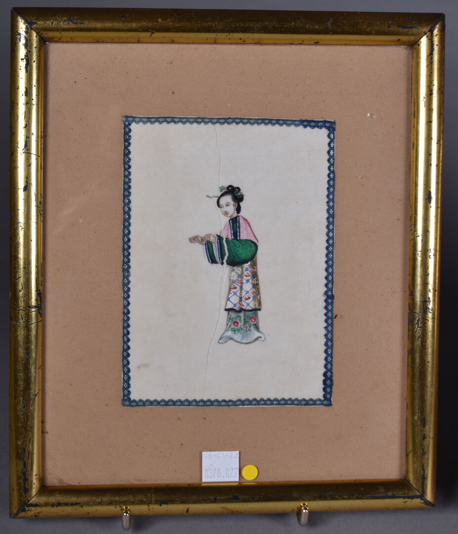 Deux petites peintures sur papier de soie figurant des femmes en costume (les deux déchirés au milieu). Chine, fin du XIXe siècle. 14 x 10 cm.