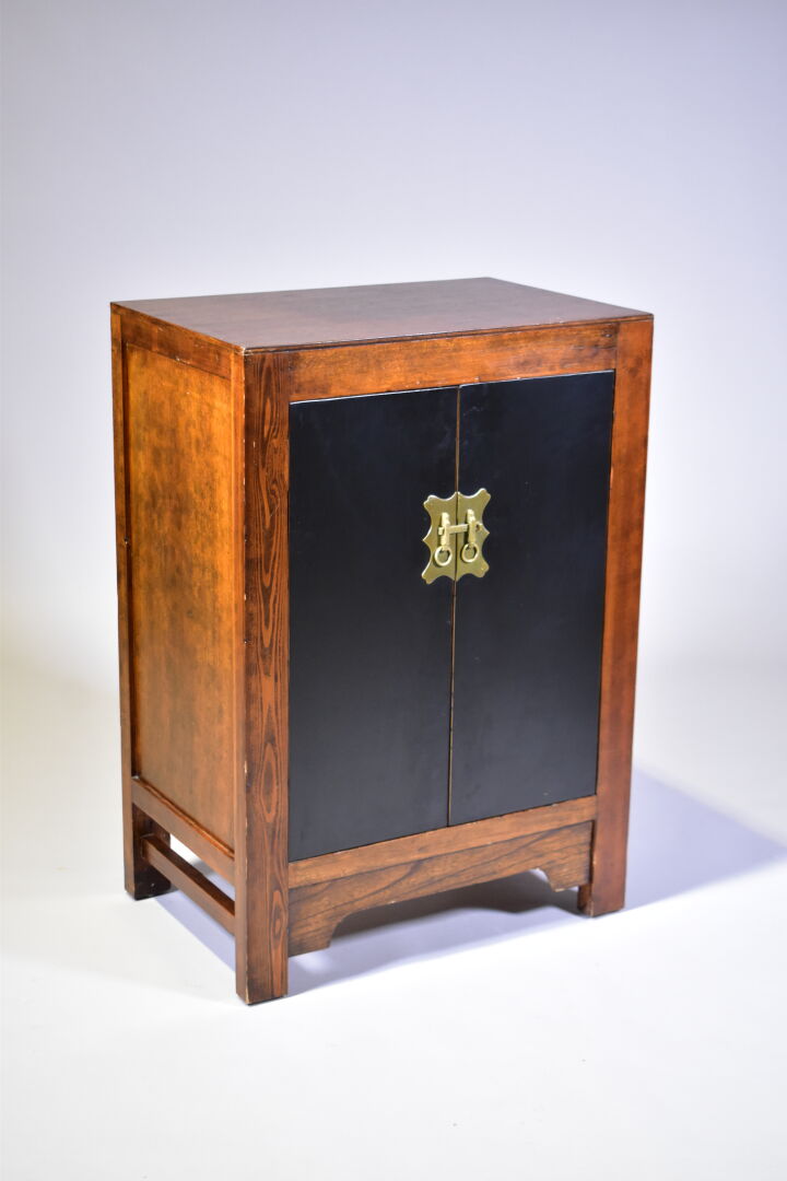Deux petits cabinet, un en bois exotique à panneaux laqués noirs et un en bois teinté rouge. Dans le goût Chinois, XXe siècle. Haut. : 86 cm – Larg. : 60 cm – Prof. : 40 cm (pour le petit) et Haut. : 117 cm – Larg. : 52 cm – Prof. : 36 cm.