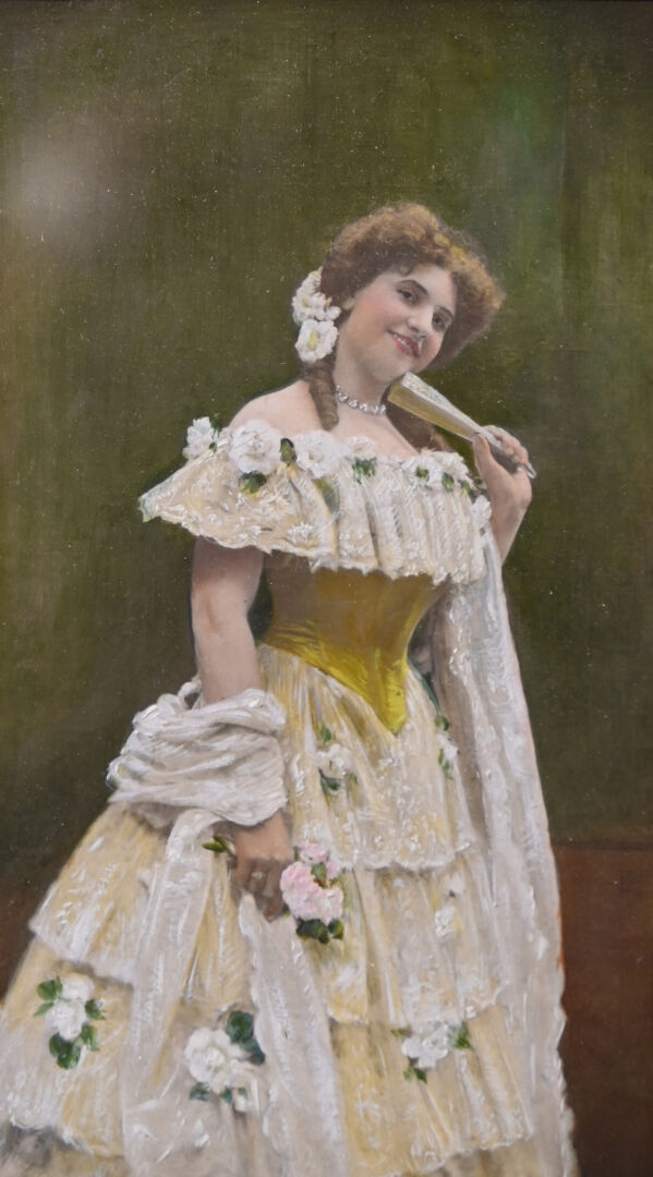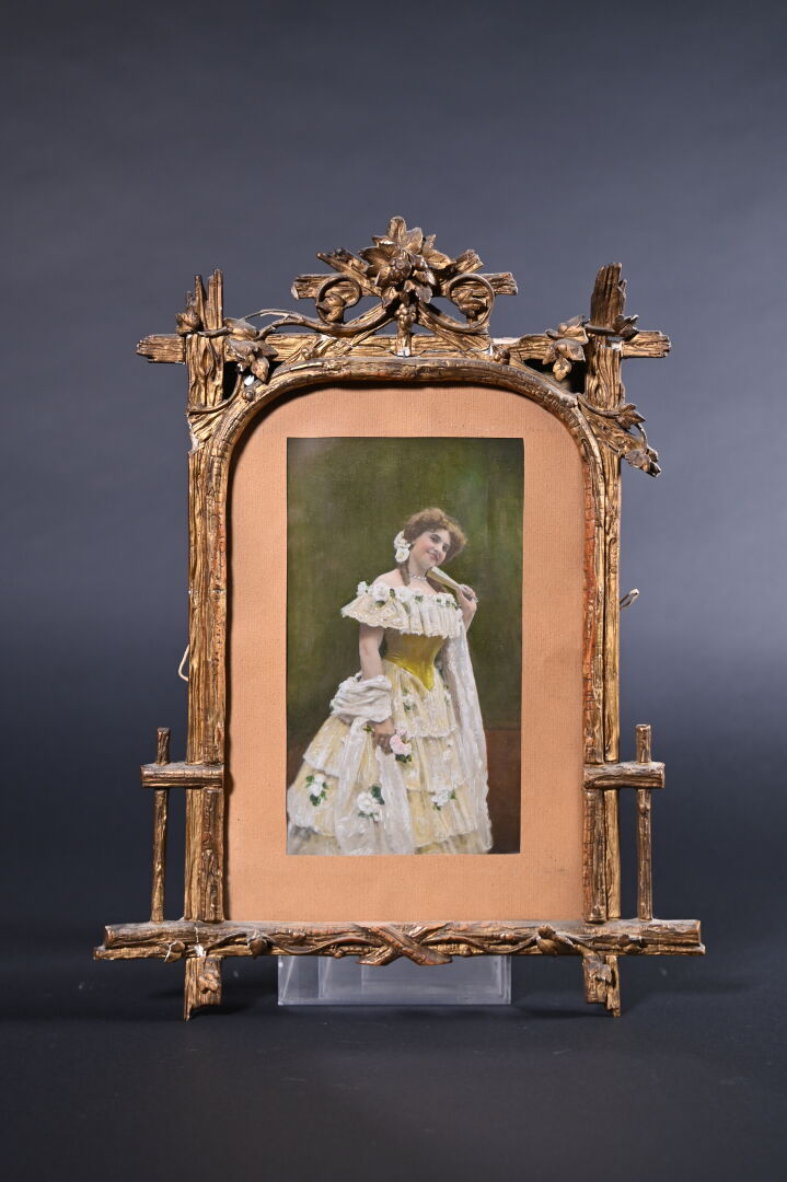 Deux photos réhaussées à la gouache des cadres en bois stuqué doré (éclats et petits manques). Vers 1900. 41 x 32 cm.