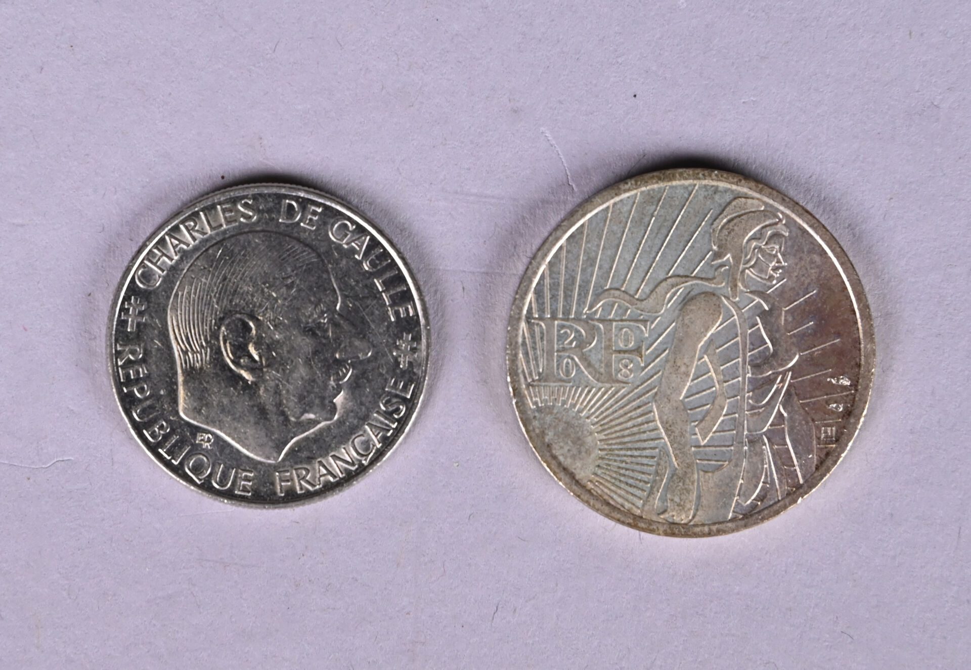 Deux pièces en argent soit 1 franc Charles de Gaulle et 5 euros.