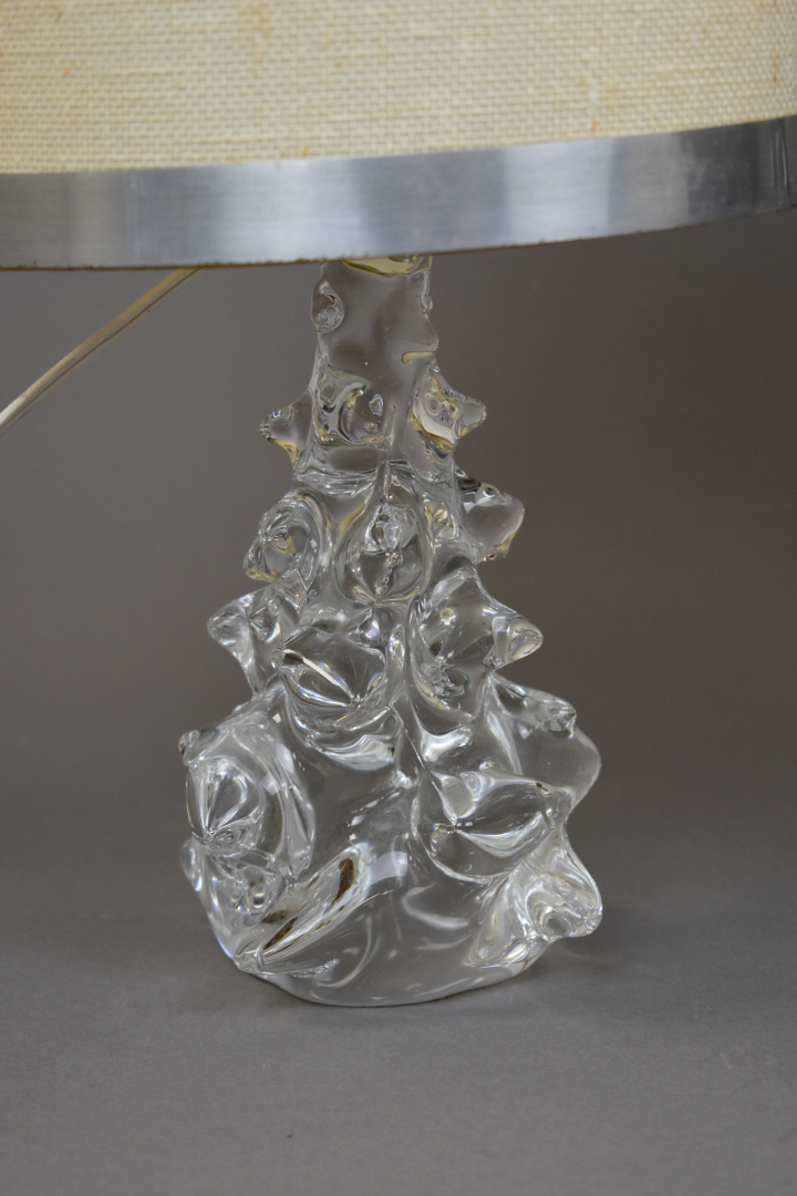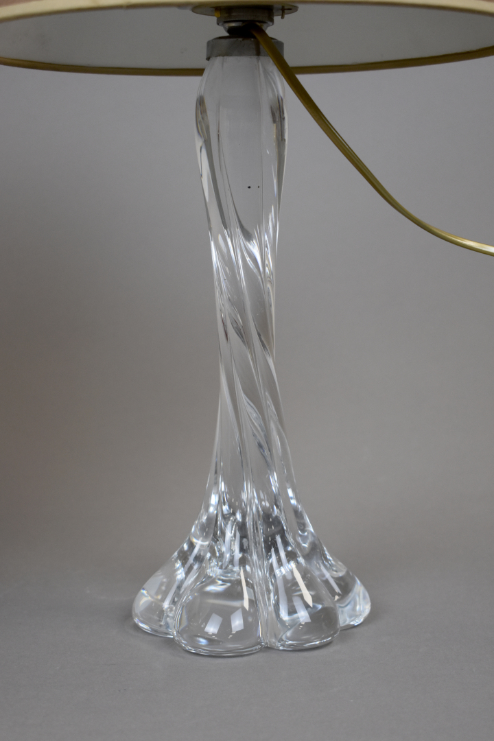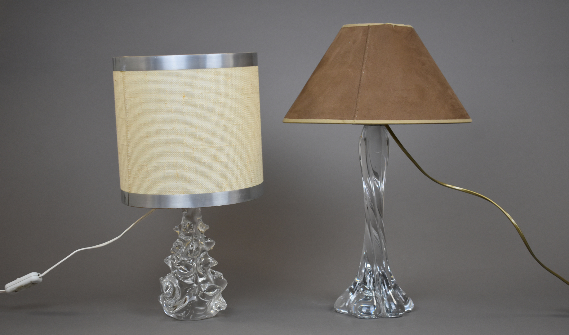 Deux pieds de lampe en cristal moulé, l’un torsadé, l’autre à pointes. Milieu du XXe siècle. Haut. : 25 cm et Haut. : 35 cm (sans abat-jour).