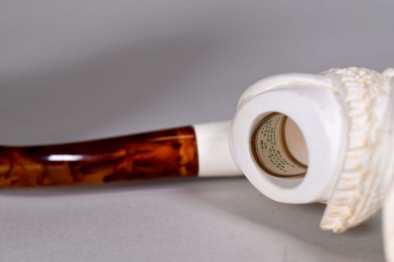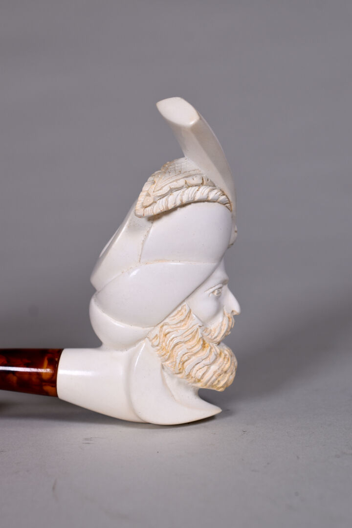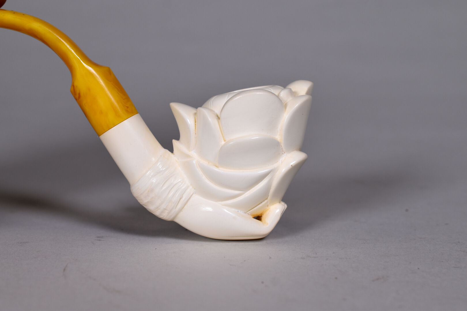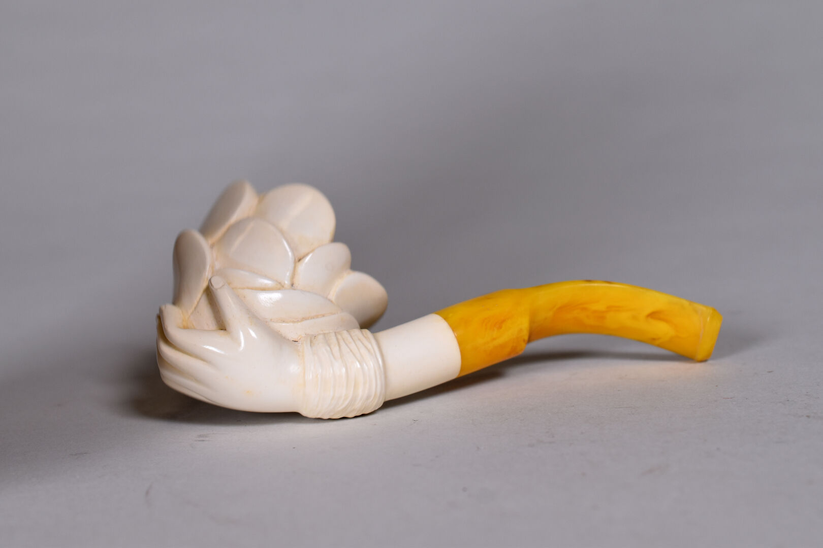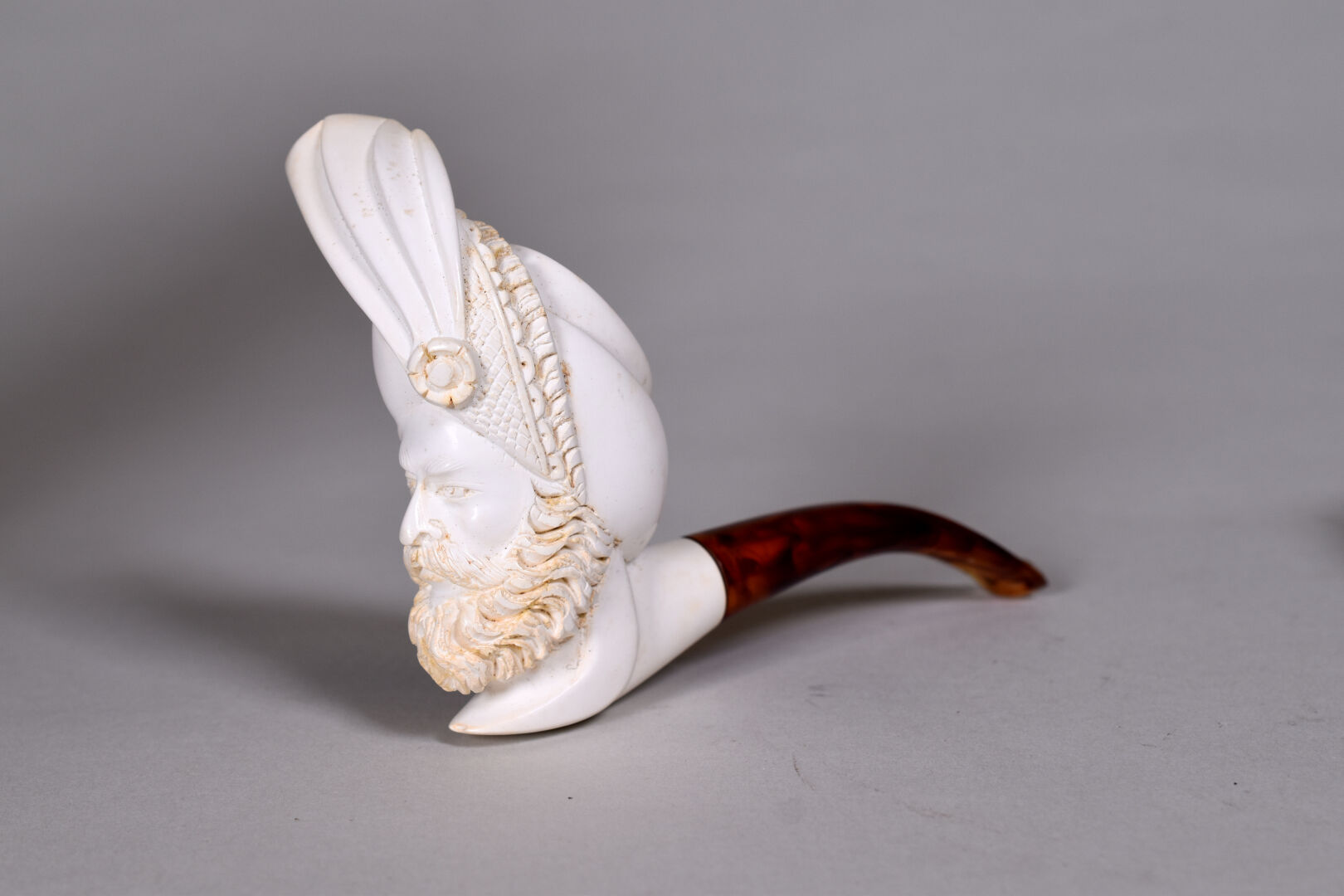 Deux pipes en écume de mer sculptée et bakélite. L’une à décor d’un homme au turban et l’autre à décor d’une main tenant une fleur. XXe siècle. Etui. Long. : 13 cm et 15 cm