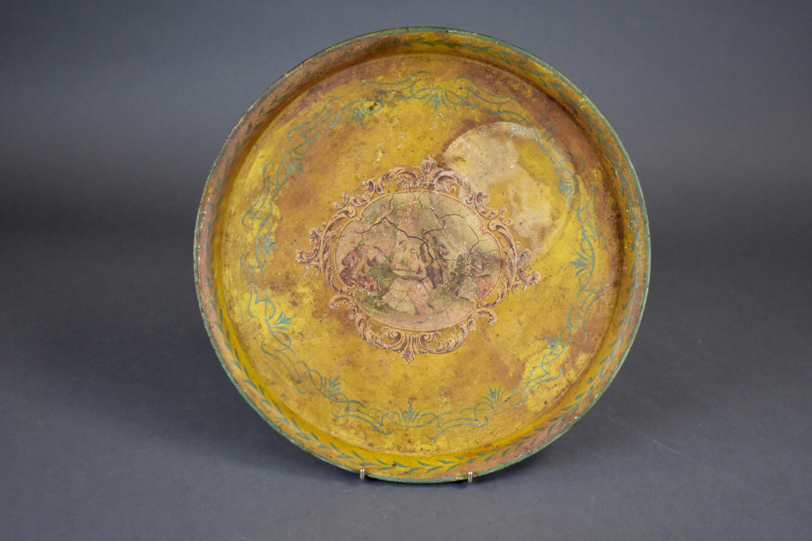 Deux plateaux circulaire en tôle peinte et lithographiée de personnages dans le goût du XVIIIe sur fond jaune (usures, taches). Travail probablement italien, vers 1920. Diam. : 40 cm.