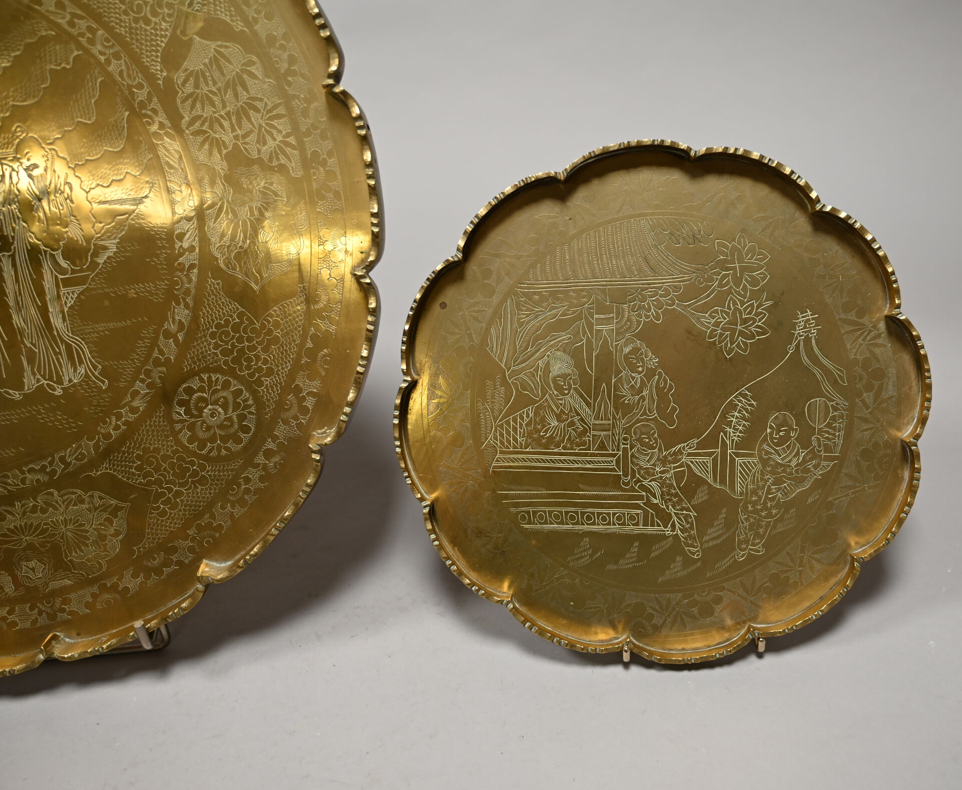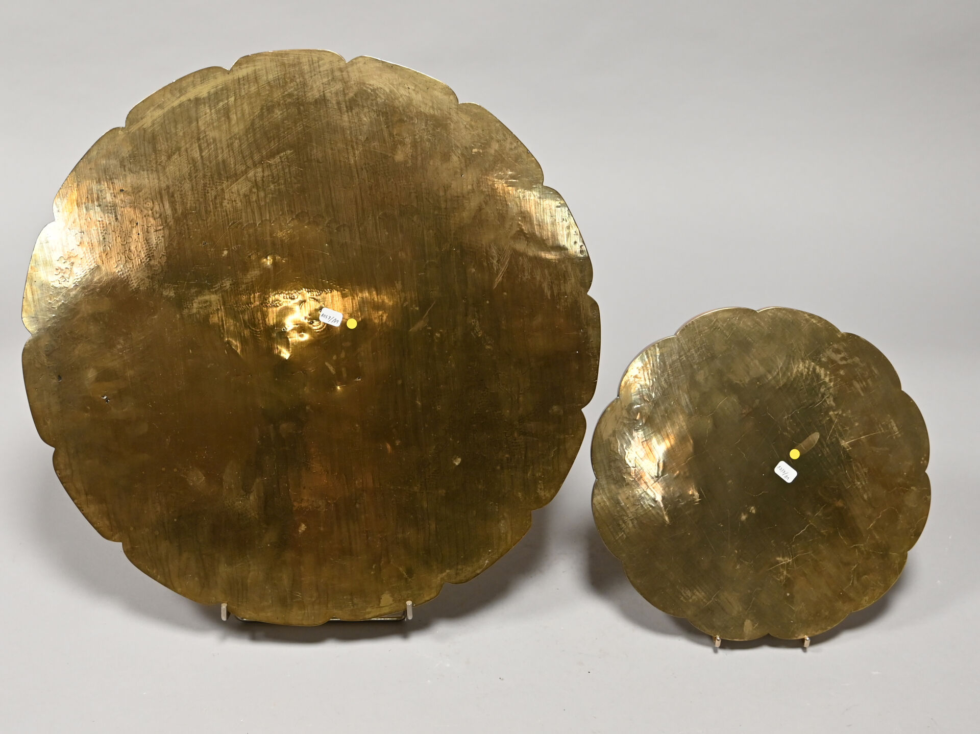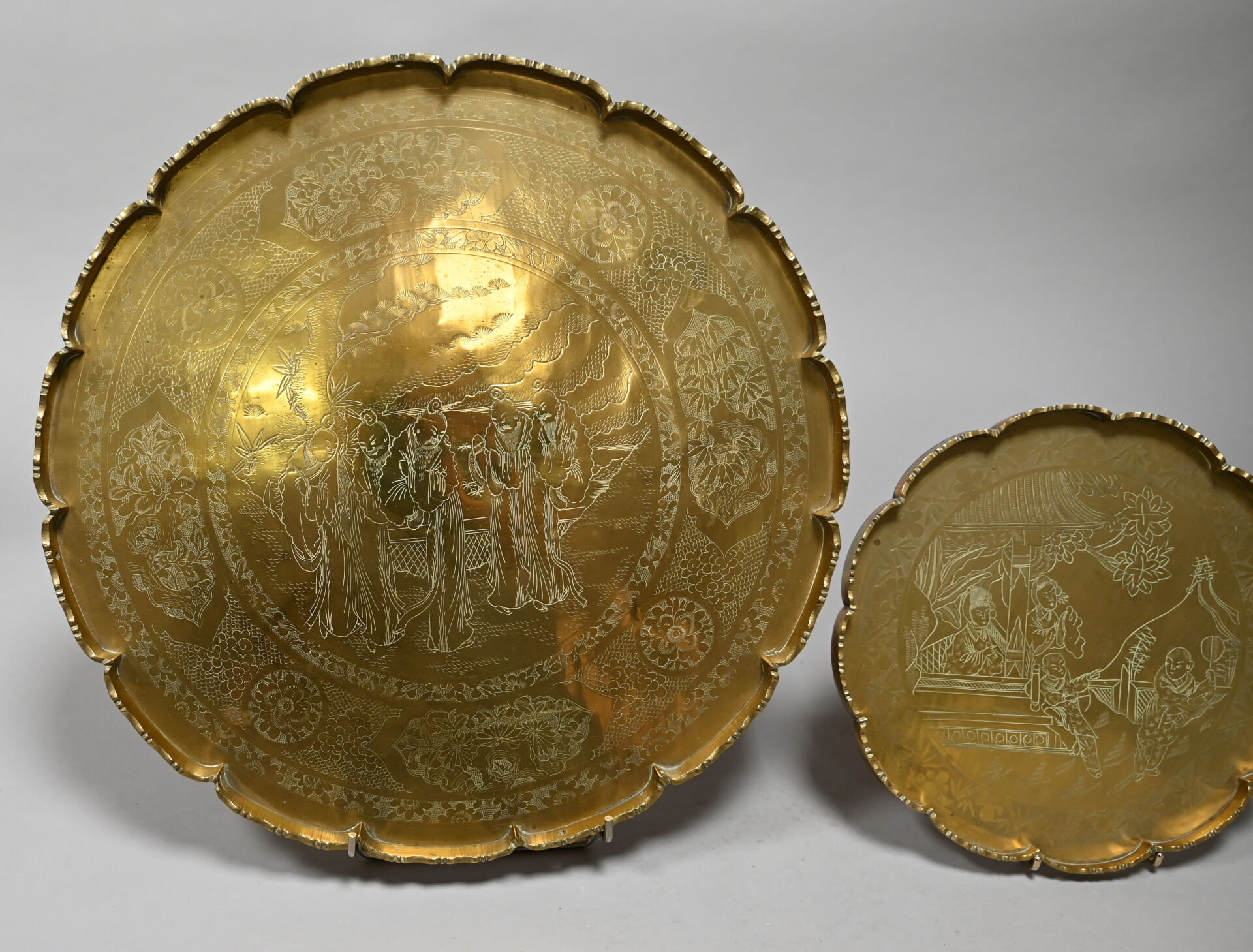 Deux plateaux en laiton à rebords à contours violonés, décor gravé de personnages. Indochine. Diam. du plus grand : 49,5 cm.