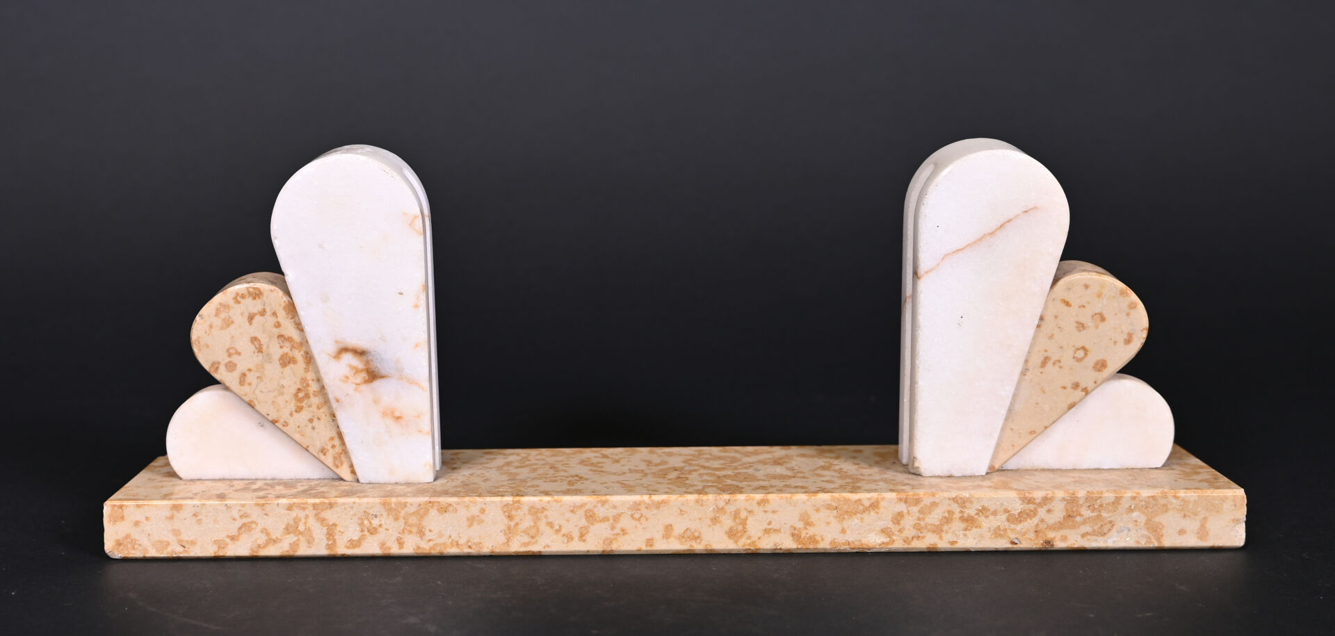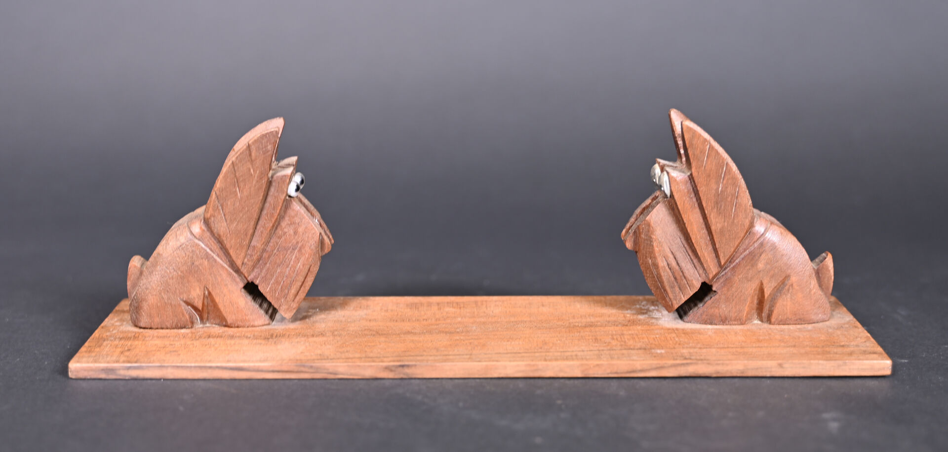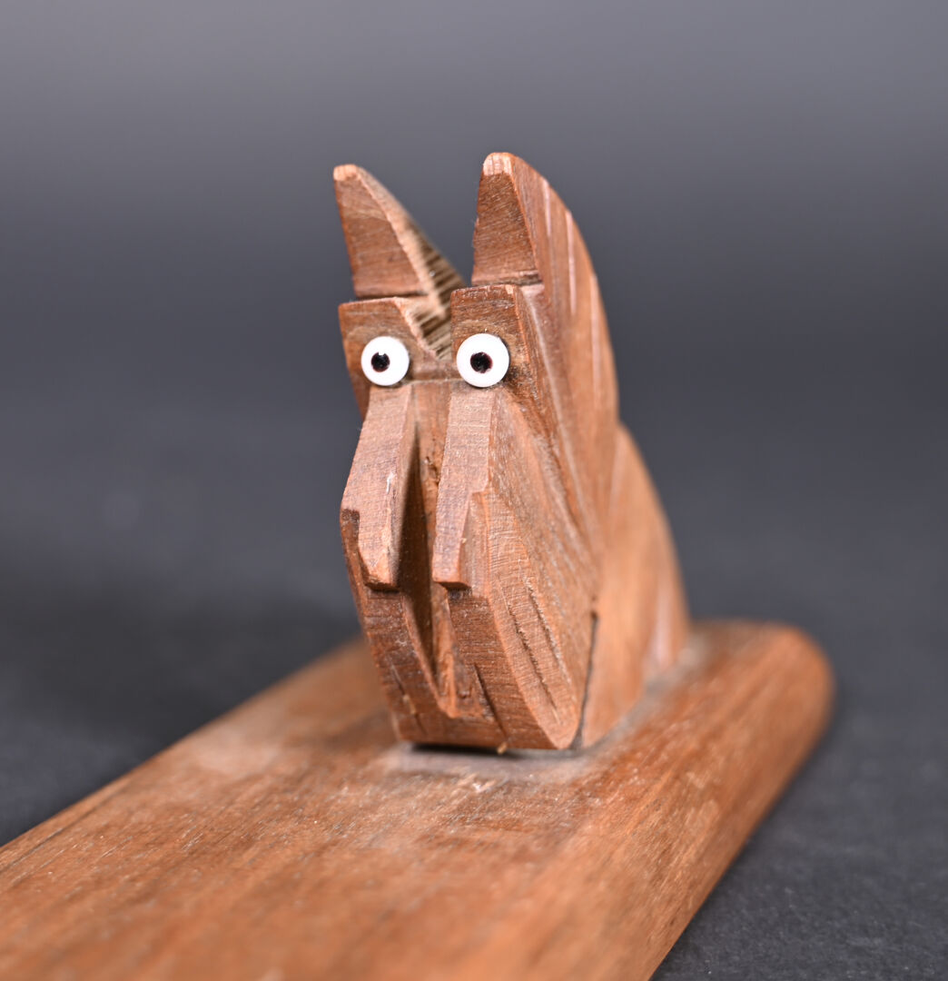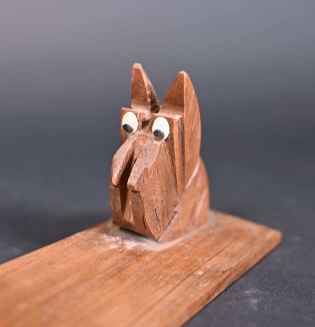 Deux porte-photo ou porte-menus, un en marbre bicolore et l’autre en bois à décor de chiens (une paire d’yeux rapportés). Long. : 37,5 cm et Long. : 29 cm.