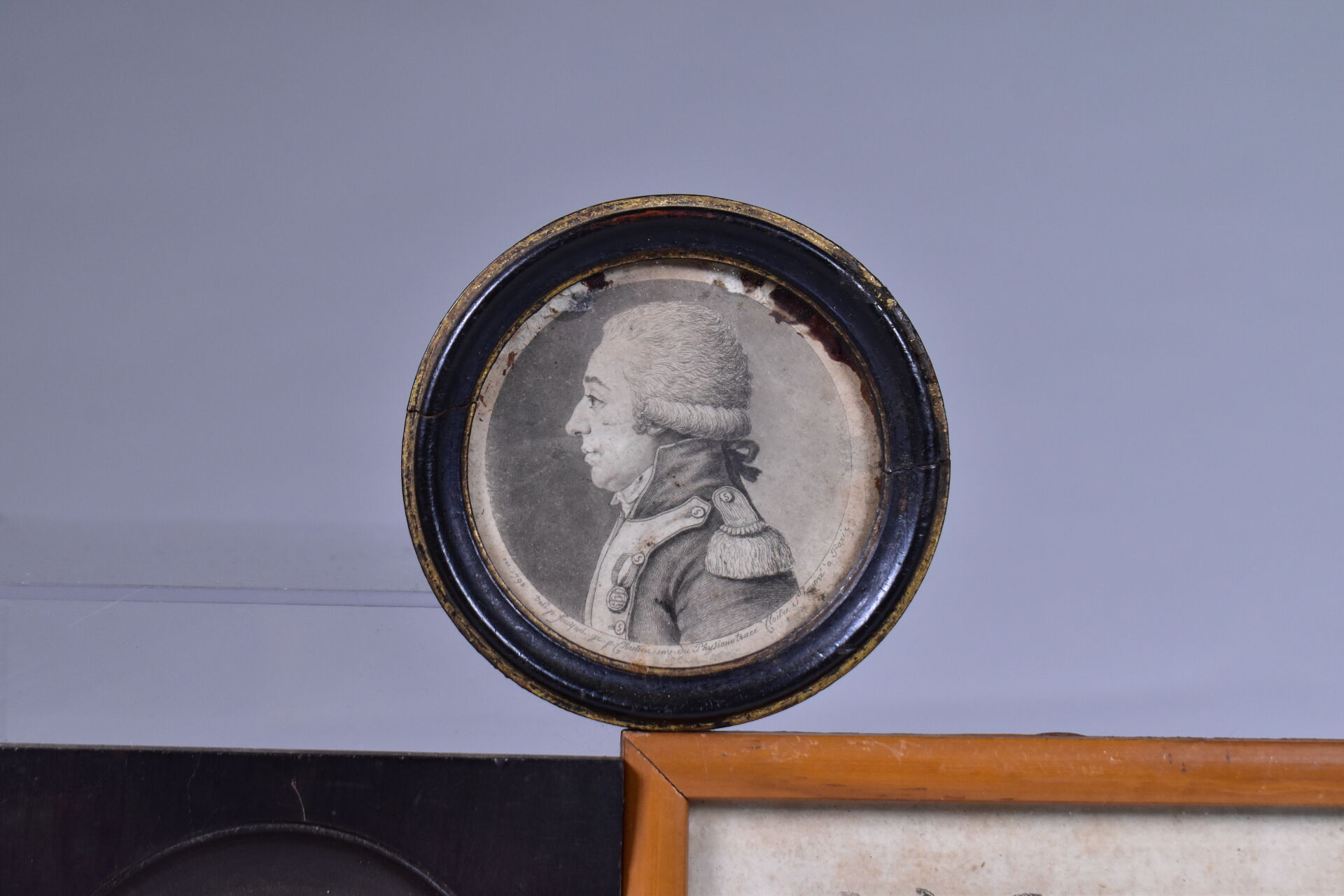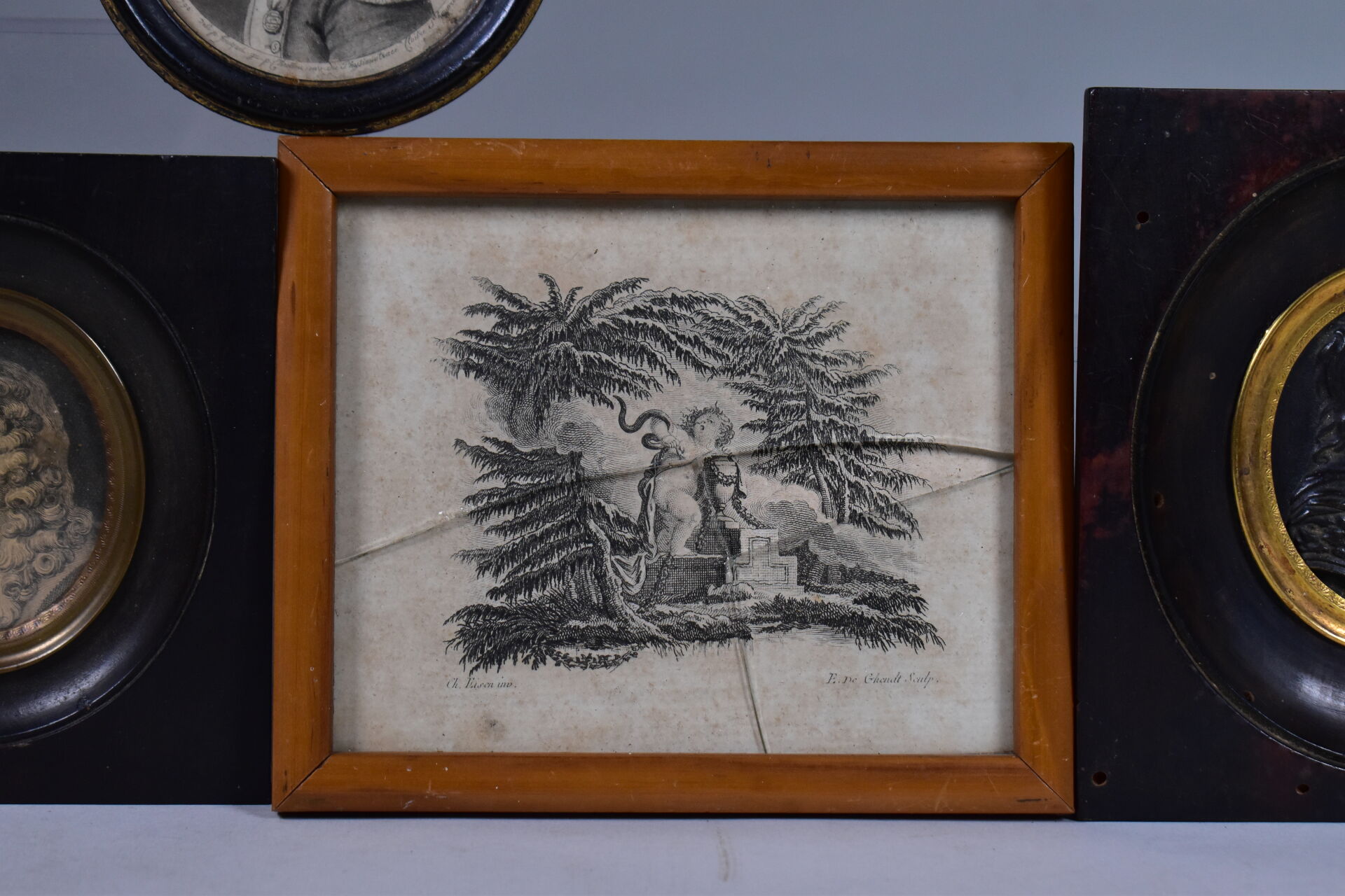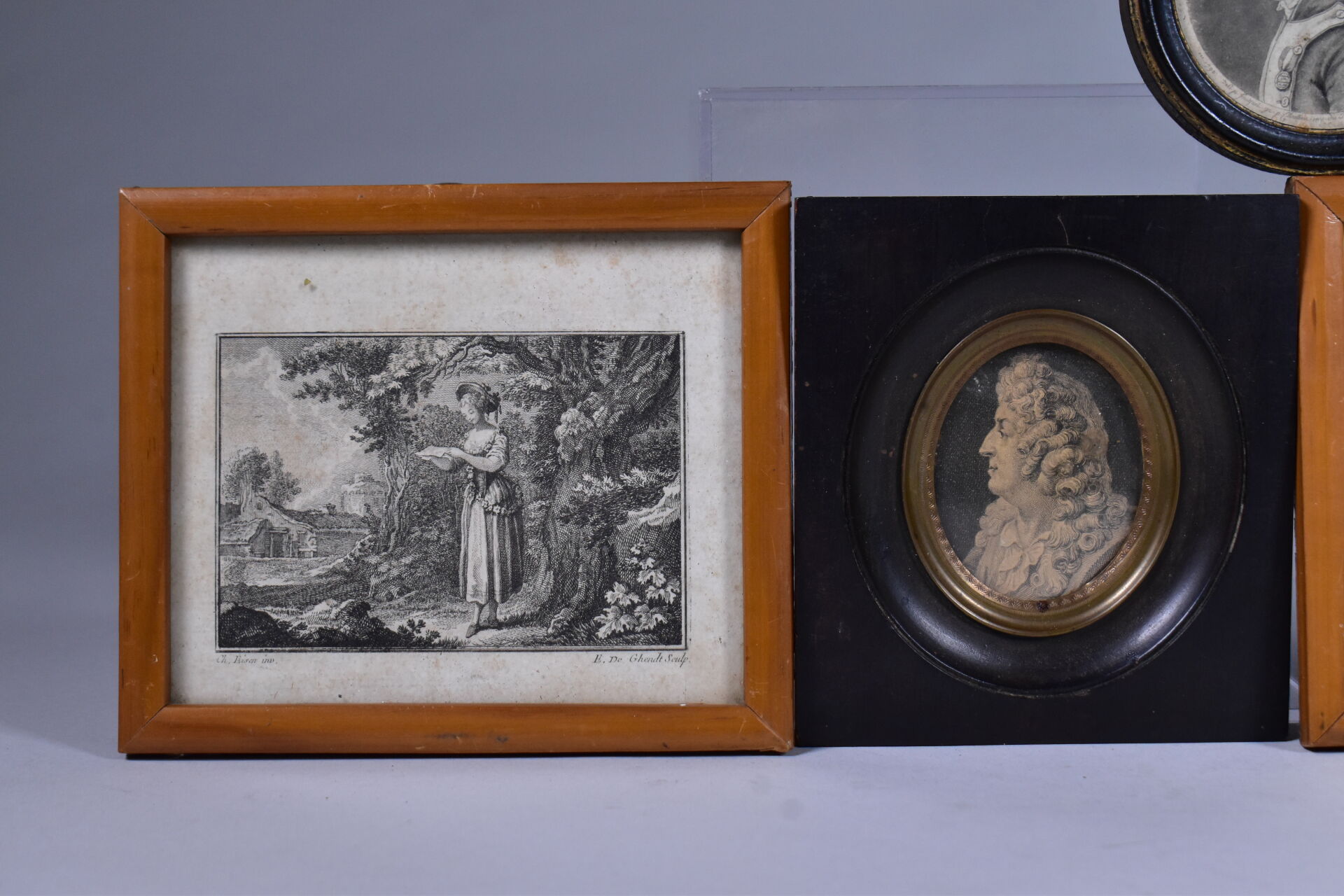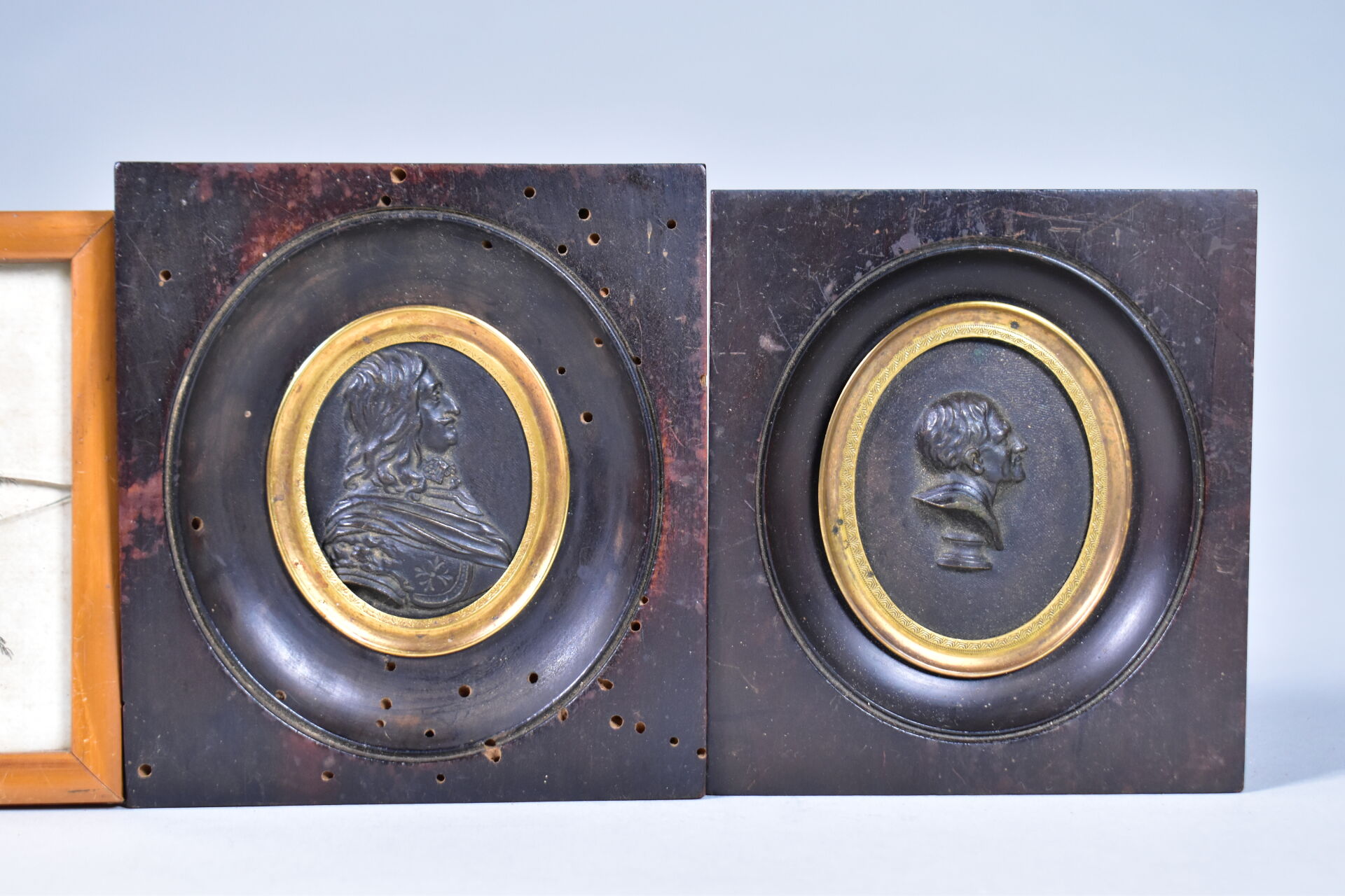 Deux profils en bronze à vue ovale, l’un représentant le Chevalier de VENDÔME et l’autre un buste probablement de philosophe (un à refixer dans son cadre. 6 x 5 cm et 4 x 6 cm (hors cadre). Cadres en bois. On joint une suite de 4 gravures encadrées, deux à la façon de miniatures (un verre accidenté).