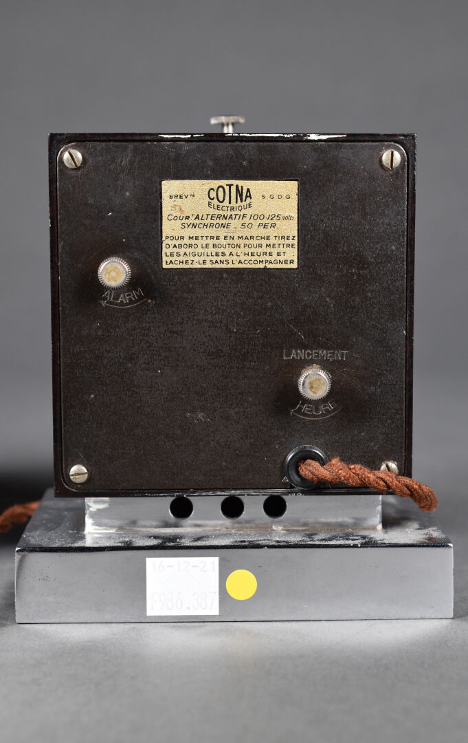 Deux réveils soit un COTNA en métal et bakélite brun et un autre en métal gris Rythm. Haut. : 14,5 cm.
