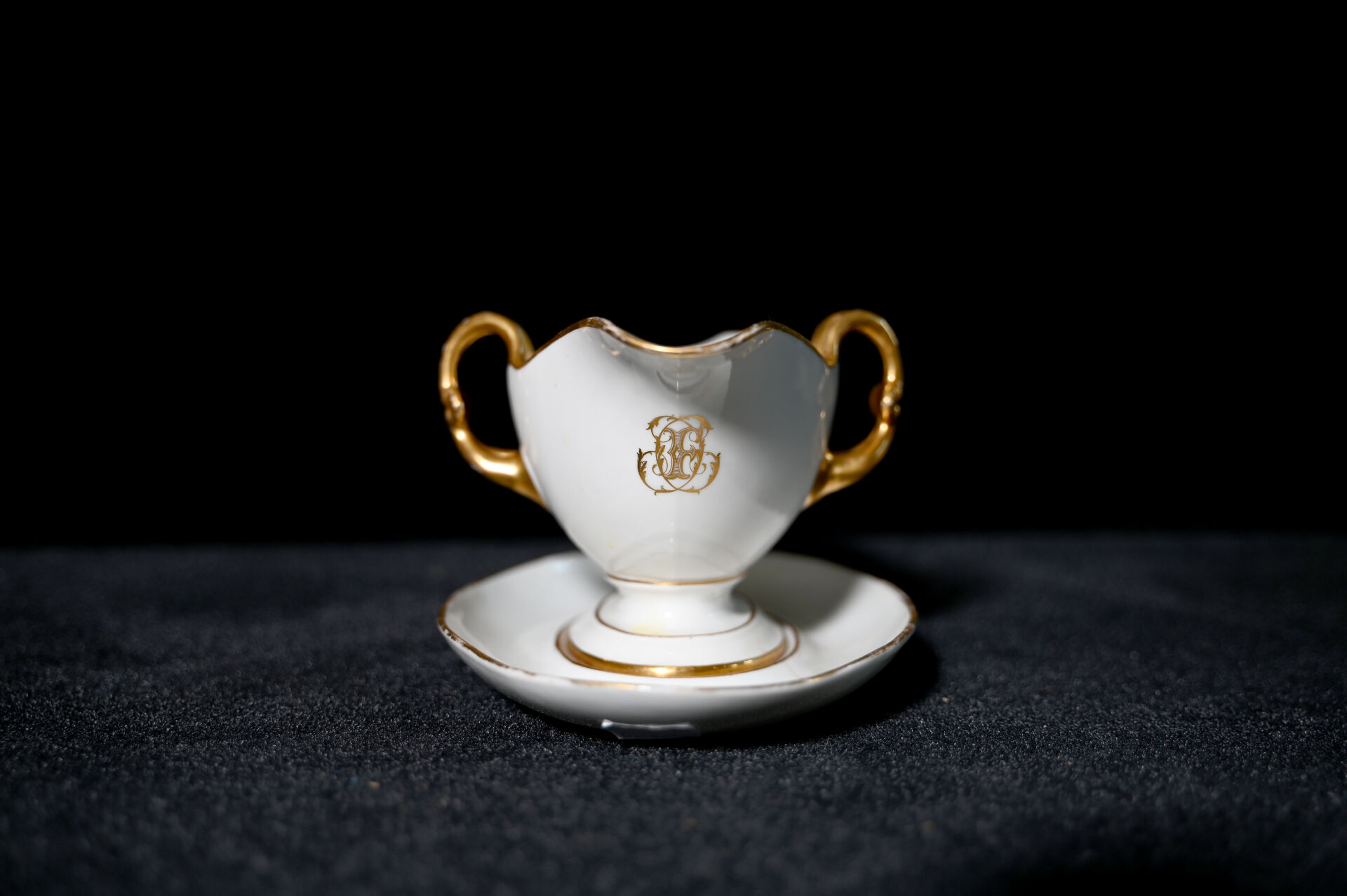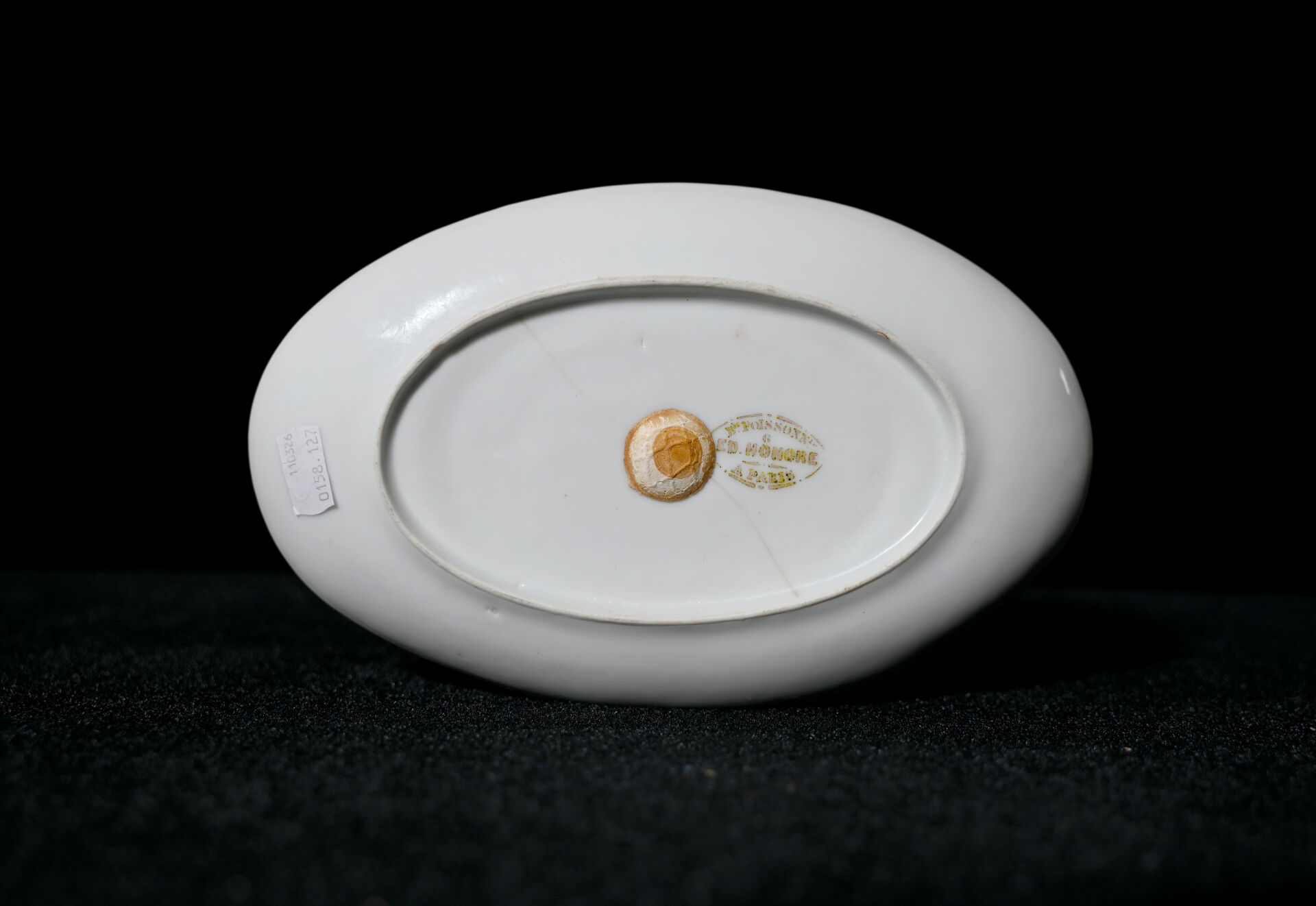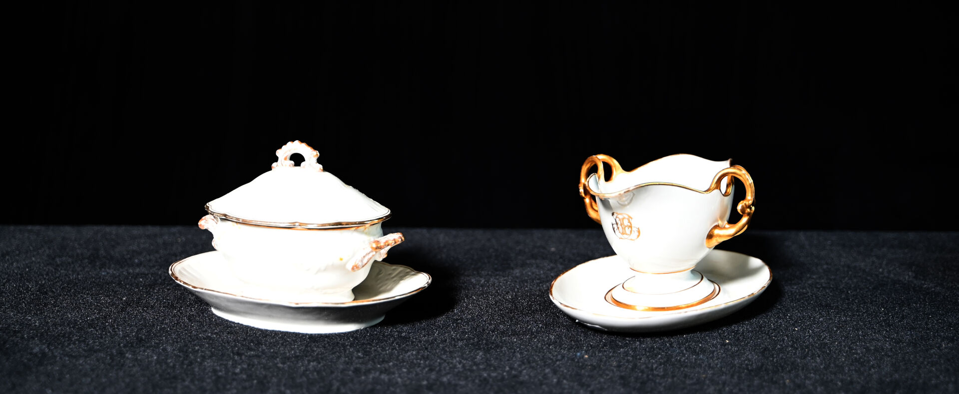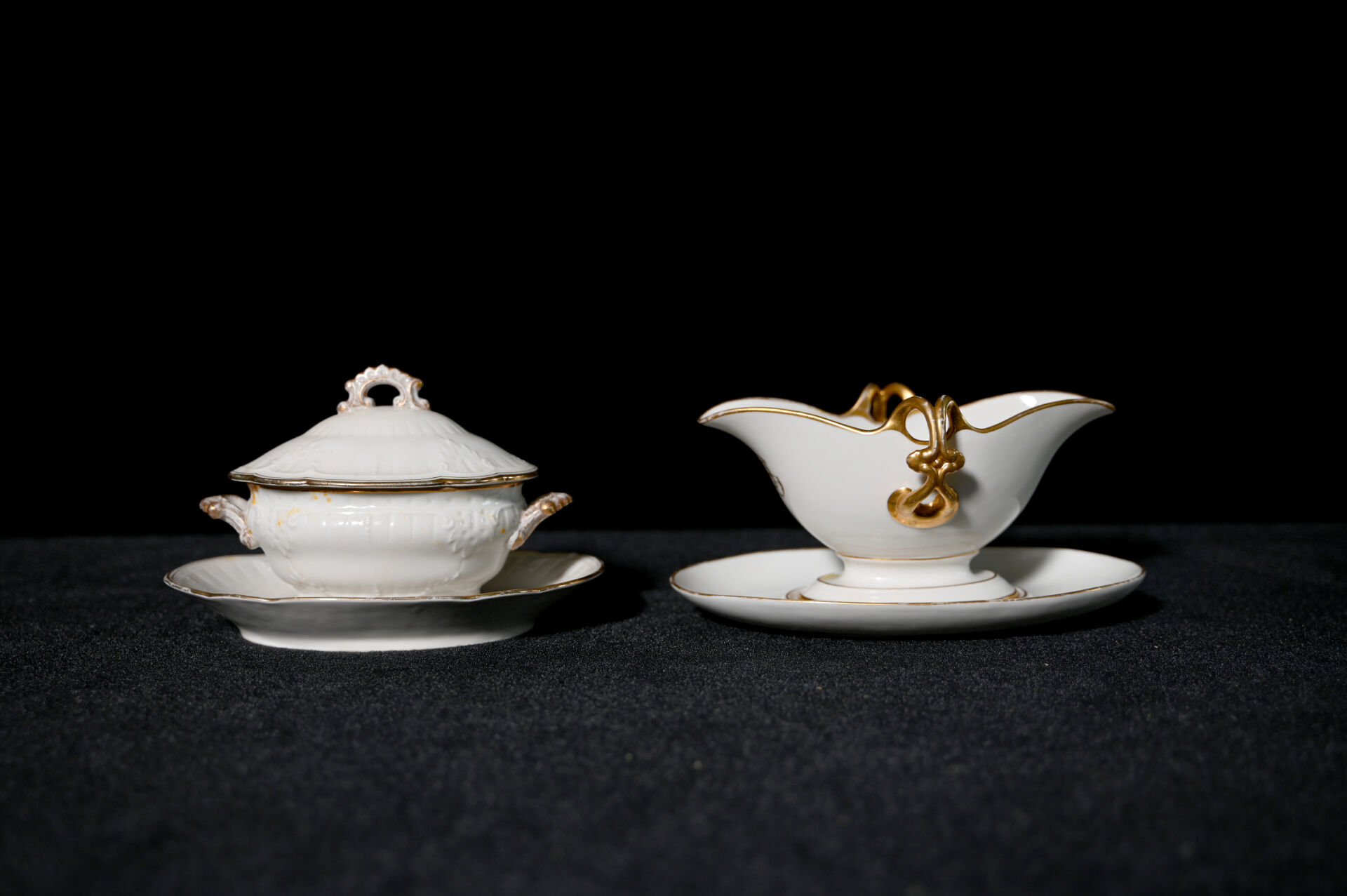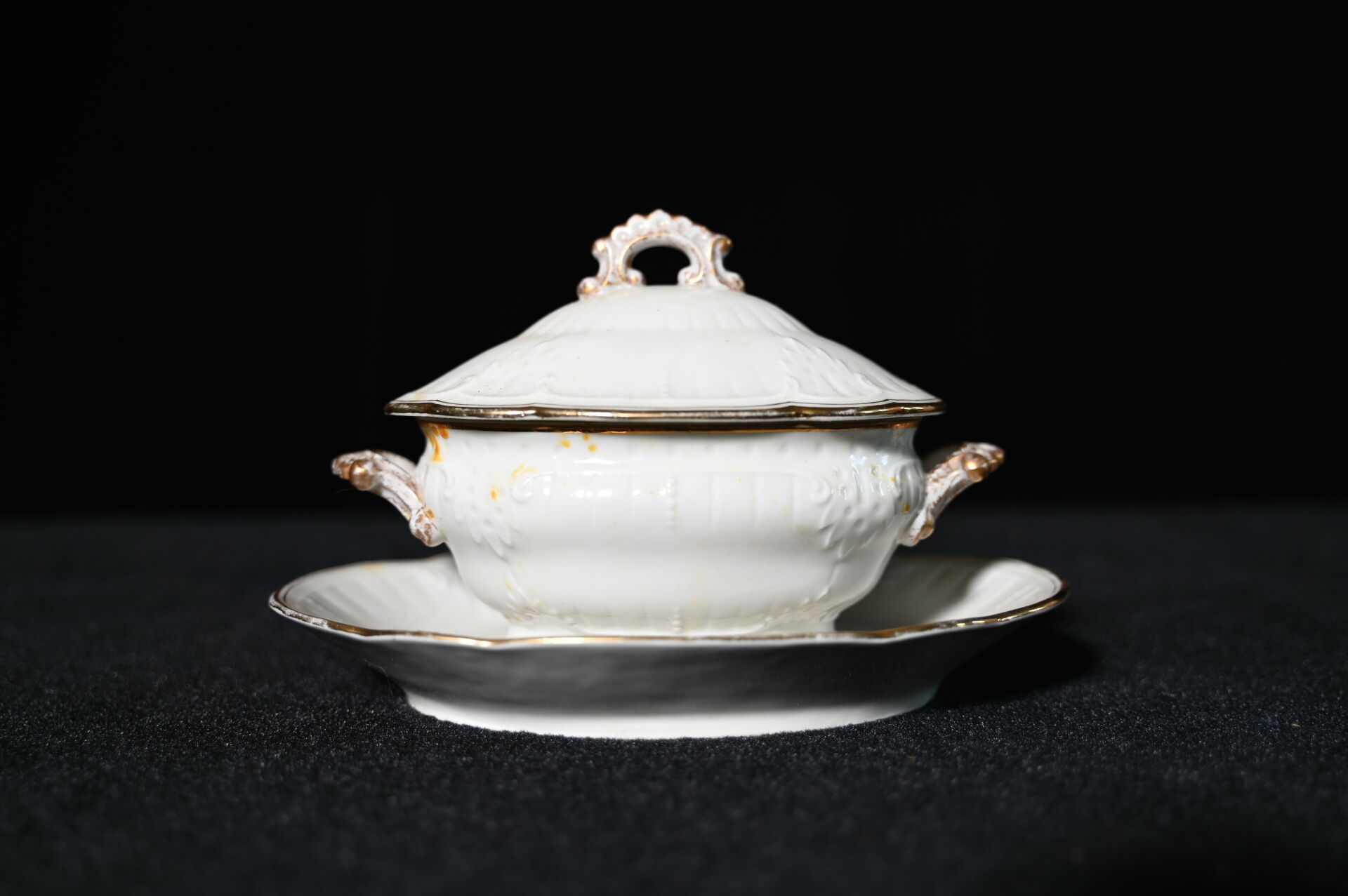 Deux saucières dont une couverte, en porcelaine blanche à liseré or, une chiffrée (usures).